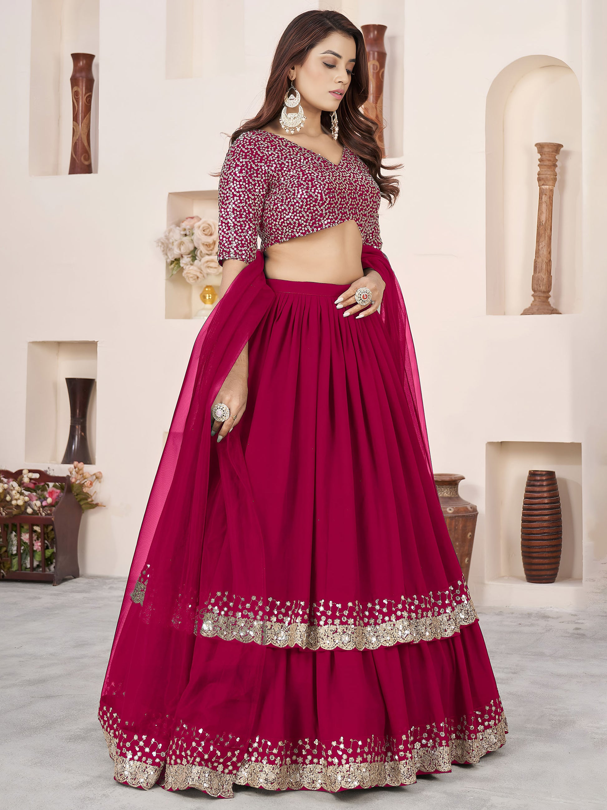 Pink Faux Georgette Sequins Work Wedding Guest Lehenga