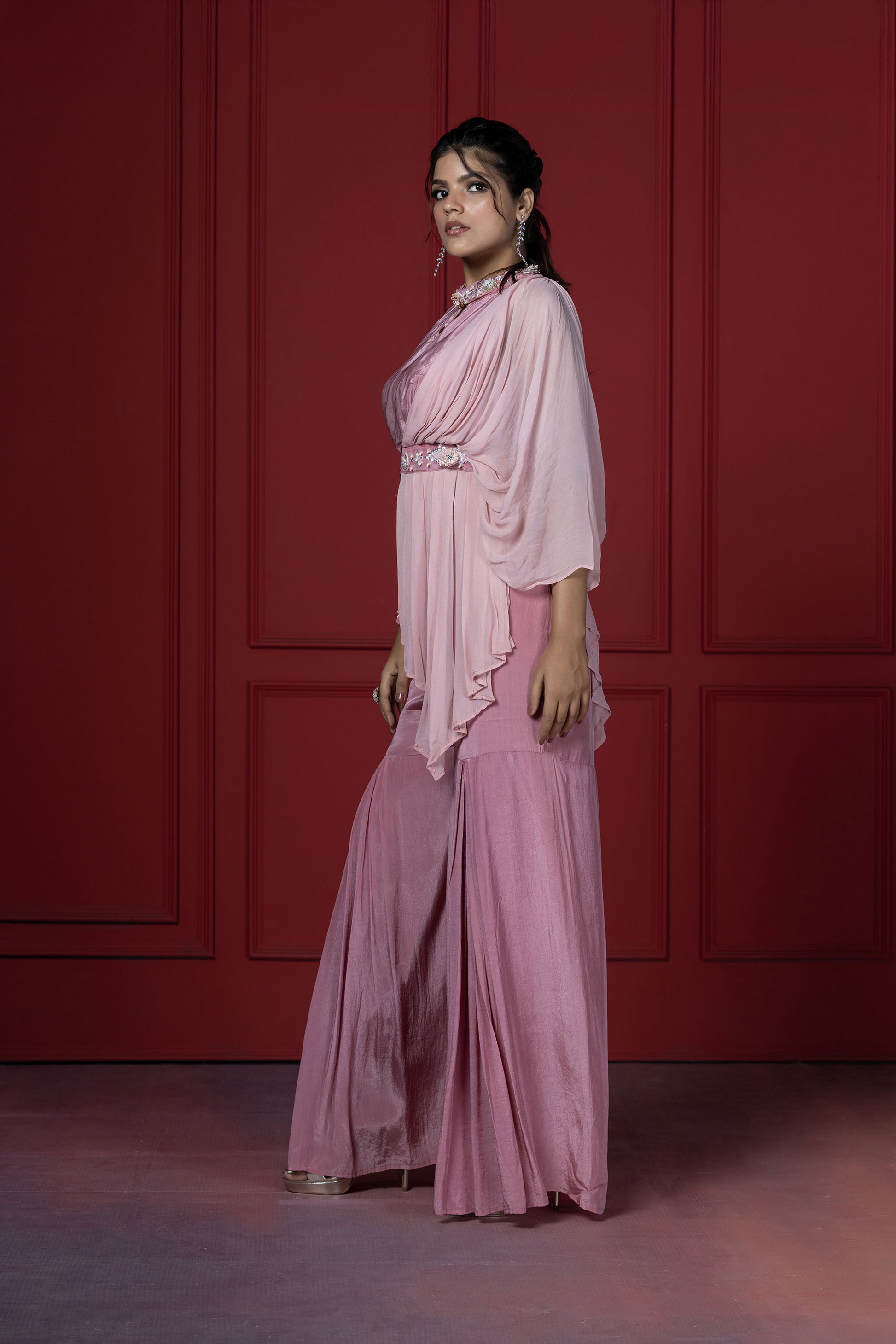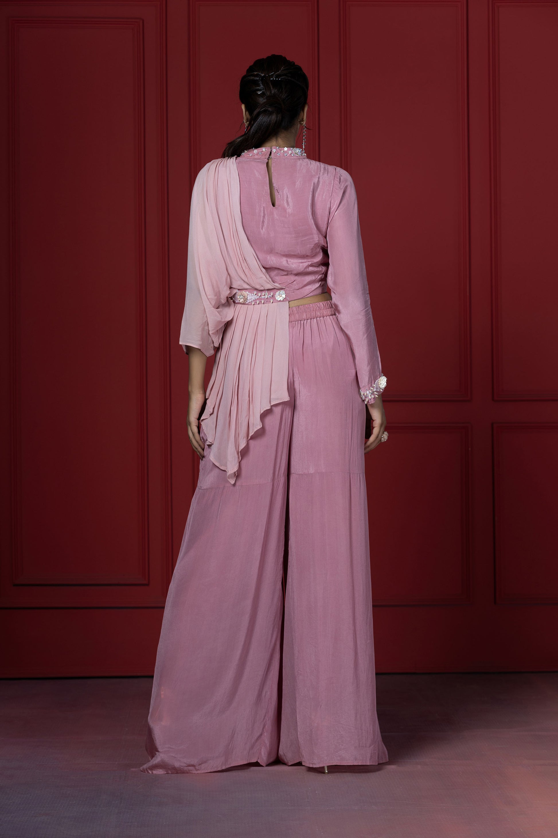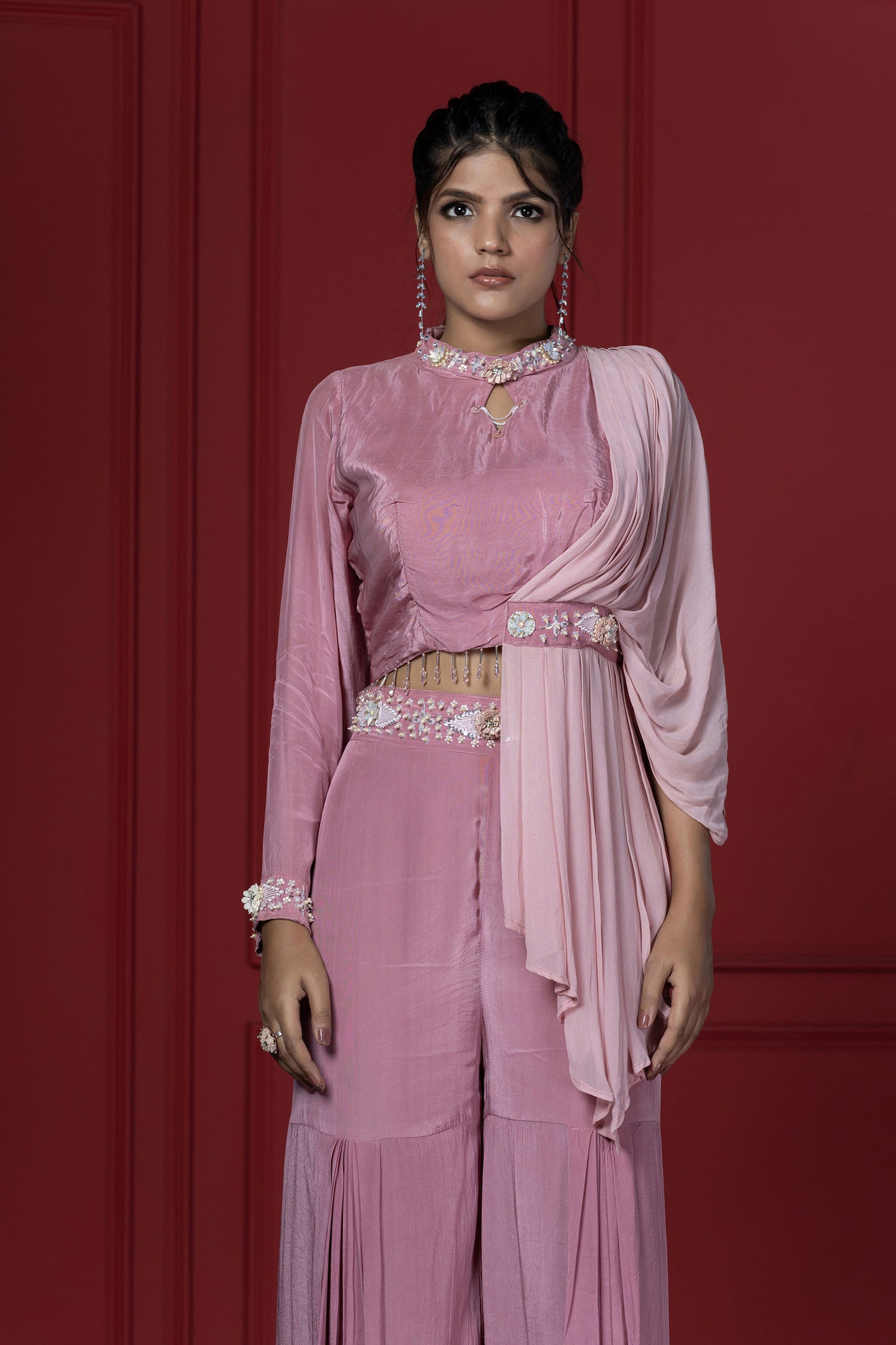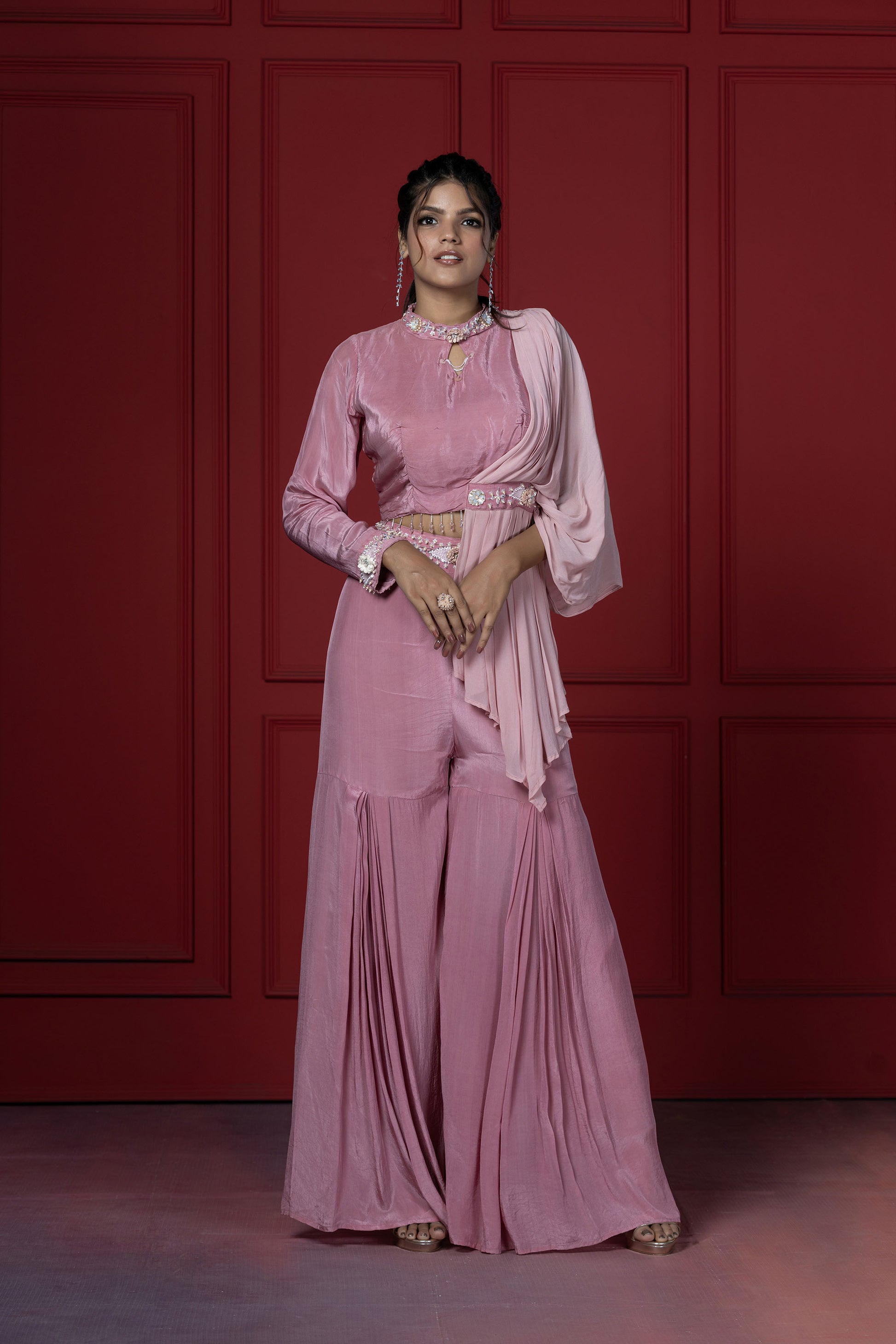 With drape pattern on the left shoulder, this set is exclusive because of its work on collar, cuffs and waist band. To complete the set, the pants are kept minimal.