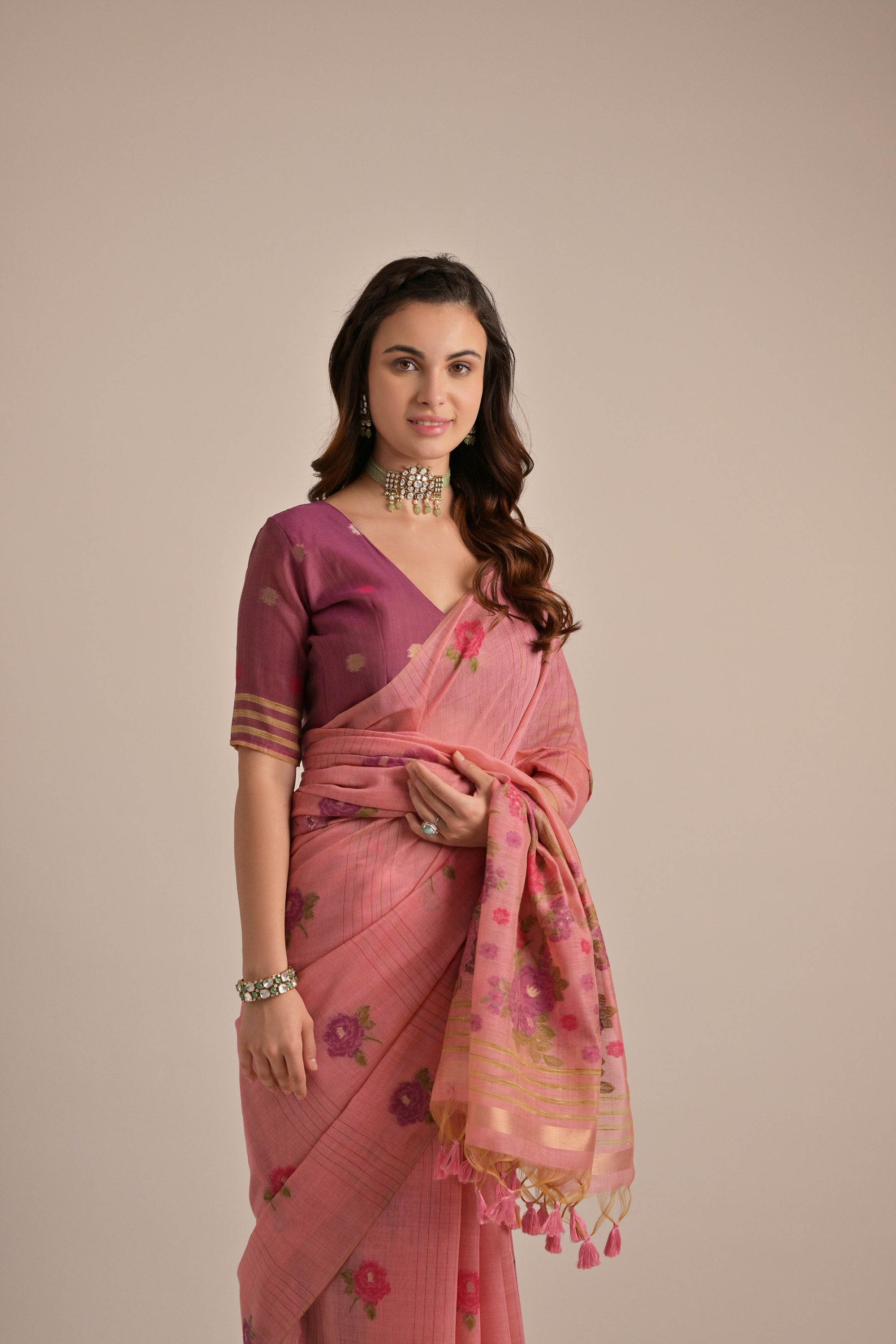 - Dhoti style drape: Opt for exquisite aesthetics by draping a linen Banarasi saree in dhoti style during a cocktail party.