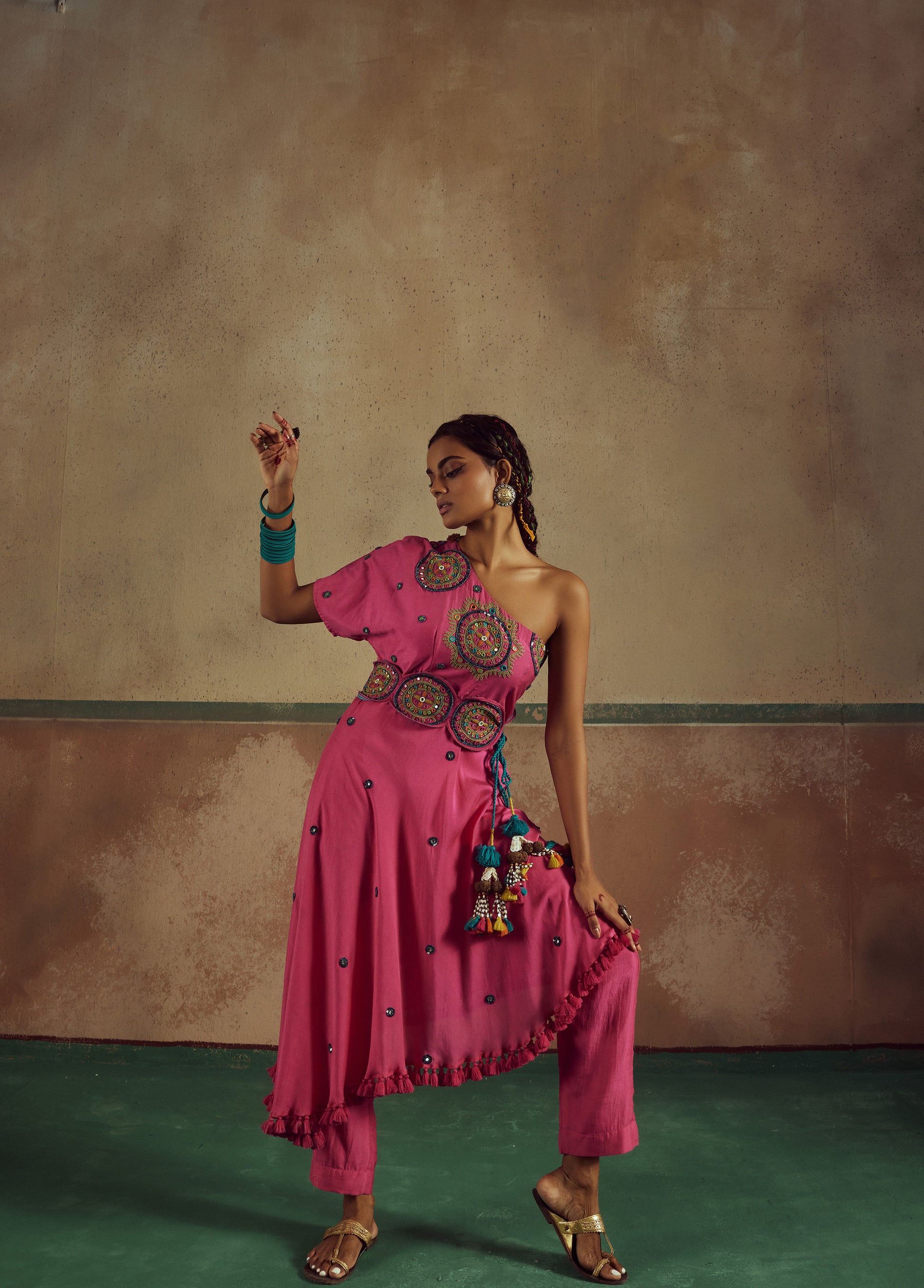 featuring pink one shoulder circle thread & mirror embroidery kurta set where the hem is asyemmtrical adorned with tassels. The kurta's look has been completed with a stunning heavy embroidered belt for a statement. The look has been paired up with pants.