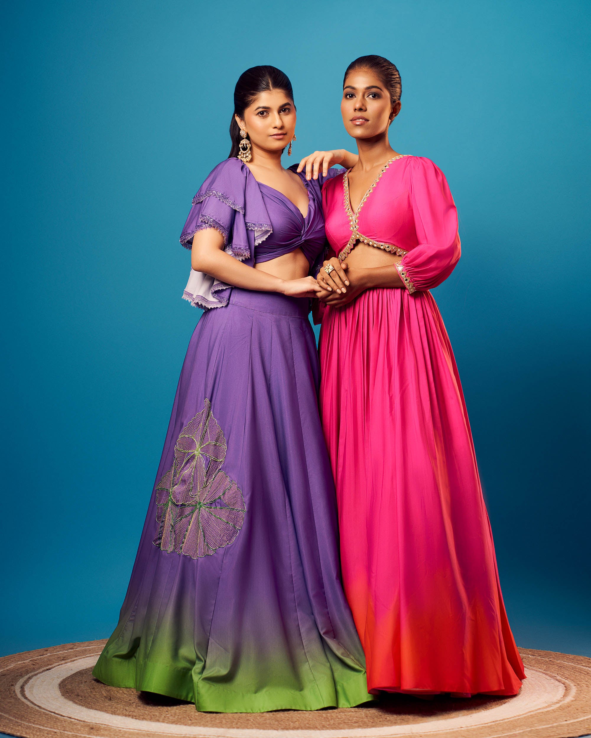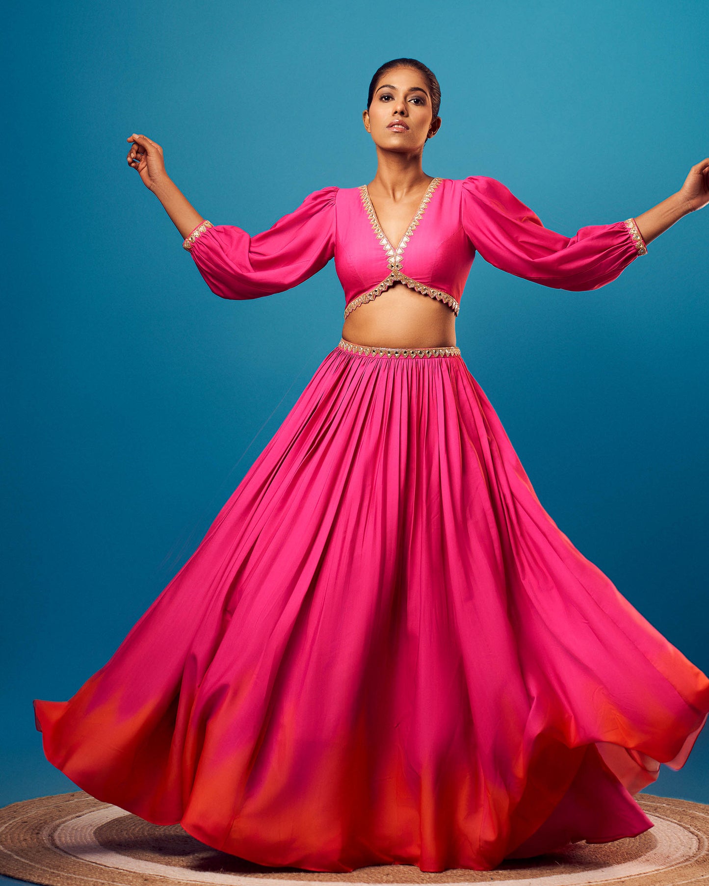 Pink mirror-work balloon sleeves blouse with matching embroidered shaded pink-orange skirt with cancan.