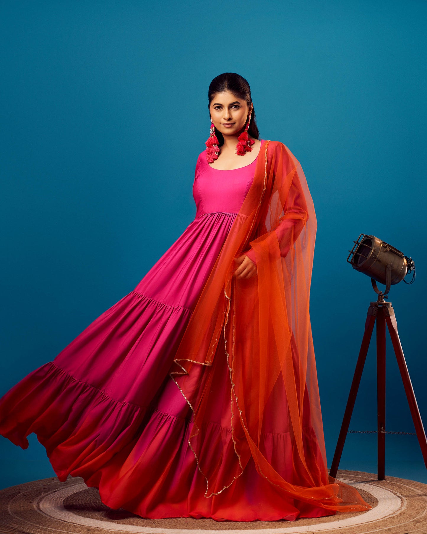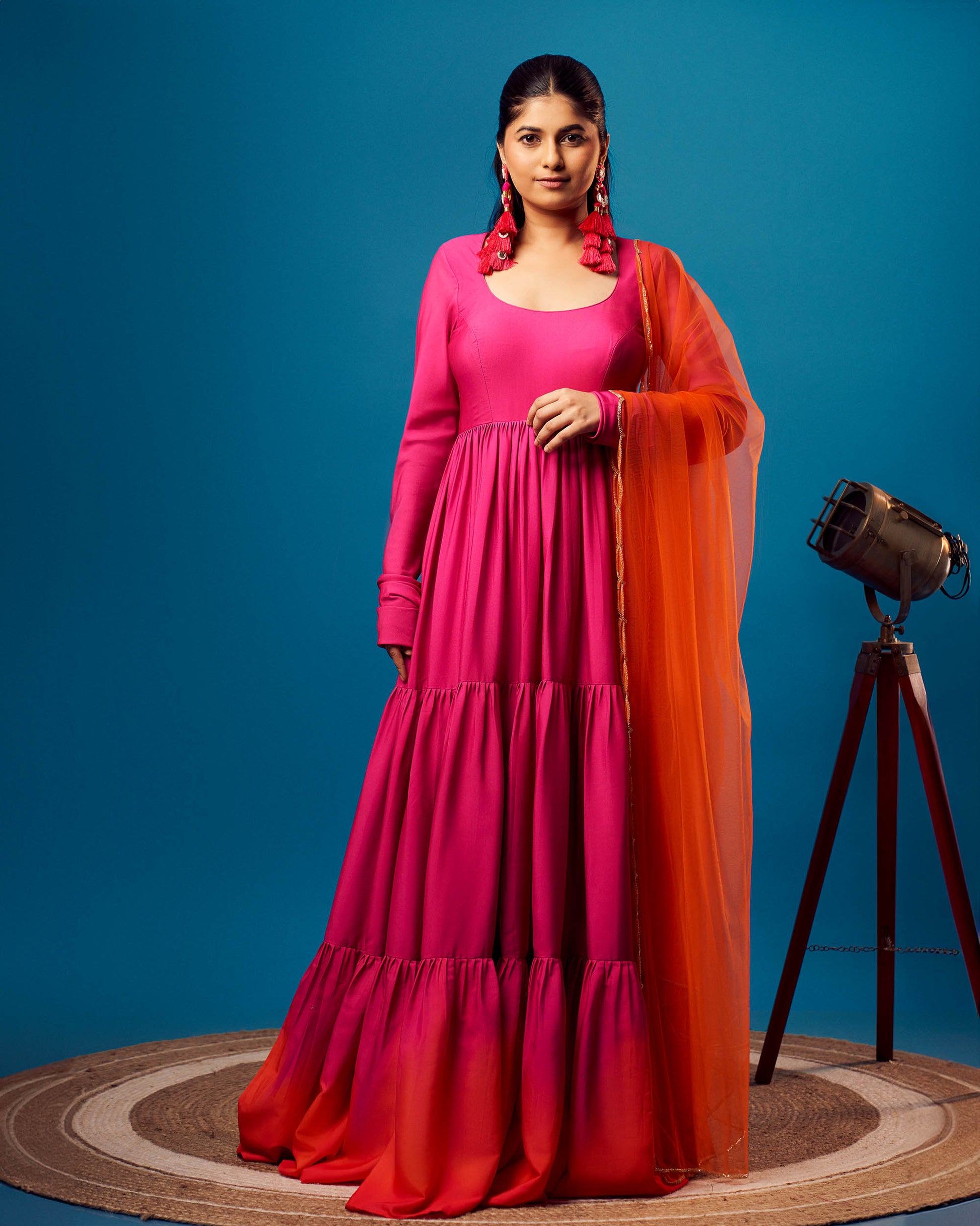 Pink-Orange Ombre tiered anarkali with orange scallop embroidered net dupatta.