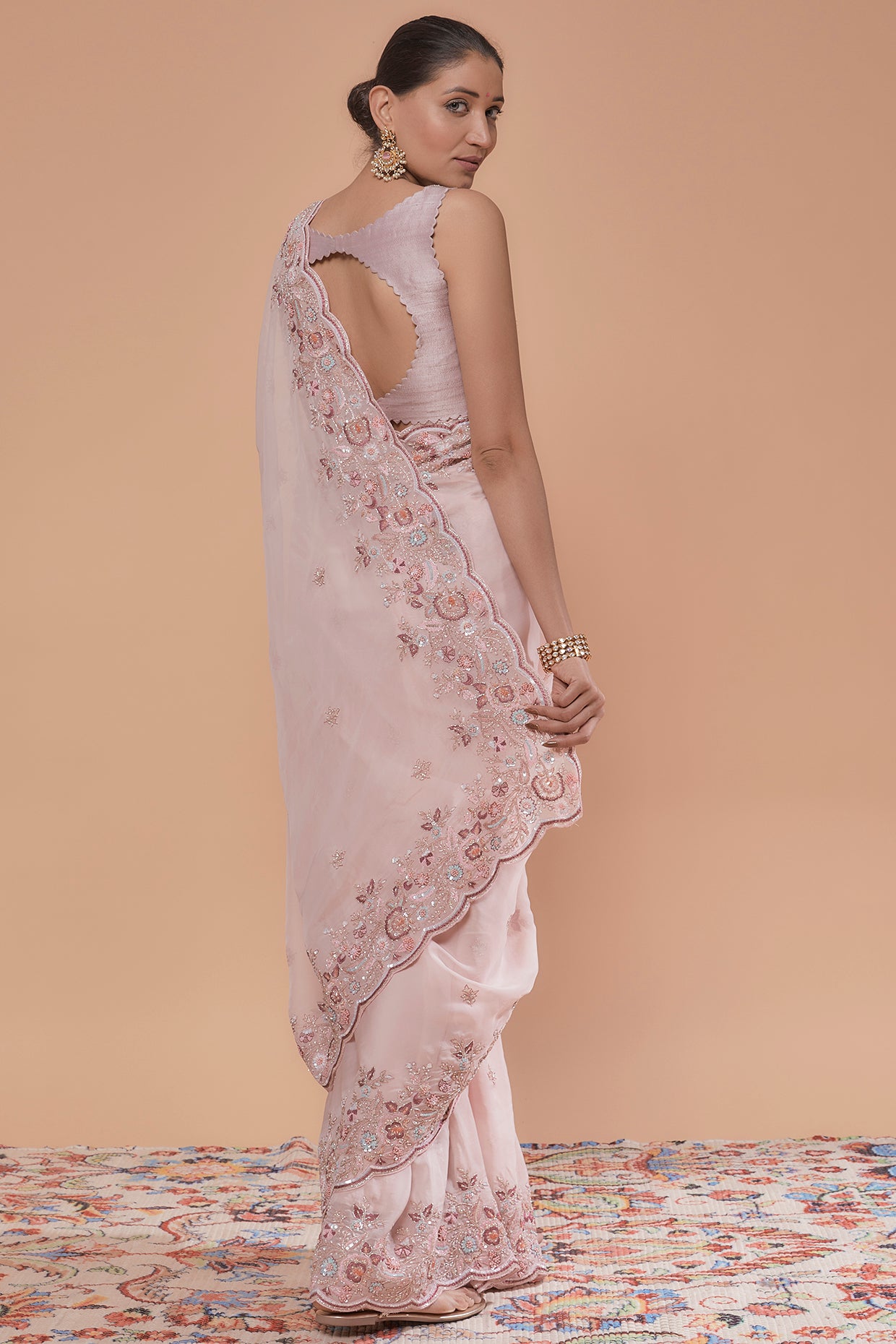 Featuring A Pink Saree In Organza Base With Hand Embroidery. It Is Paired With A Matching Unstitched Blouse Piece.