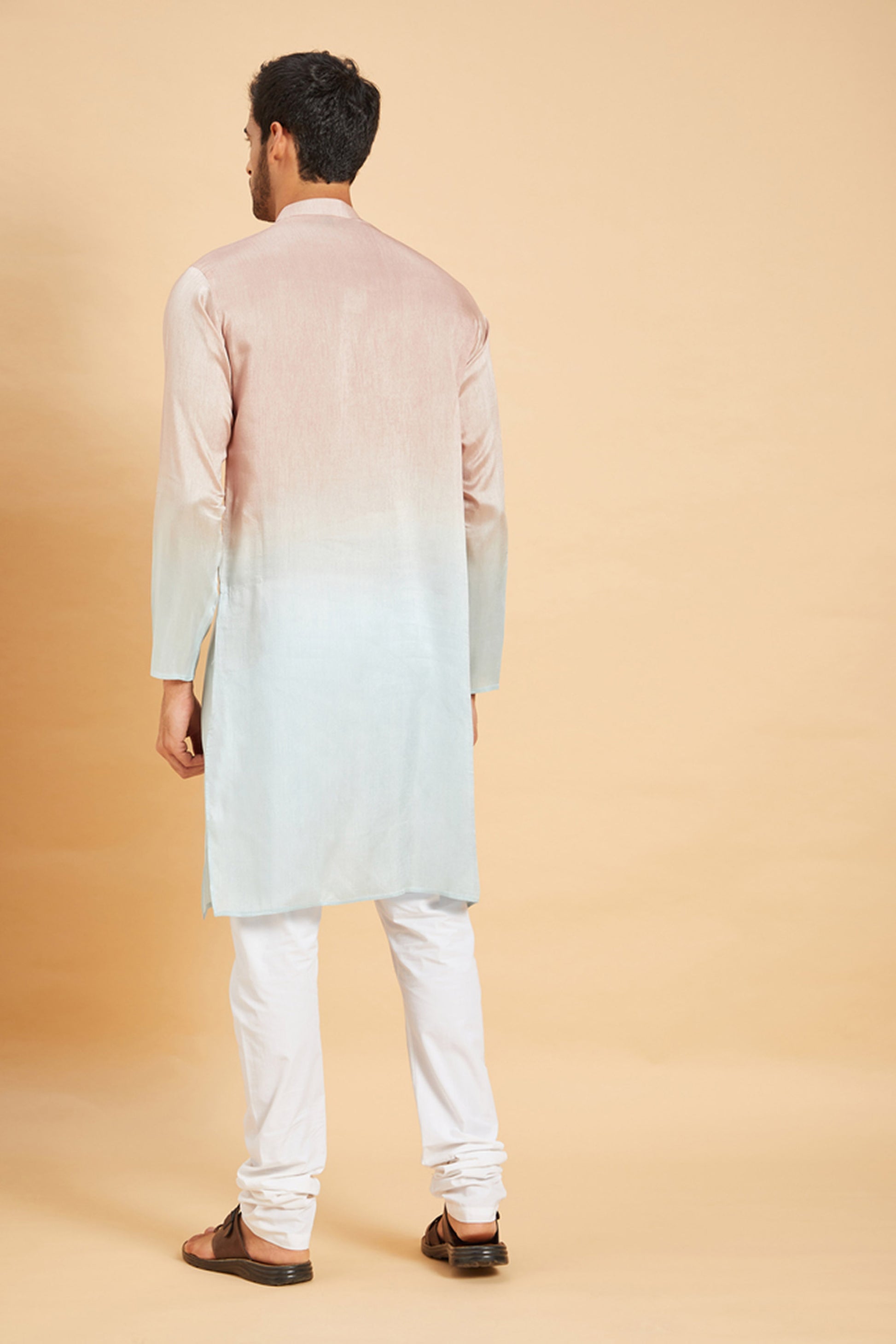 This piece is crafted from falling raw silk, Featuring an ombre effect that seamlessly blends pink and a soft pastel teal. The pleasing color combination creates a sophisticated and decent look. To complete the ensemble, pair this kurta with white or light pink pants or trousers.