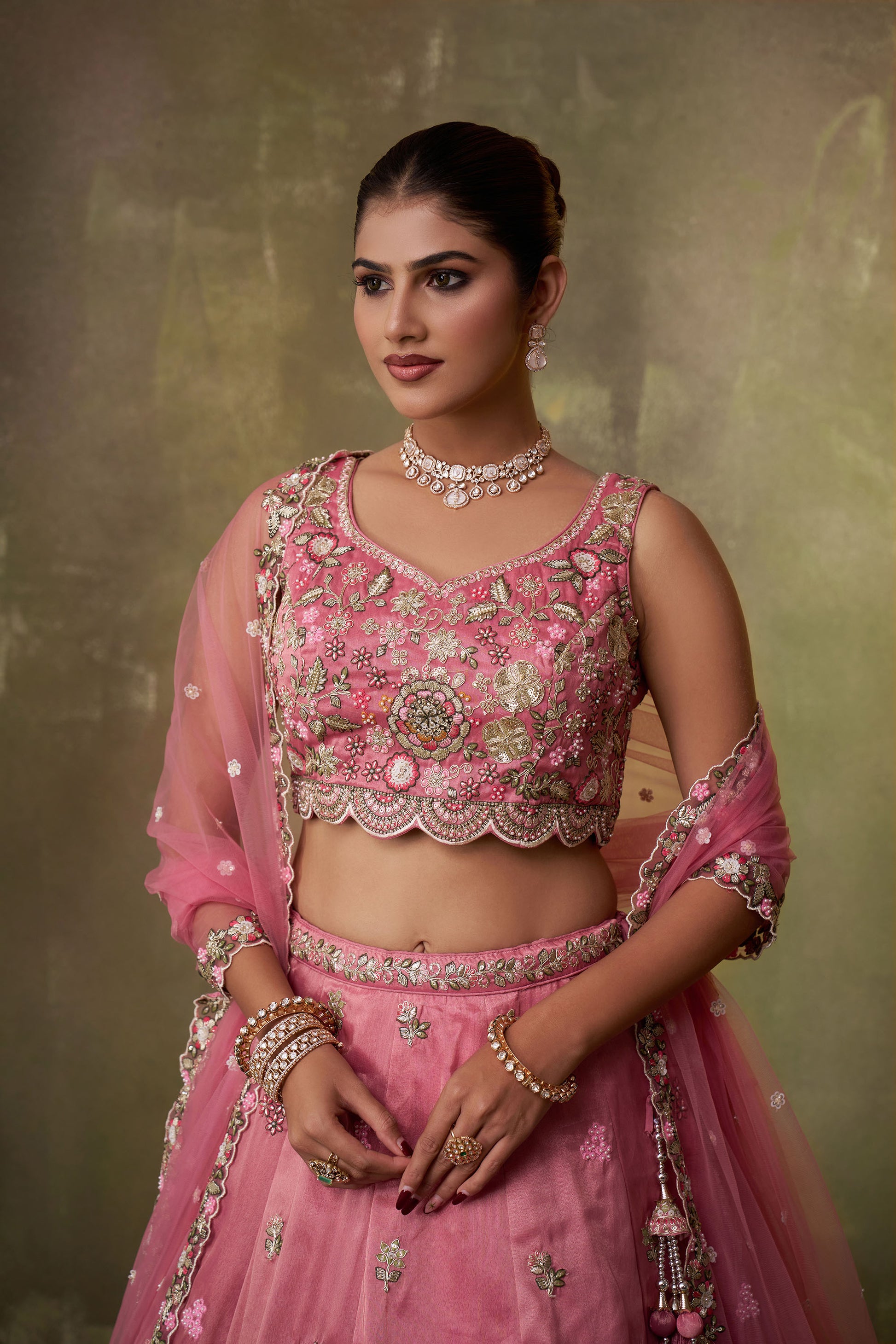 Pink Tissue Sequins & Thread Embroidery Sangeet Lehenga