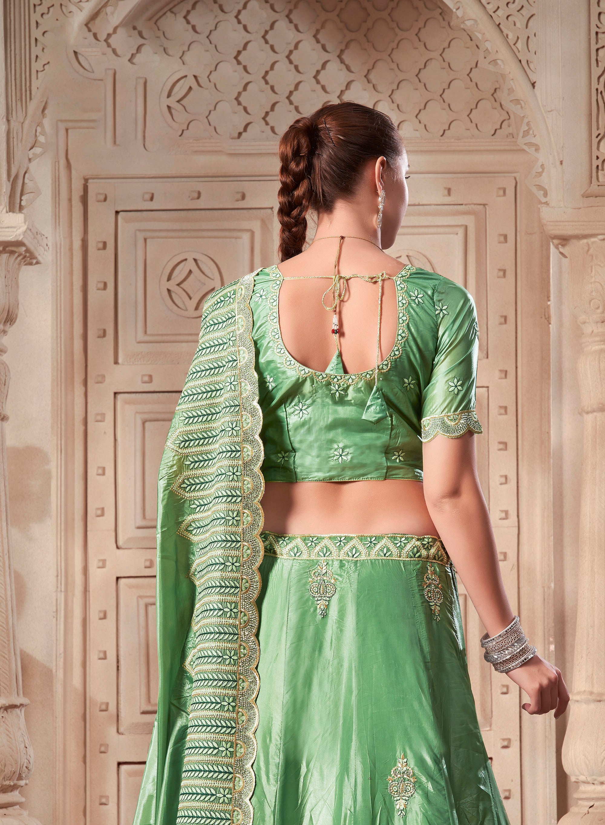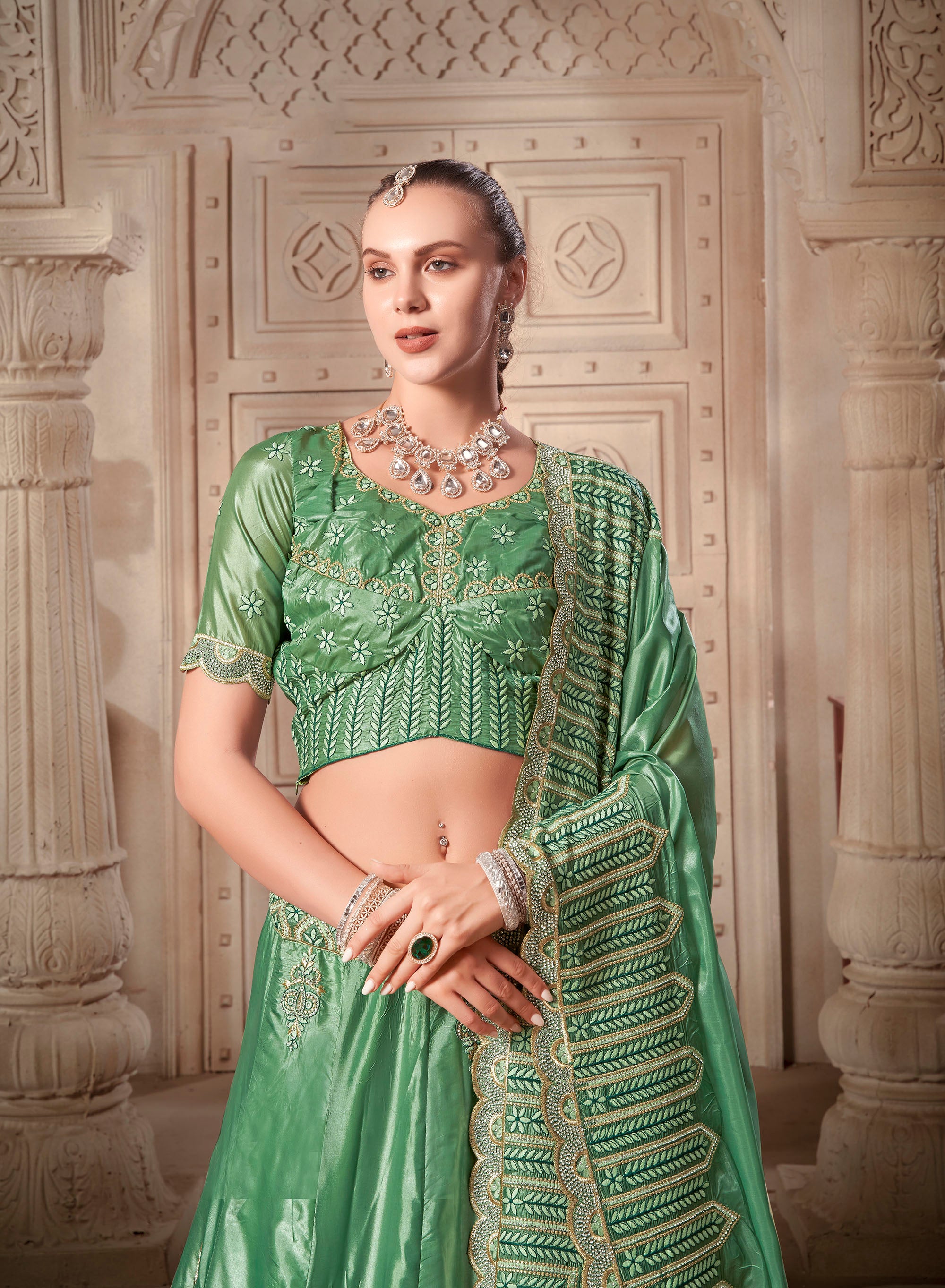 Pista Green Zarkan Embroidery Soft Paper Silk Mehendi Lehenga