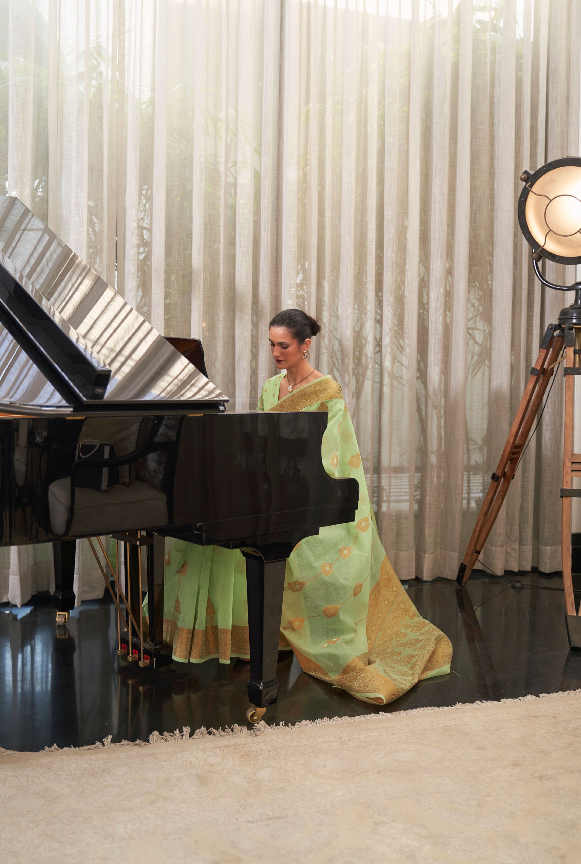 Does your wardrobe need more versatility? Then, check out this. Let your skin feel the refreshing touch as you adorn this superior-quality lightweight Saree to match the overall modest design.