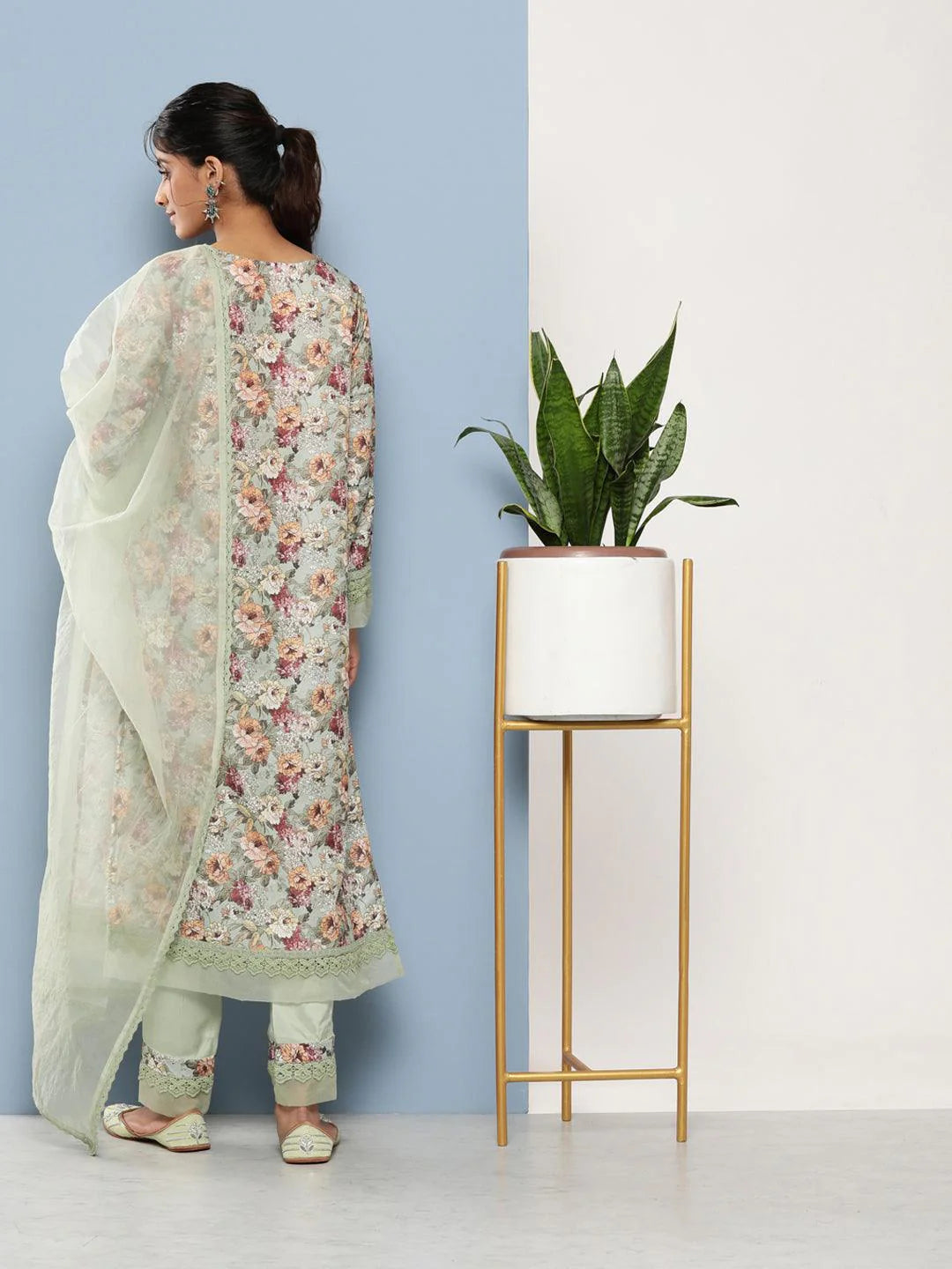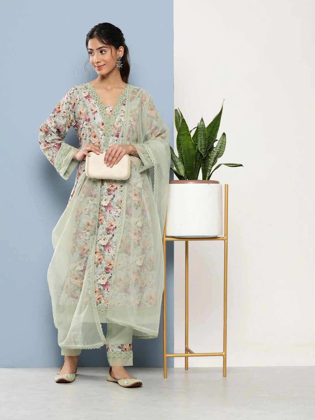 Feel the freshness in this summer with this Poly Green Chanderi Floral Printed Kurta Pant Set with Organza Dupatta this Three piece set Floral print Straight style kurta with Shantoon pant. it looks gorgeous for that exclusive look or just go simple and stunning, keeping the look as it is.