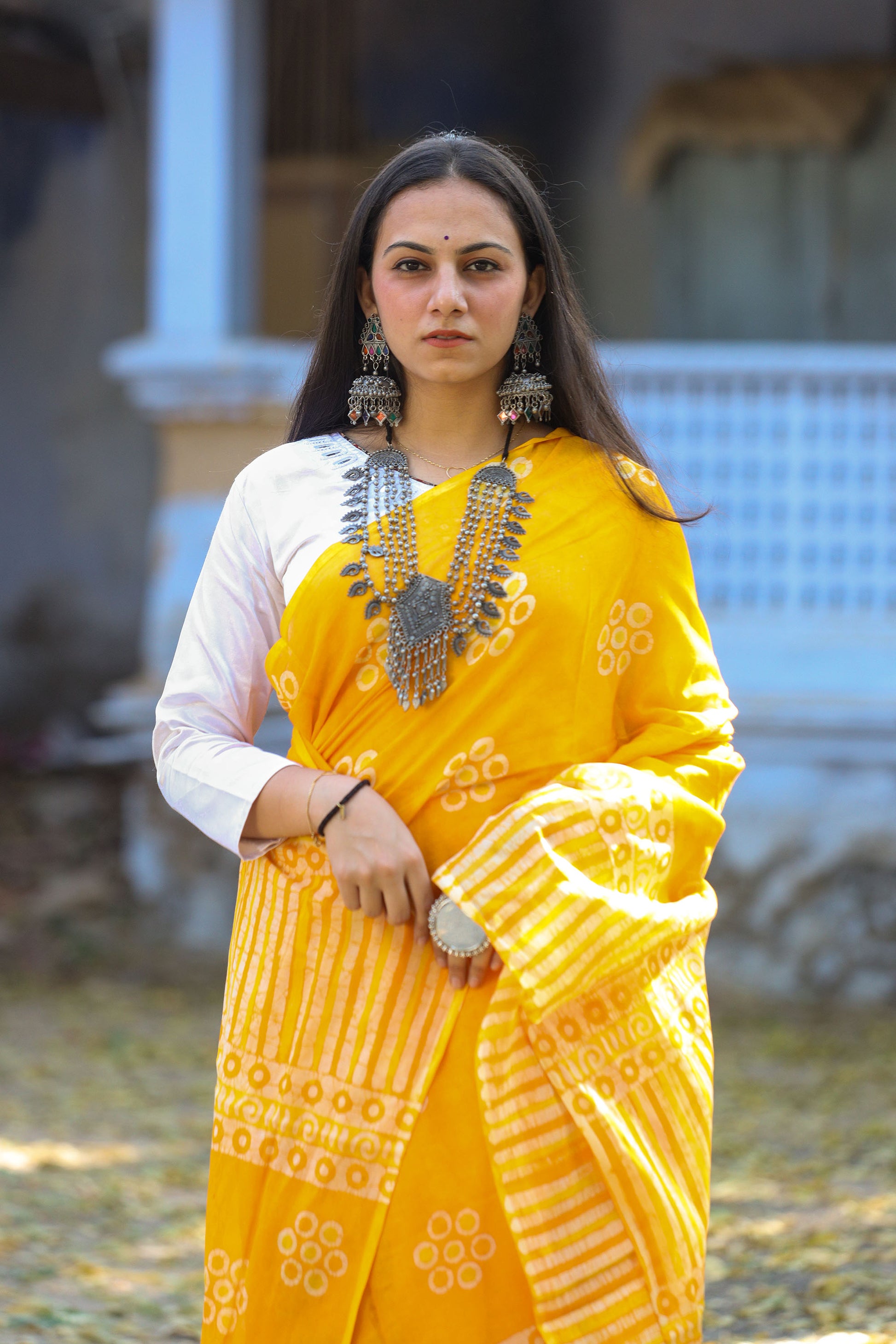 This muslin khadi sari is a combination of art, culture and luxury. The intricate patterns and hand block printing create a fashion statement that is perfect for any occasion.