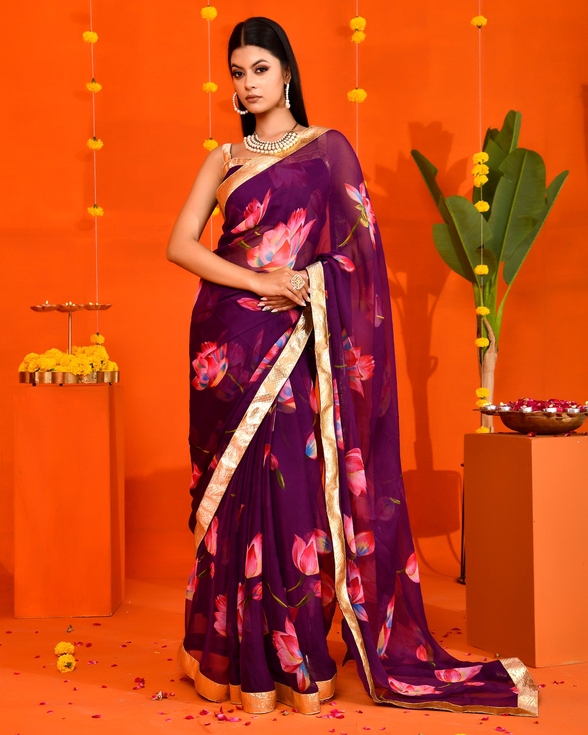This is a purple colour, lotus printed chiffon saree. It comes with a stiched ,lotus printed chiffon blouse with gota details.
