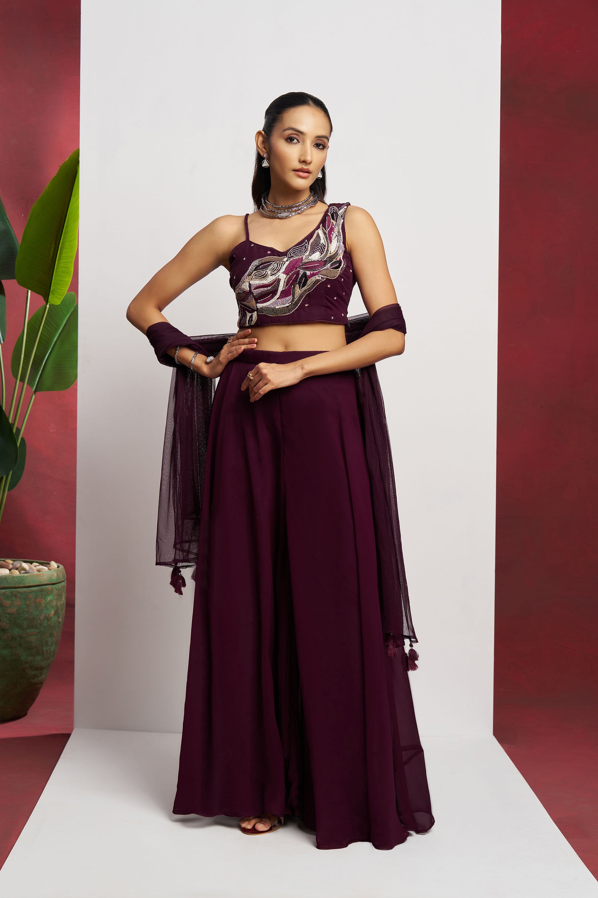 Purple Georgette hand Embroidered Festive Crop Top Set