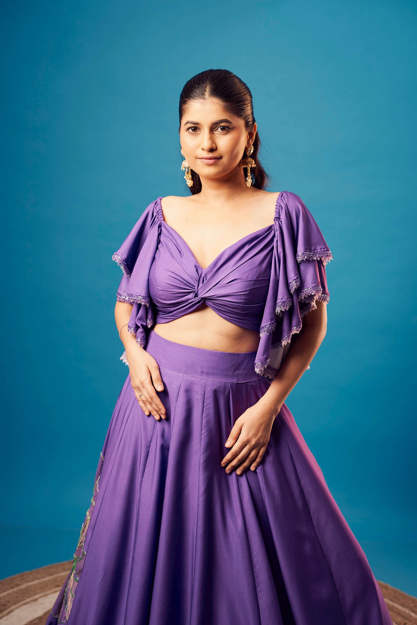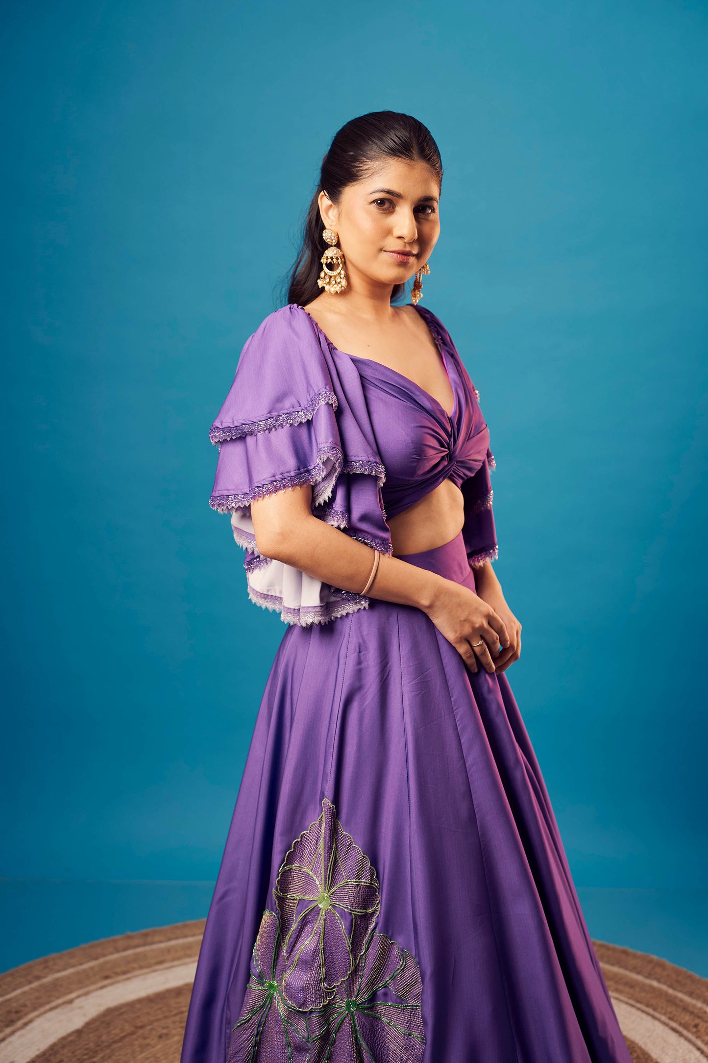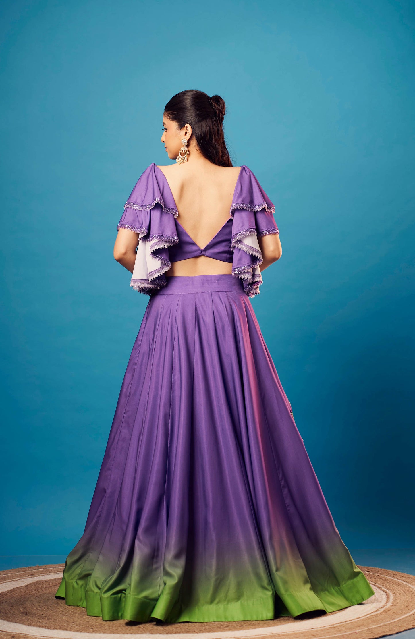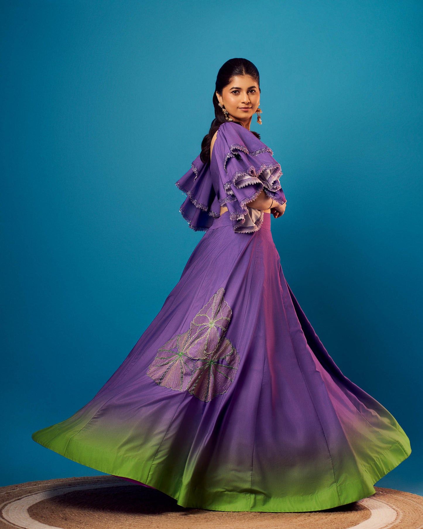 Purple layered sleeves blouse highlighted with cutdana lace work with matching shaded purple-green skirt with big cutdana flower embroidery with cancan.