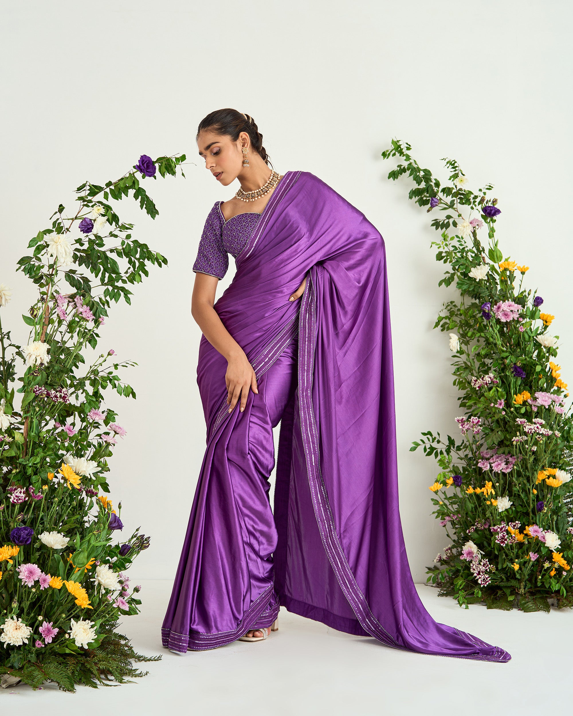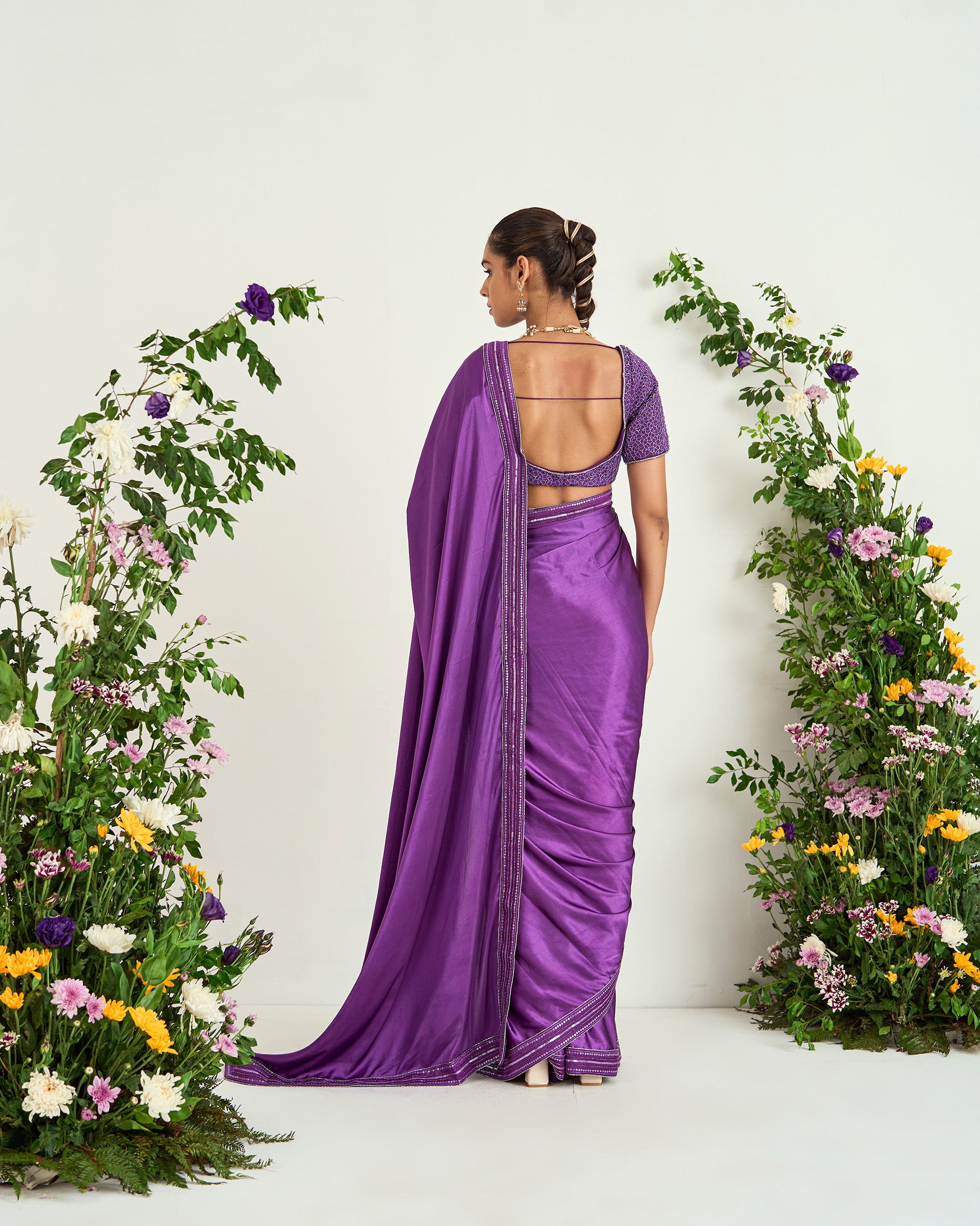 Purple Hand Embroidered Saree Set - Featuring a purple saree in satin base with zari, sequins, and glass beaded hand embroidery. It is paired with a matching blouse with zari work and glass bead work.