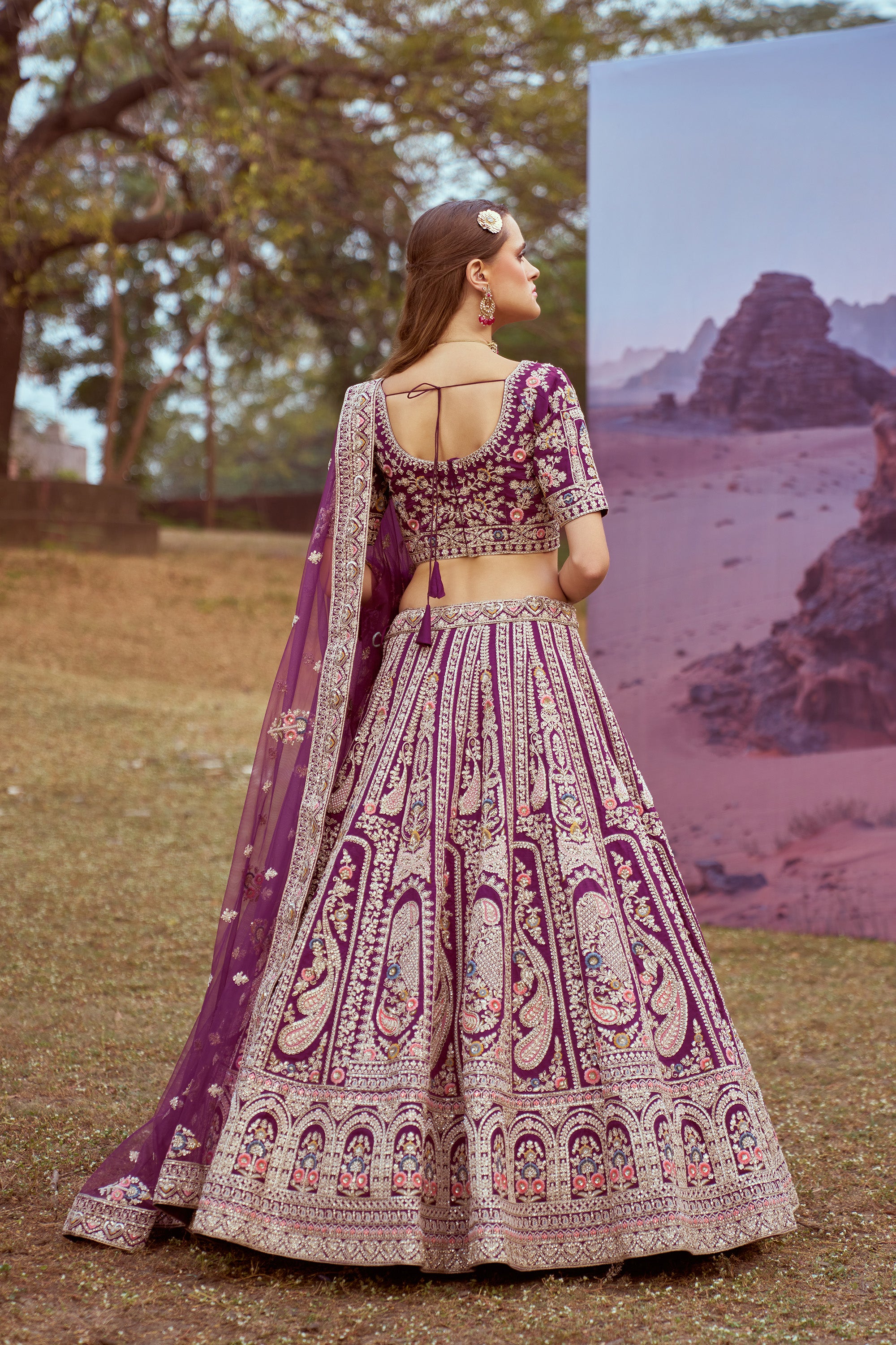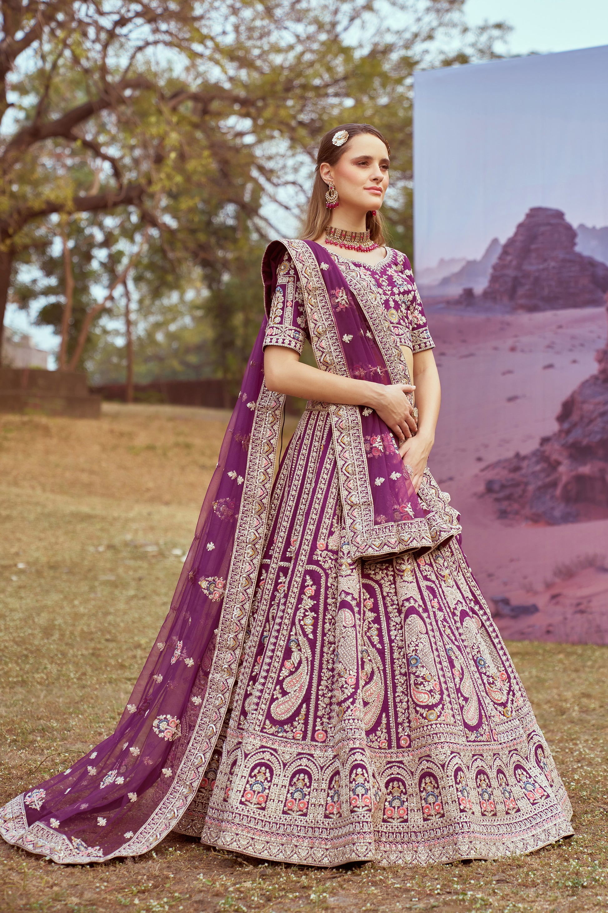 Purple Pure silk Moti, Coding embroidery Bridal Lehenga
