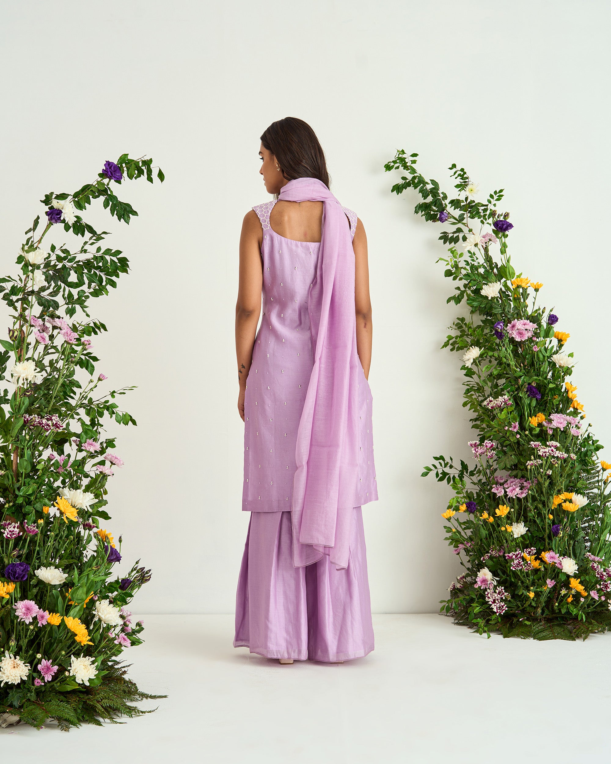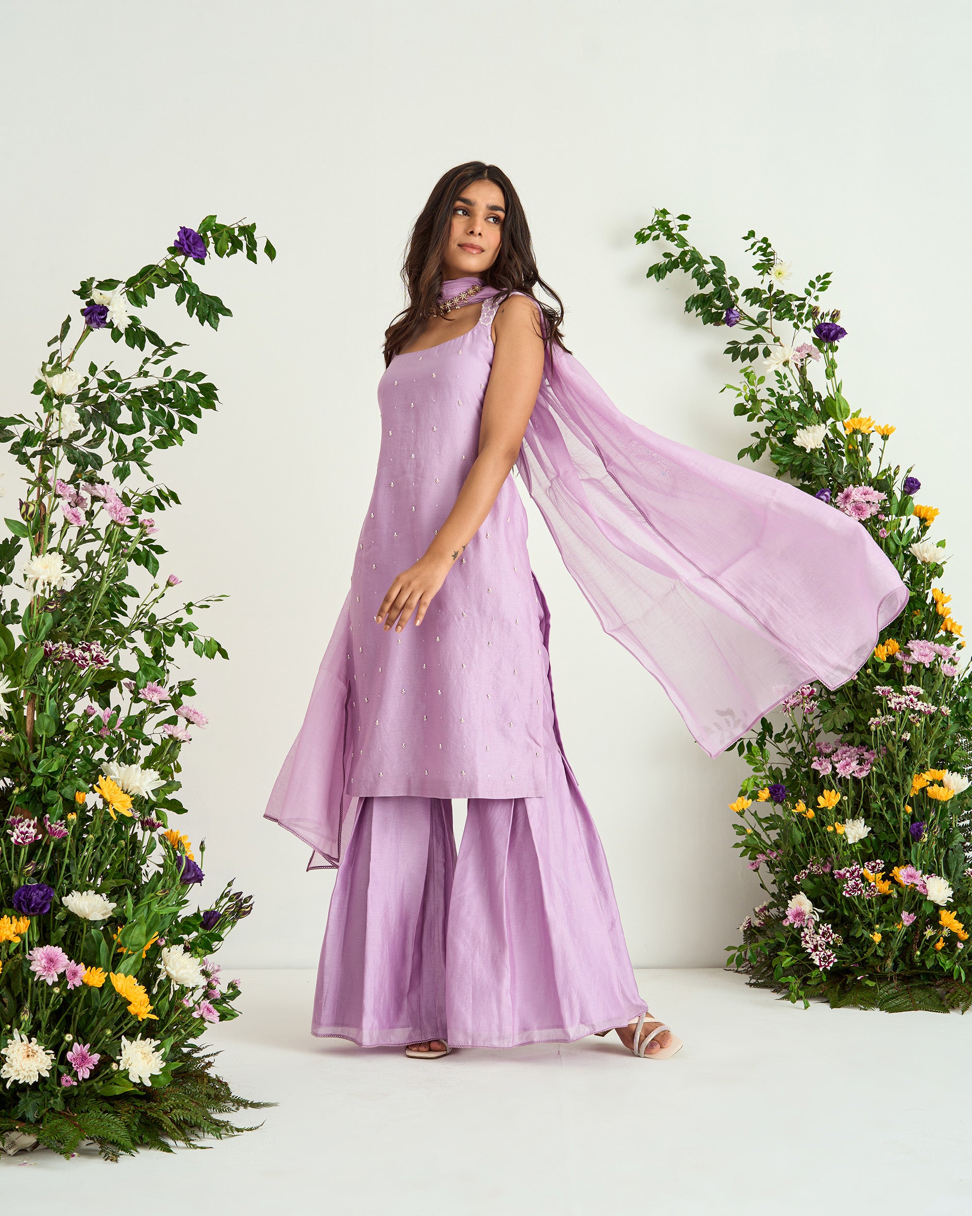 Purple Silk Chanderi Sharara Set - Featuring a lilac kurta in silk chanderi base with pearl embellishments. It is paired with matching pleated sharara pants and a dupatta.