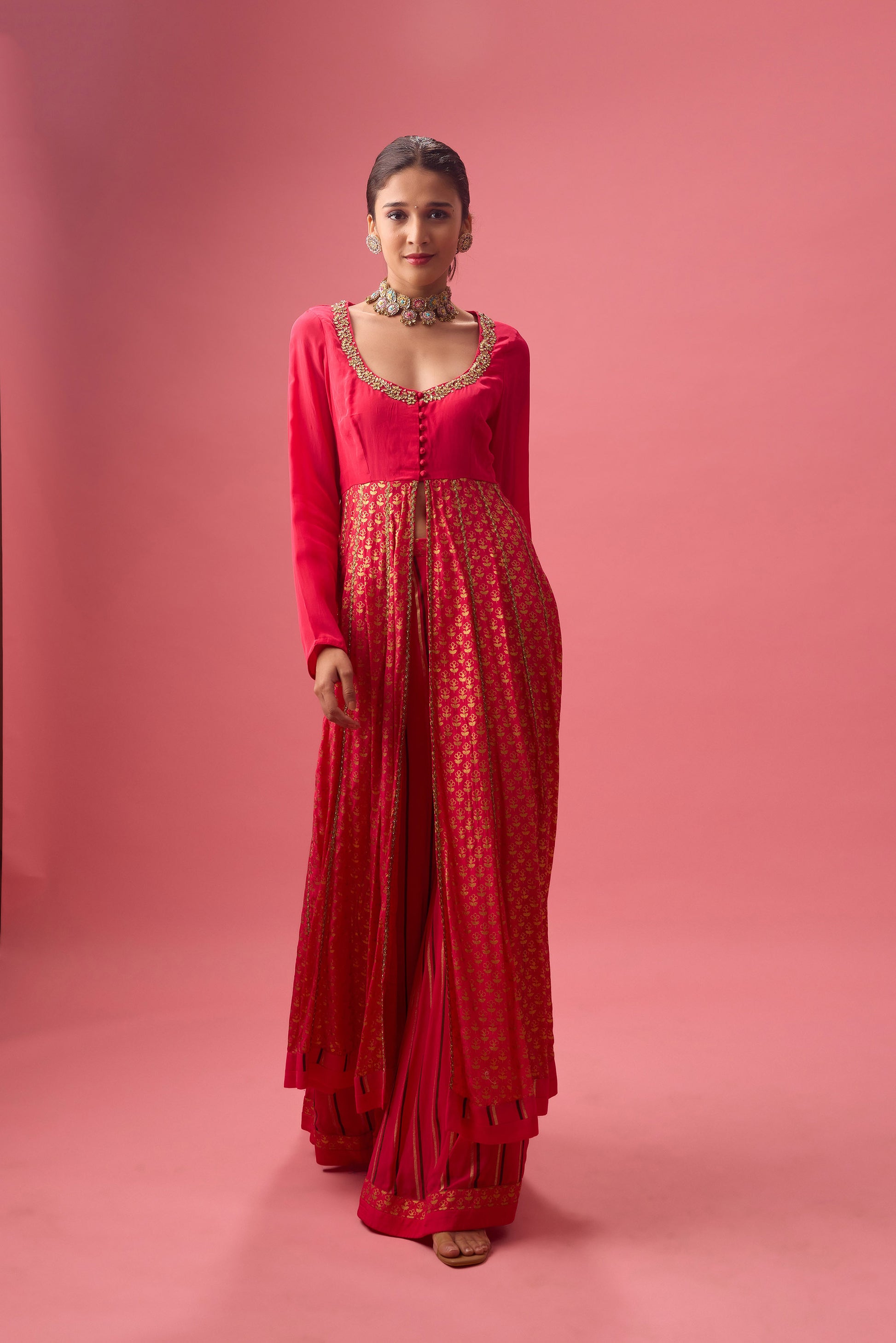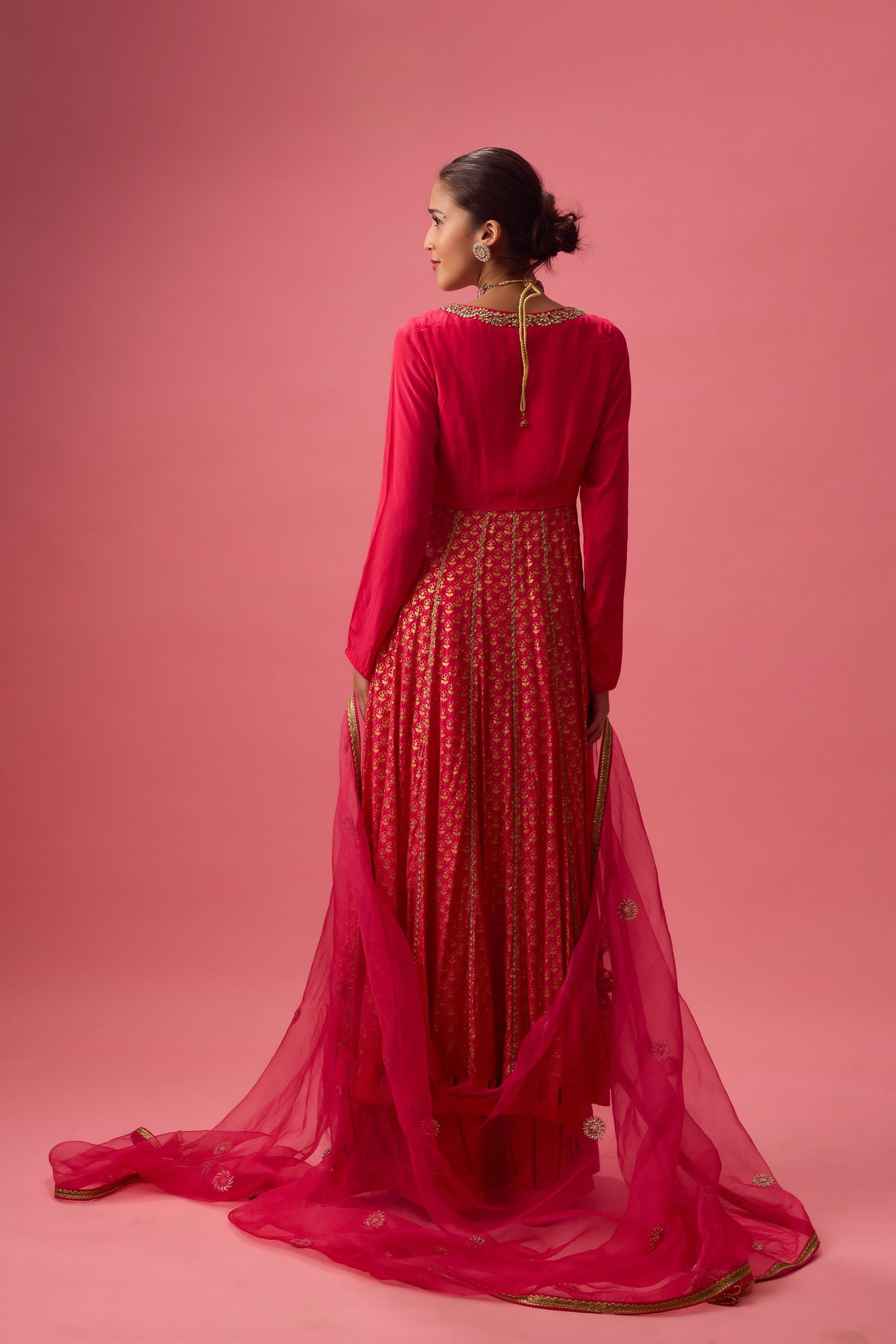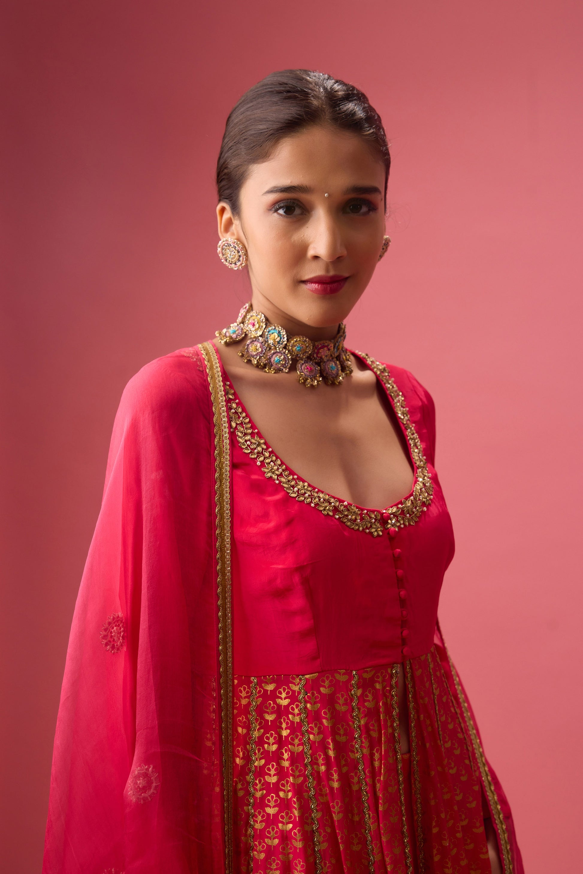 Rani pink multi godet kalidar kurta with hand embroidery on the neckline paired with striped wide leg sharara pants and hand embroidered organza dupta with gota borders and handmade latkans.