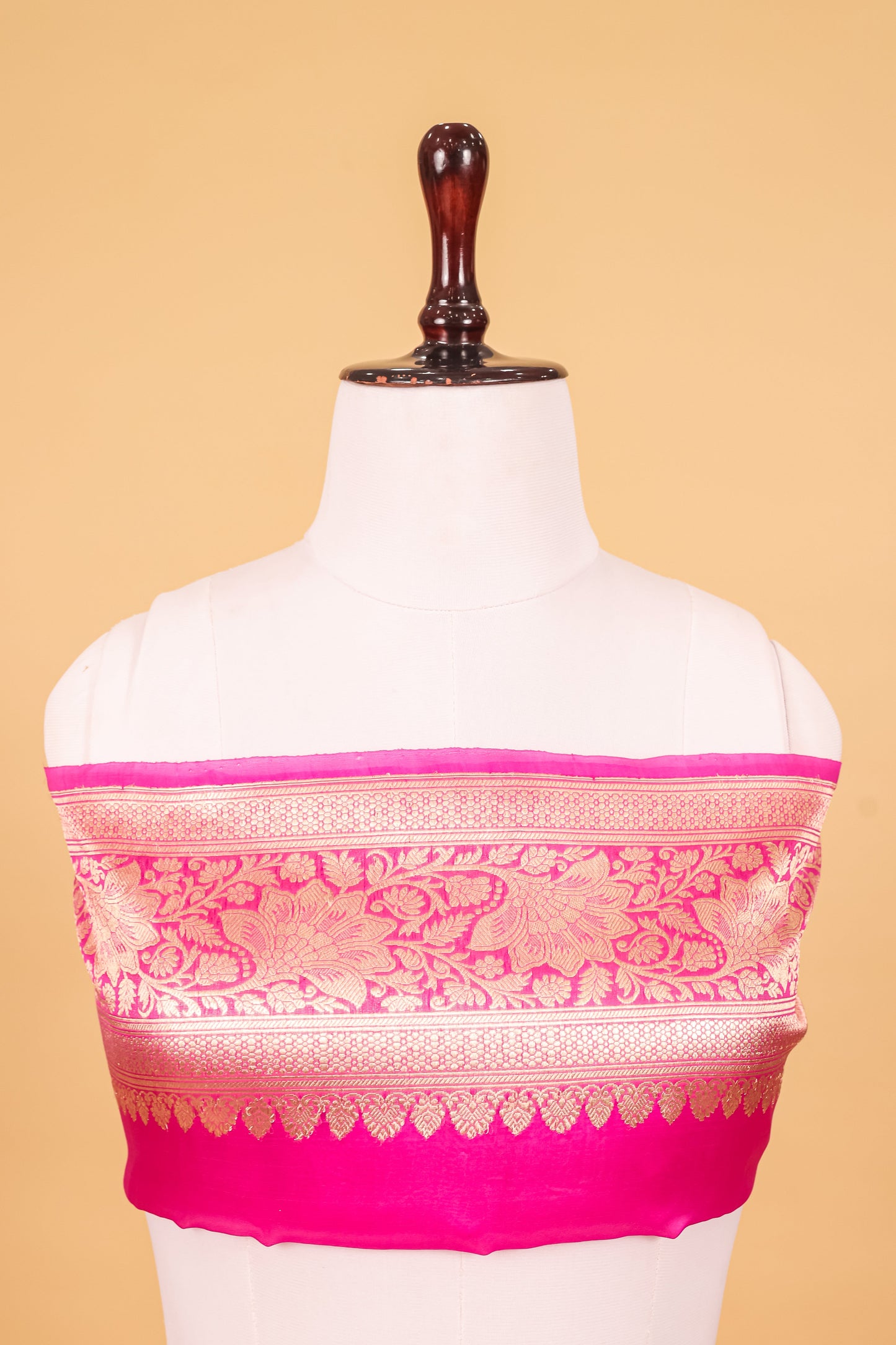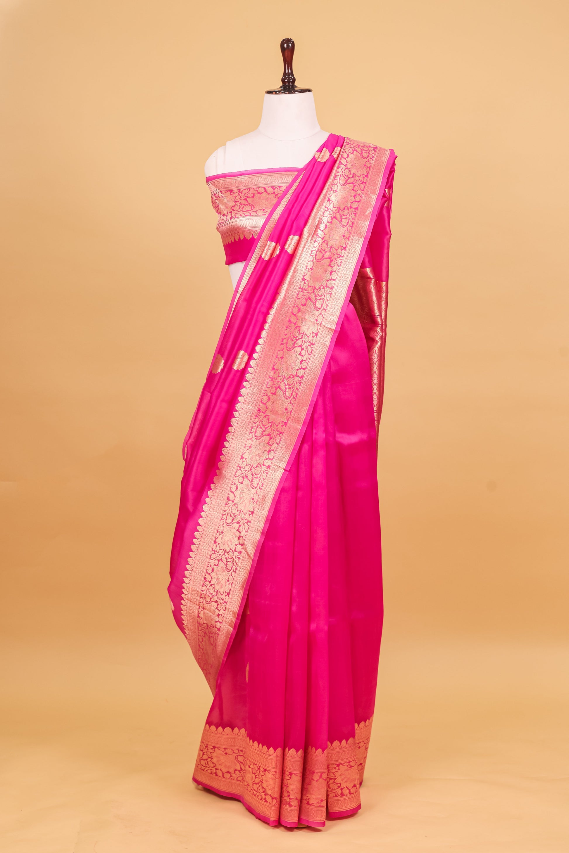 Description: Elevate your style with our handcrafted Rani Pink Organza Silk Kadhwa Saree. The delicate boota pattern and intricate Banarasi border add a touch of elegance to this saree. The soft, lightweight organza fabric and vibrant Rani pink color will make you the center of attention at any event!