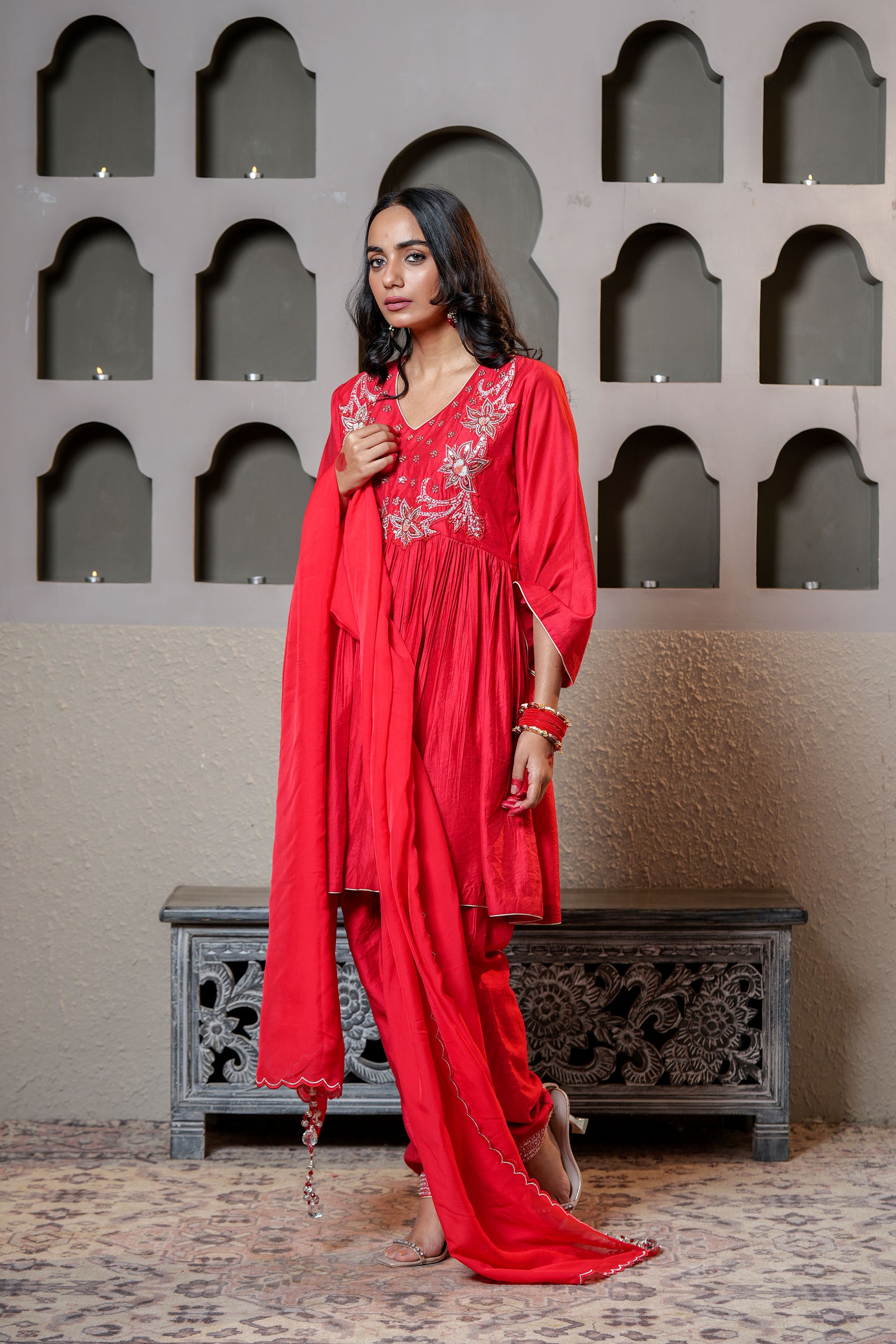 This beautiful chanderi anarkali set in red colour with moti handwork is perfect wedding wear .