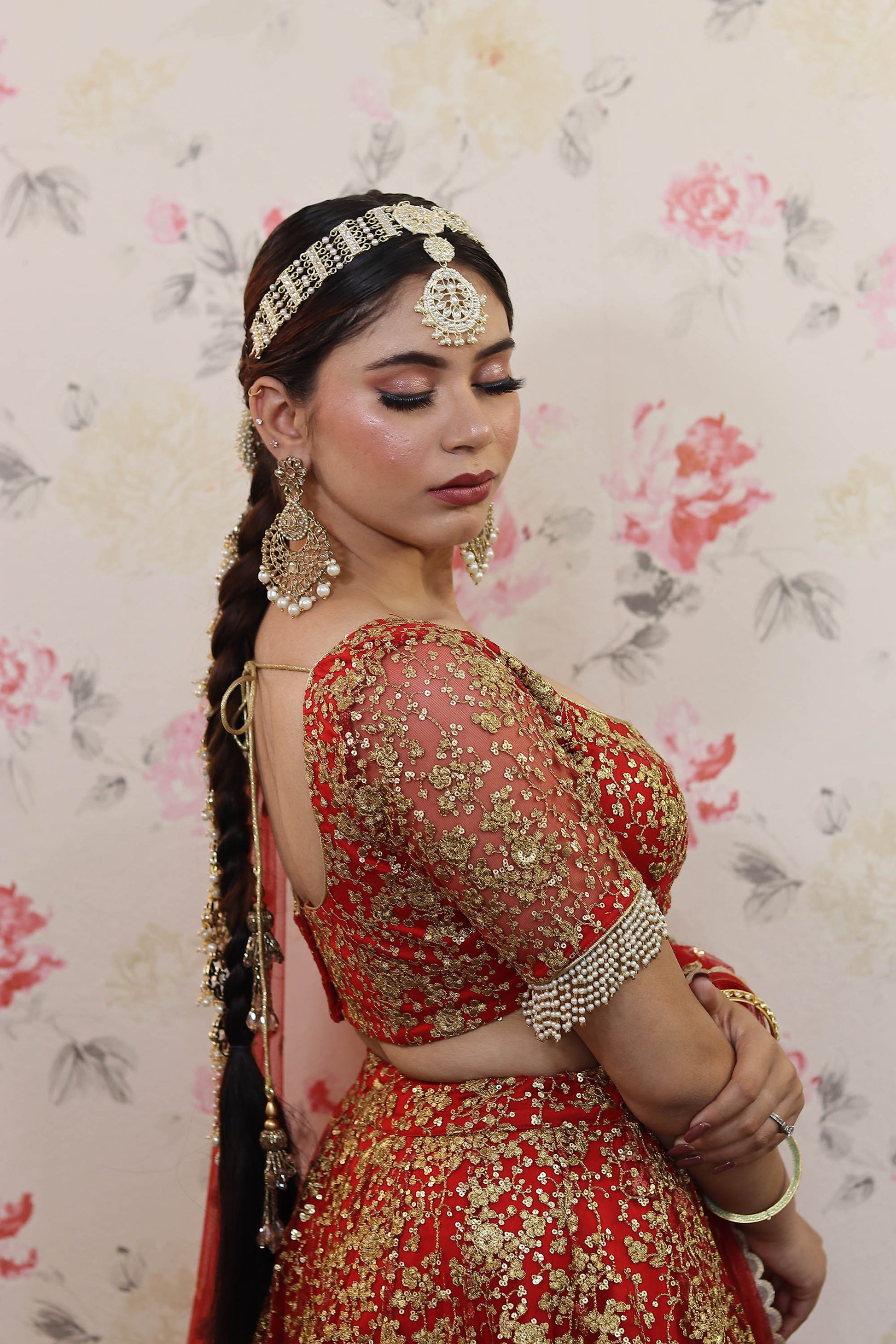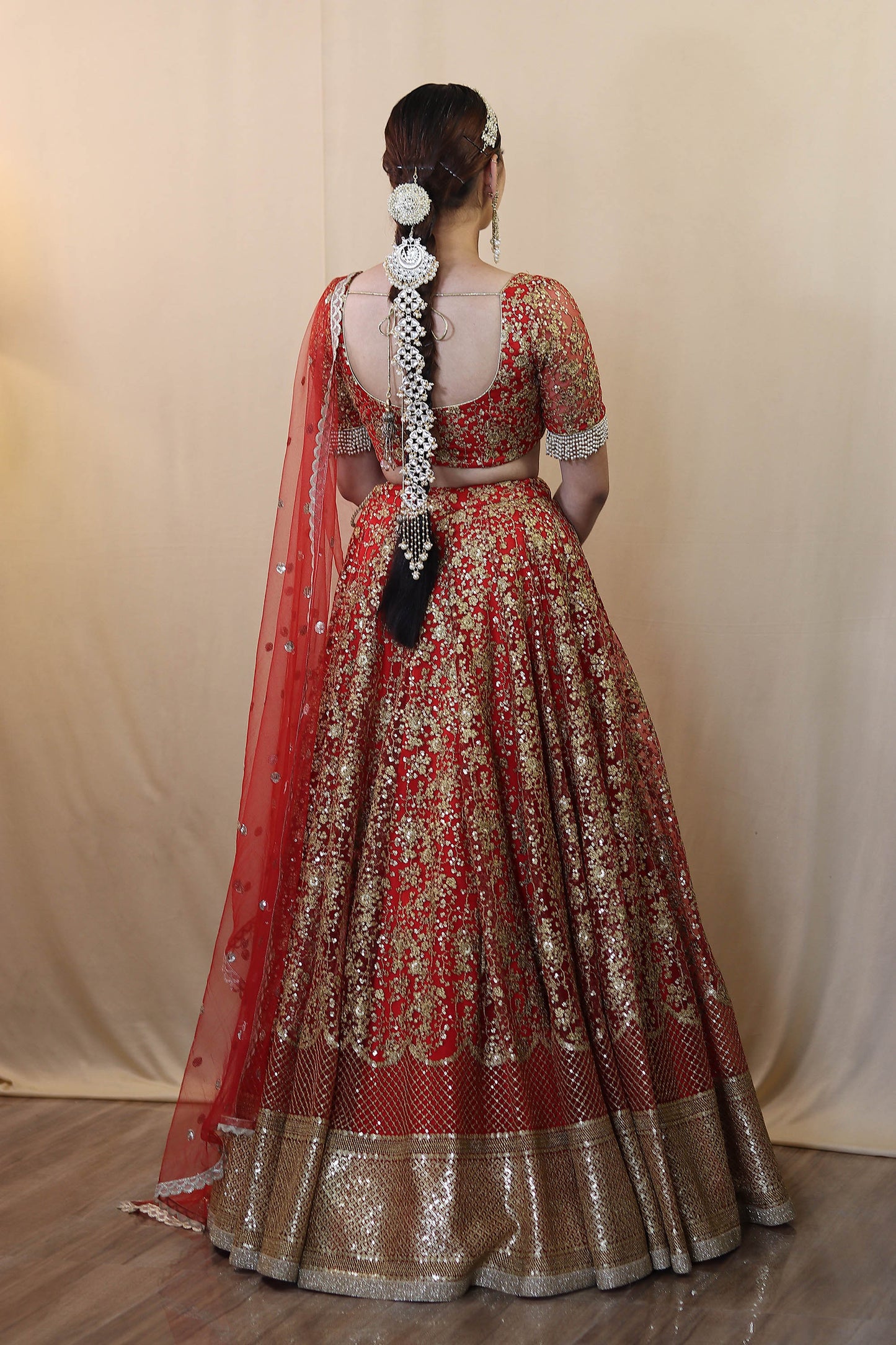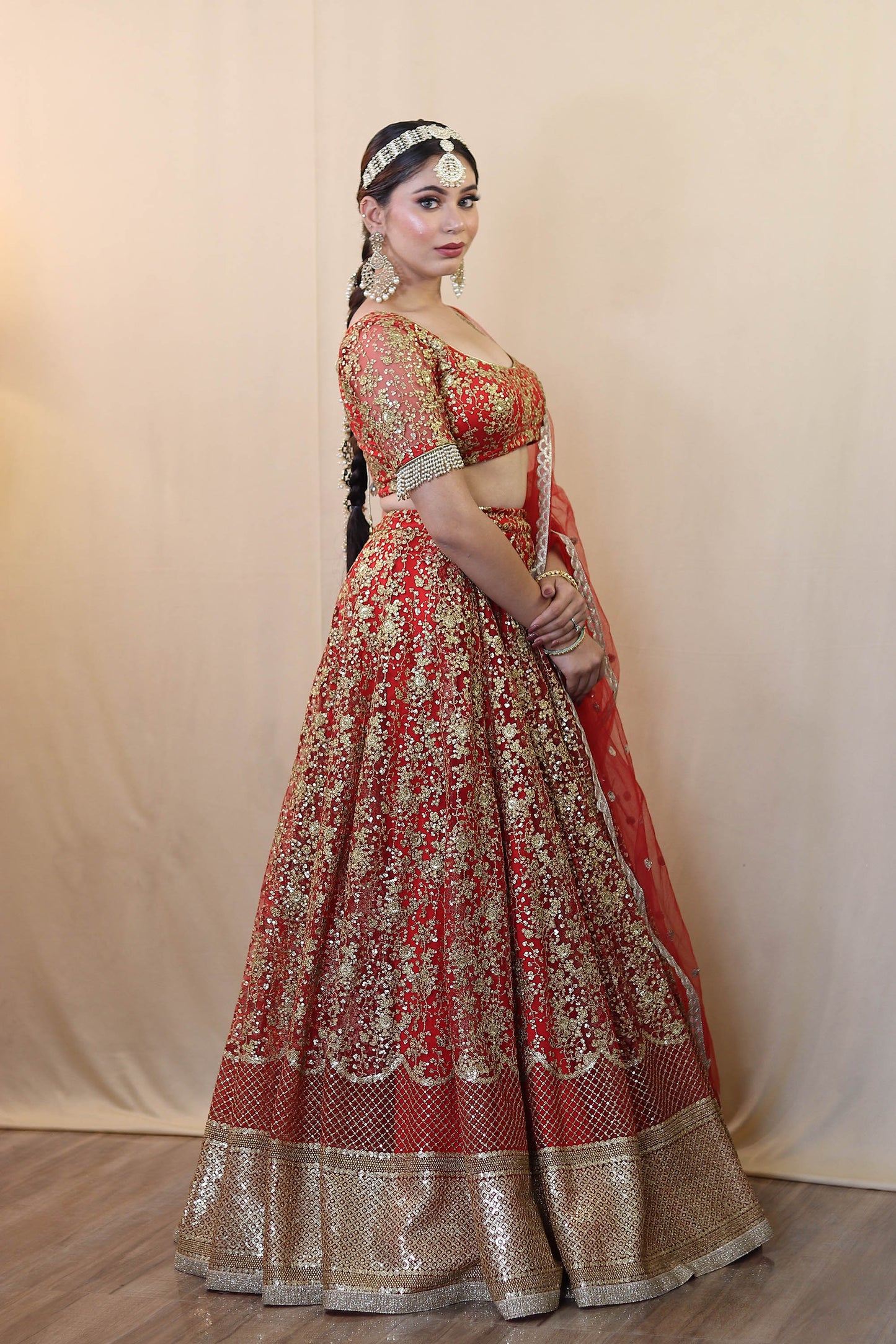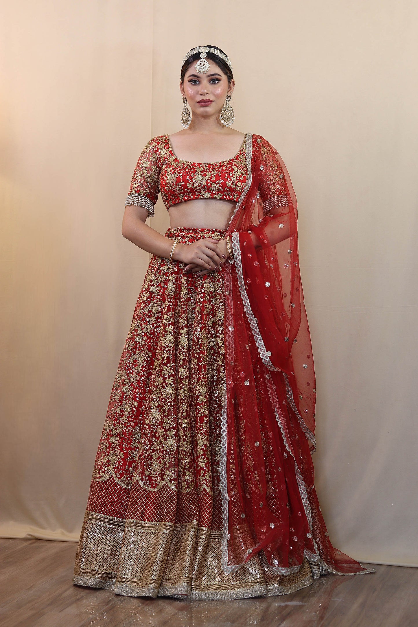 Red gold lehenga, intricate embroidery on net, paired with wide U neckline blouse & net embellished dupatta.