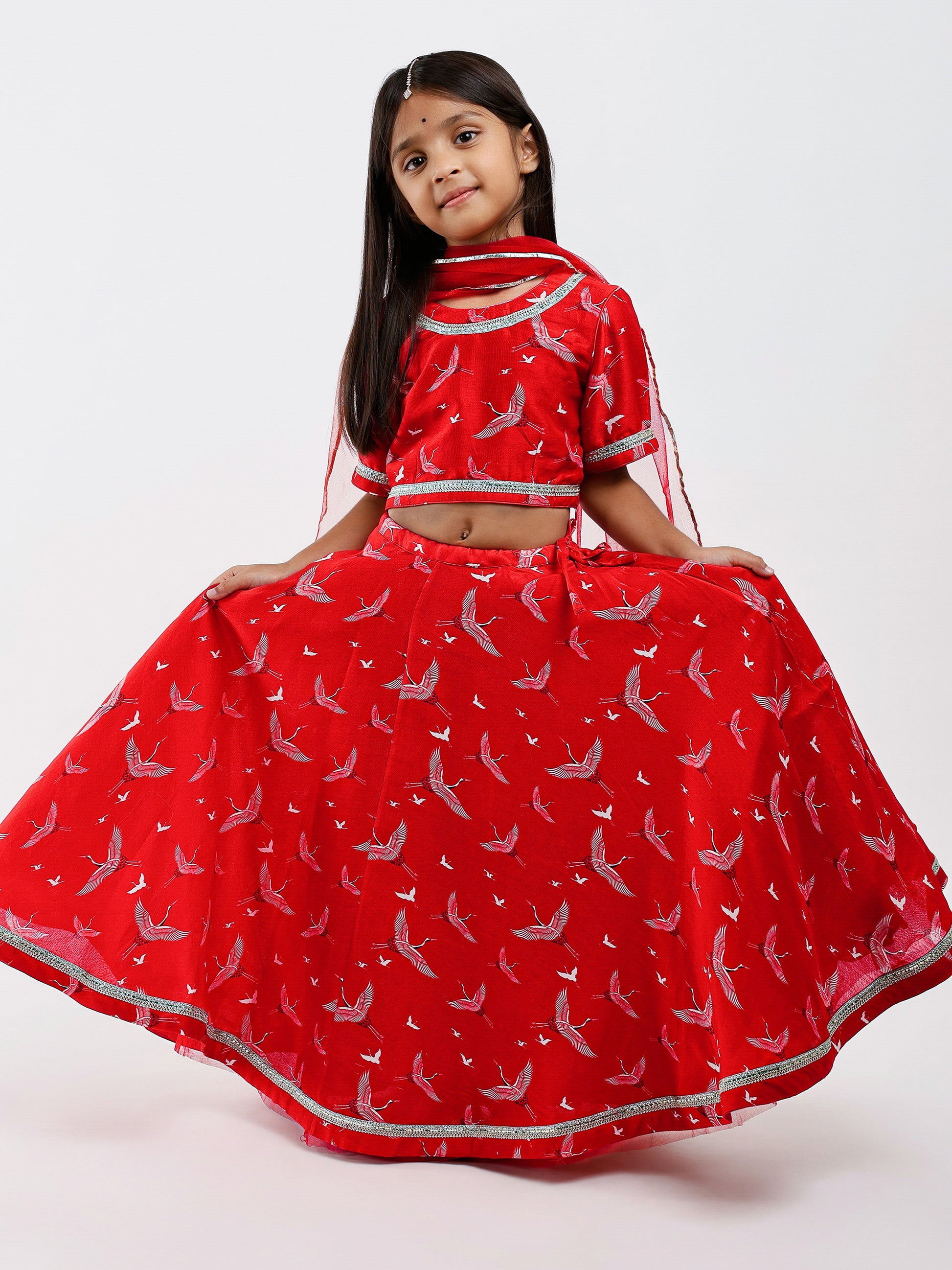 Bird Print Red Handwoven Chanderi lehenga attached with cotton lining and can-can alongwith Net Dupatta.