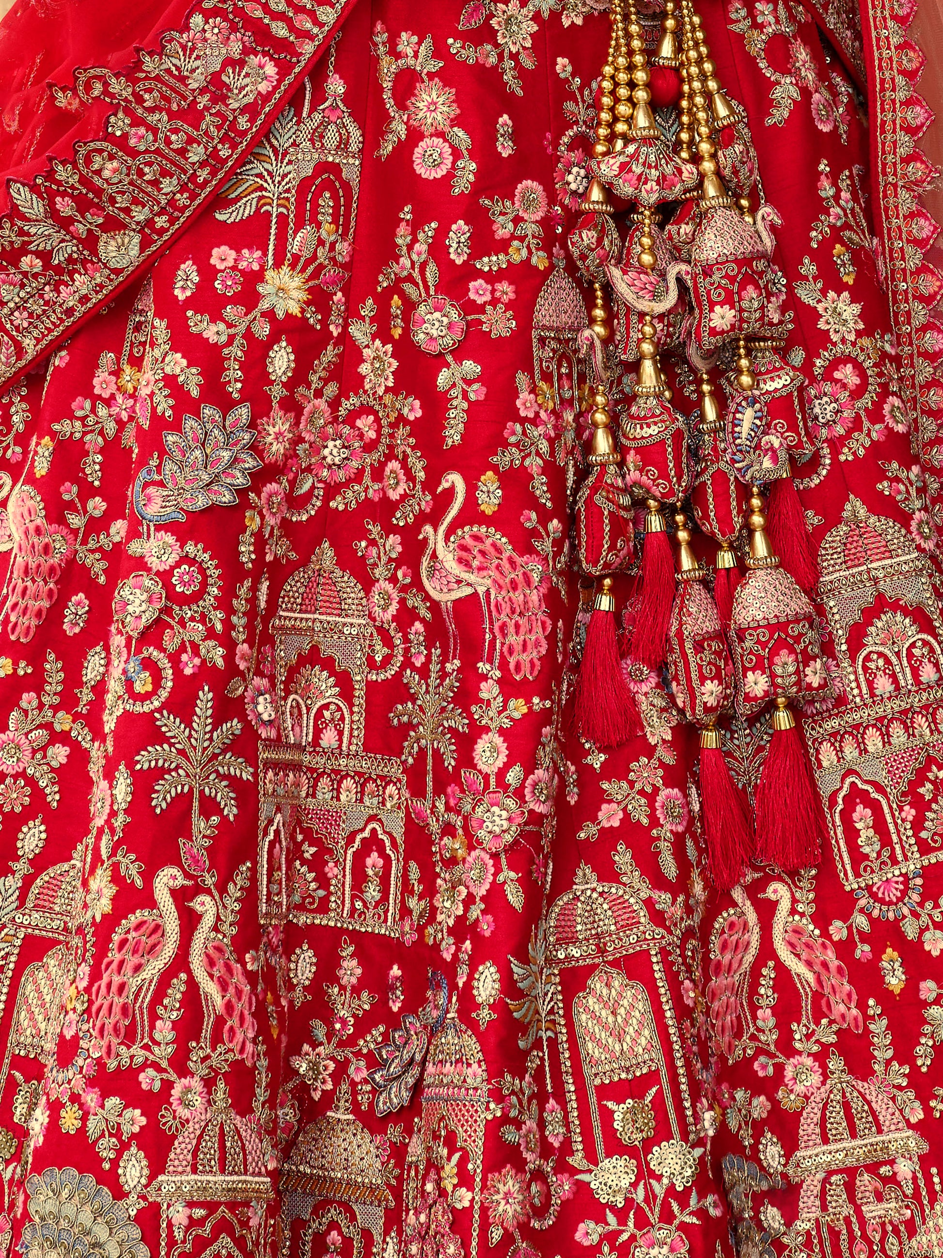 Red Designer Raw Silk Embroidered Bridal Lehenga
