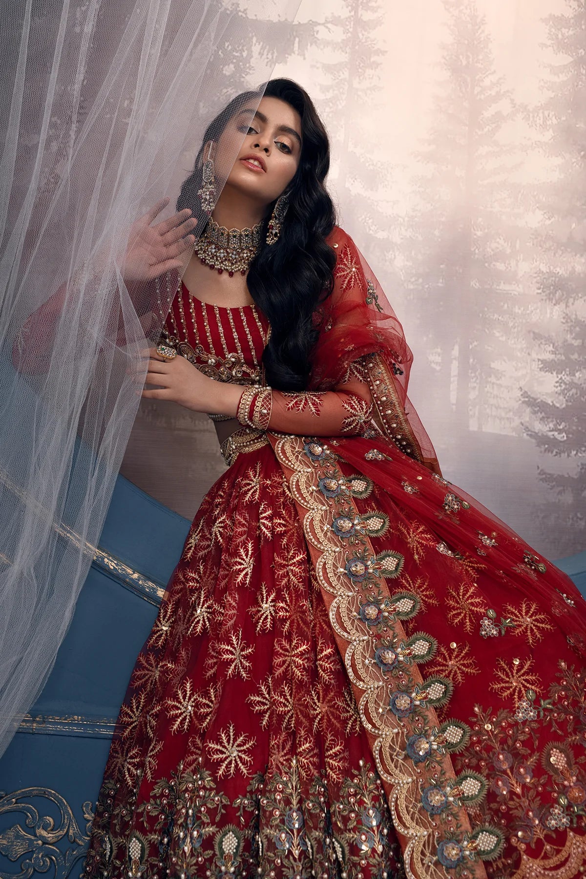 Red Net Heavy Embroidered Bridal Wear Lehenga Choli
