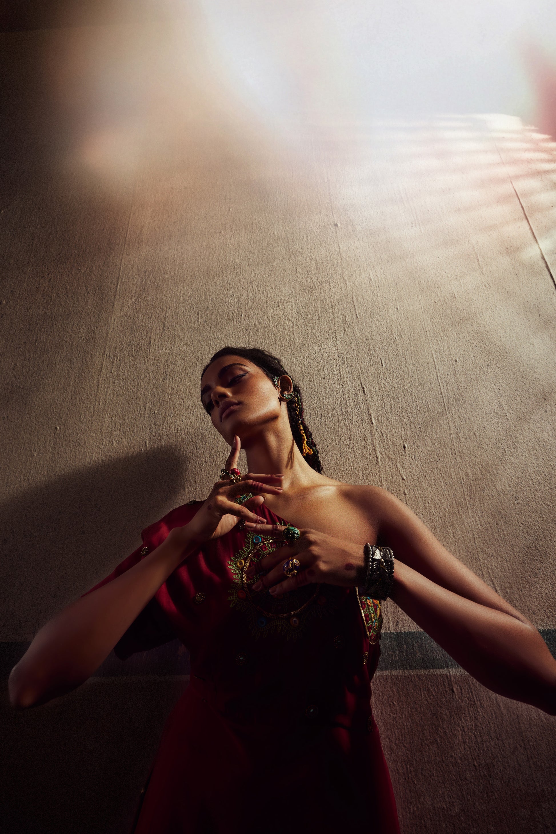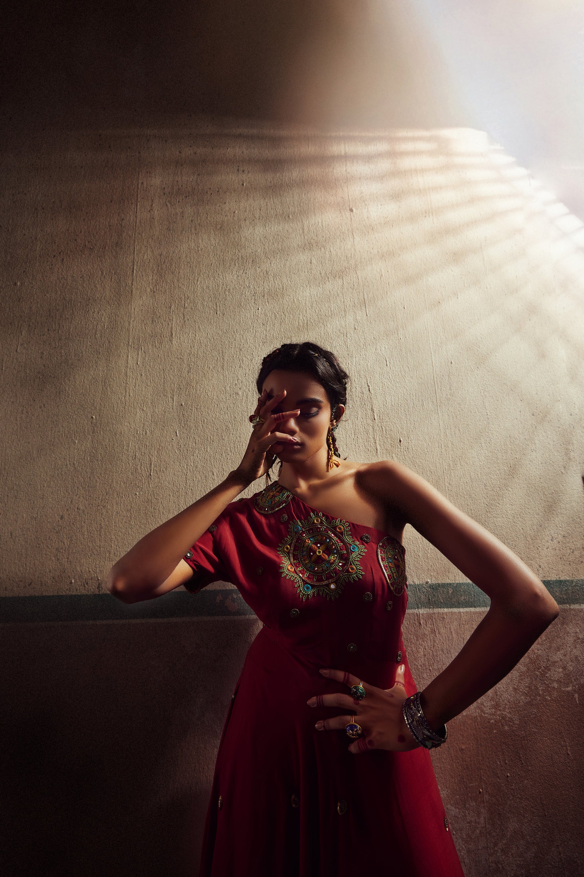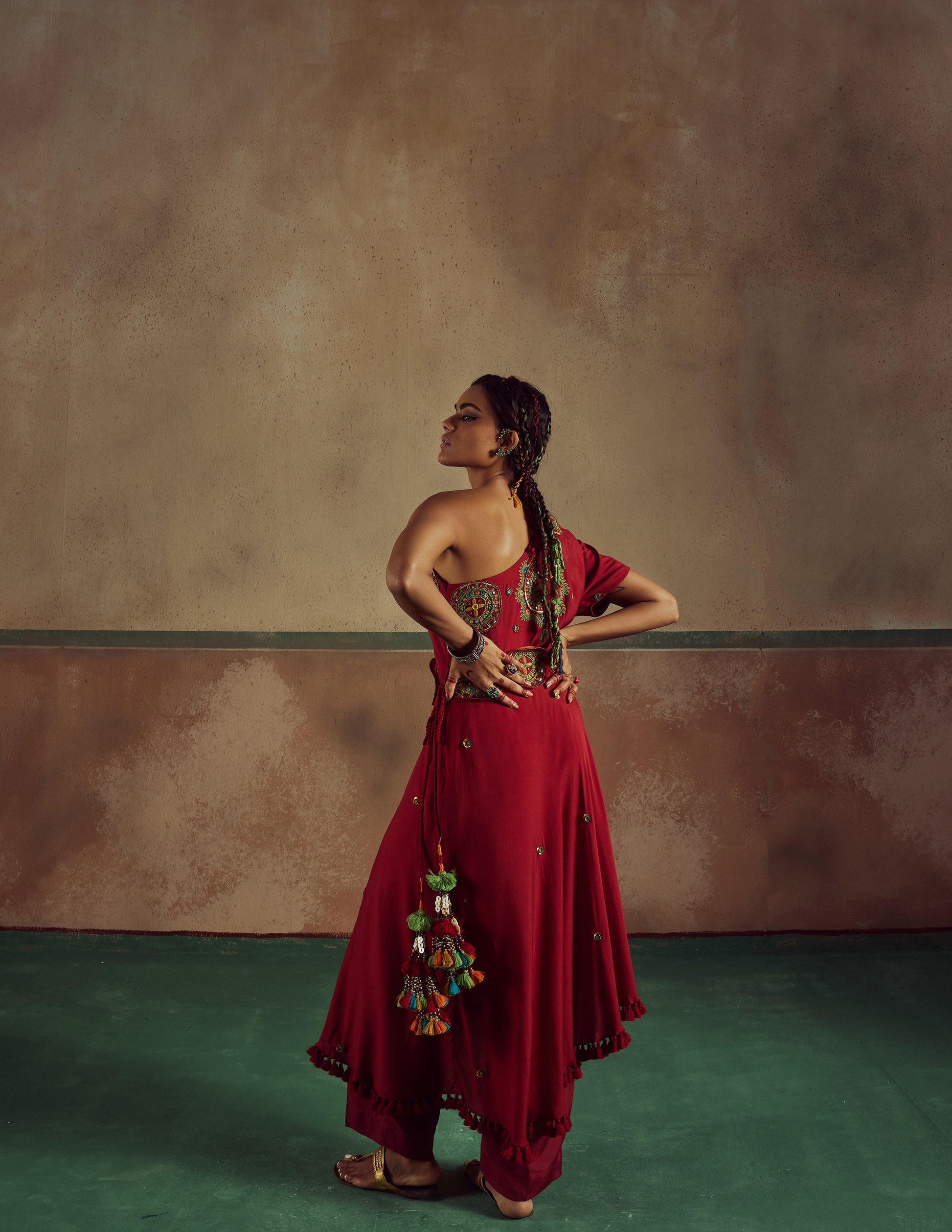featuring red one shoulder circle thread & mirror embroidery kurta set where the hem is asyemmtrical adorned with tassels. The kurta's look has been completed with a stunning heavy embroidered belt for a statement. The look has been paired up with pants.