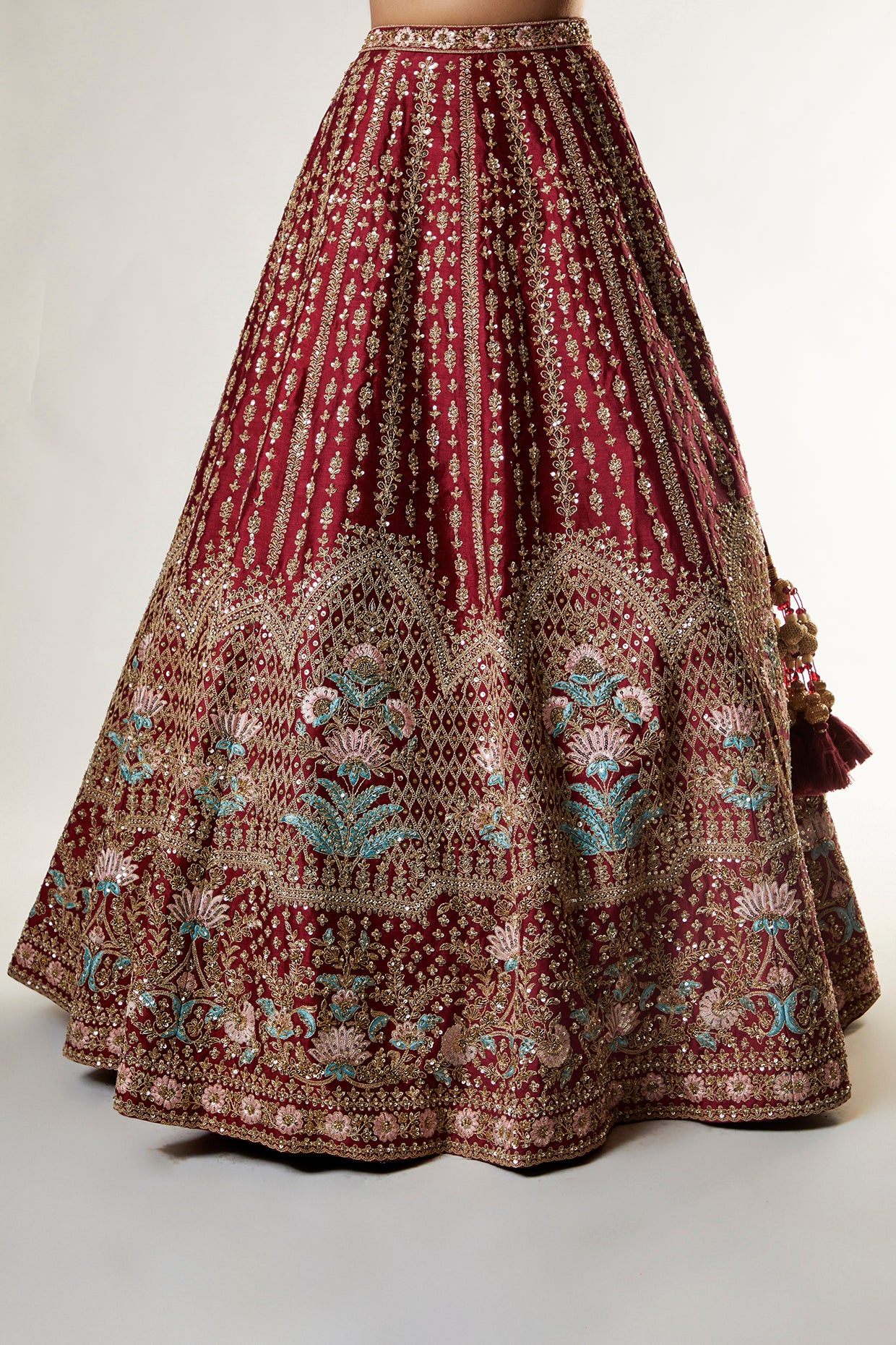 Featuring A Red Lehenga In Raw Silk Base With Zardosi Work, Including A Can-Can. It Is Paired With A Matching Embellished Blouse And Two Dupattas. Style This Designer Lehenga Set With Polki Jewellery And Heels For A Perfect Bridal Look.