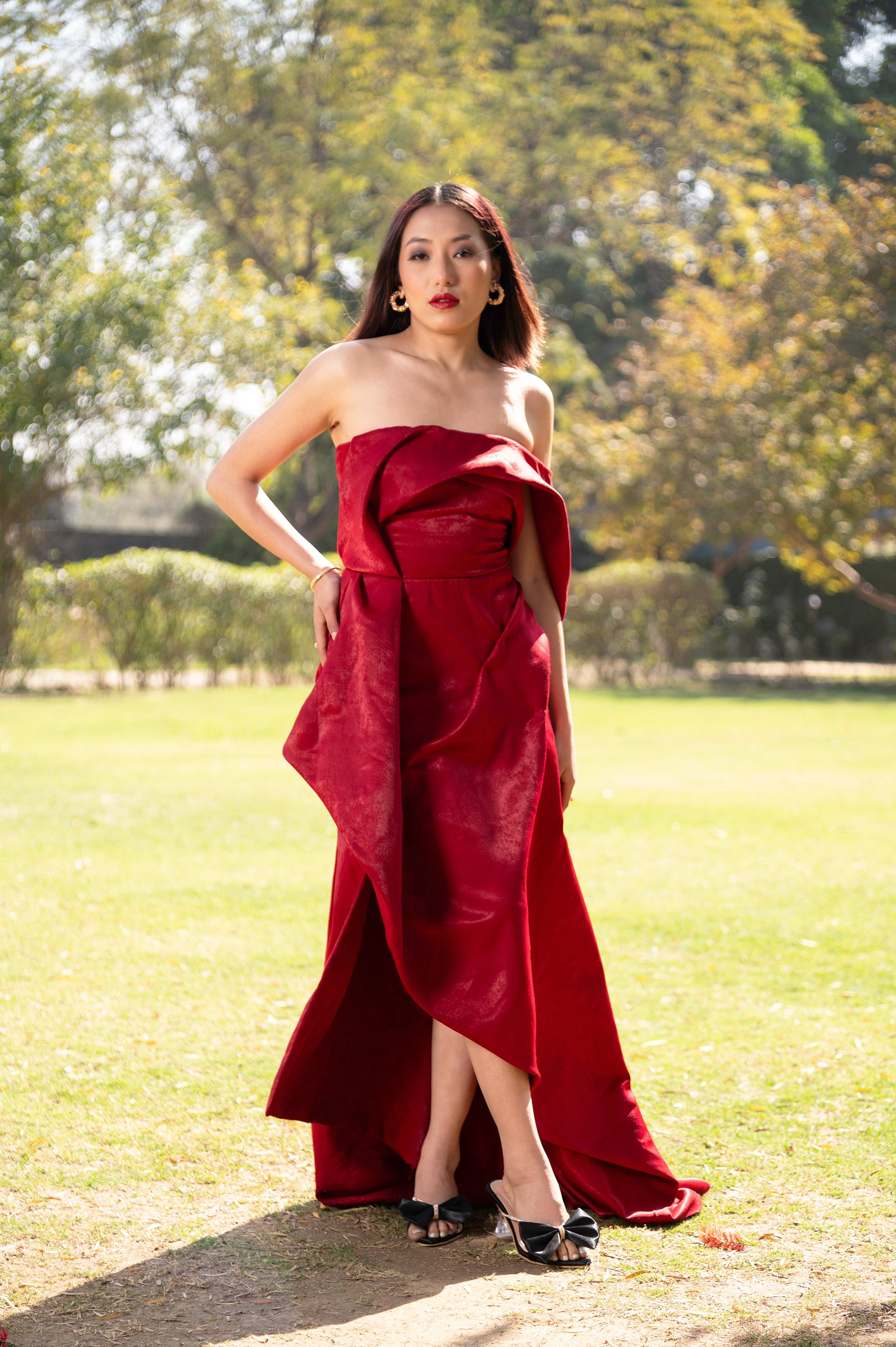 A bold strapless gown in rich scarlet, featuring dramatic sculptural draping and a high-low silhouette.