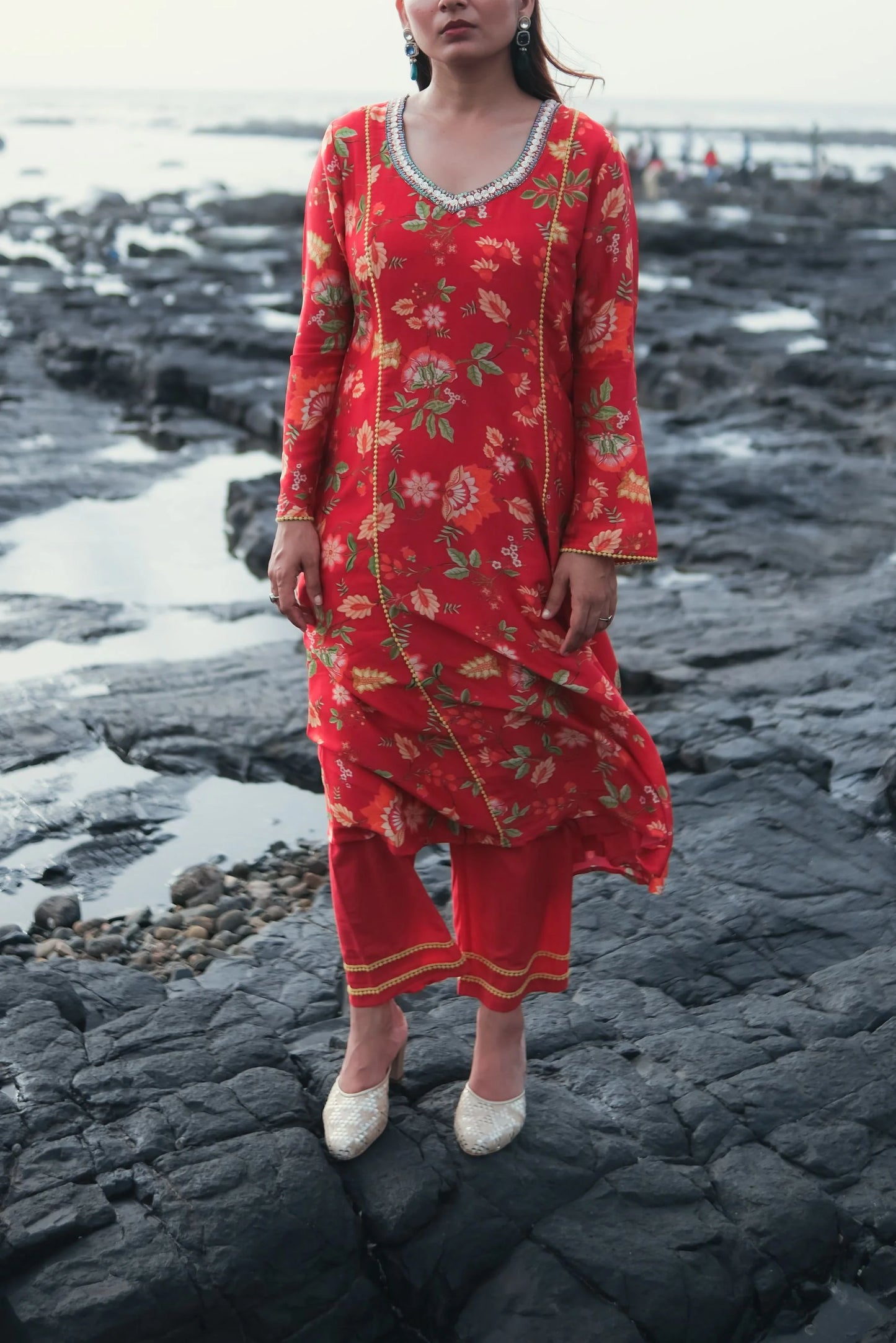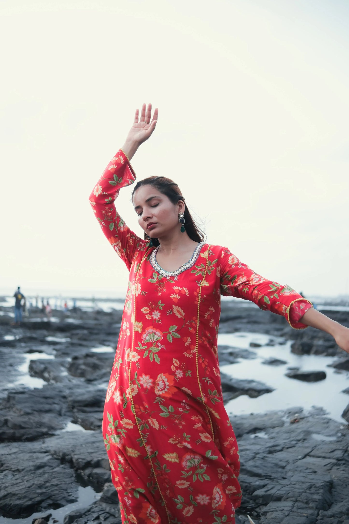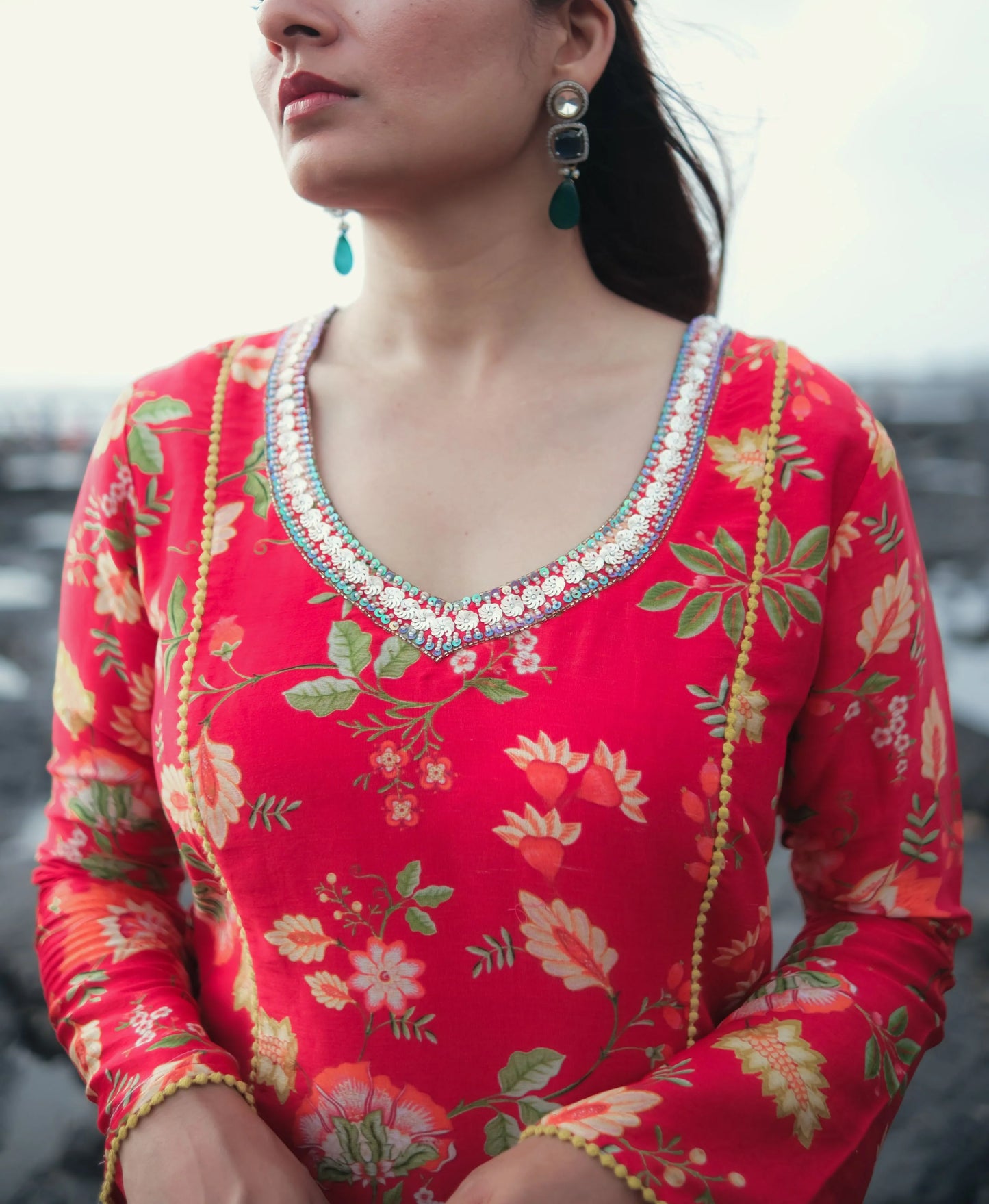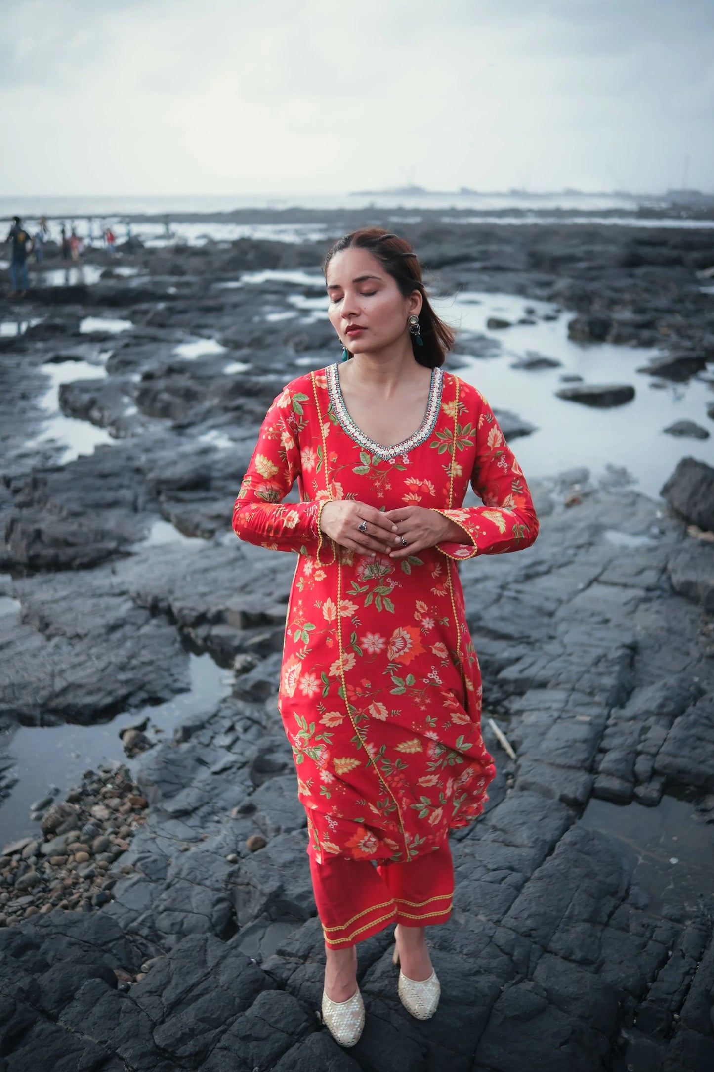 Introducing our latest addition to the collection- the breathtaking Red kurta set. The perfect blend to comfort and elegance, this set features a embroidered neck line adorned with squence and pearl work, complete the look with same matching cotton pants with laces, this set is a must have for any fashion- forward wardrobe.
