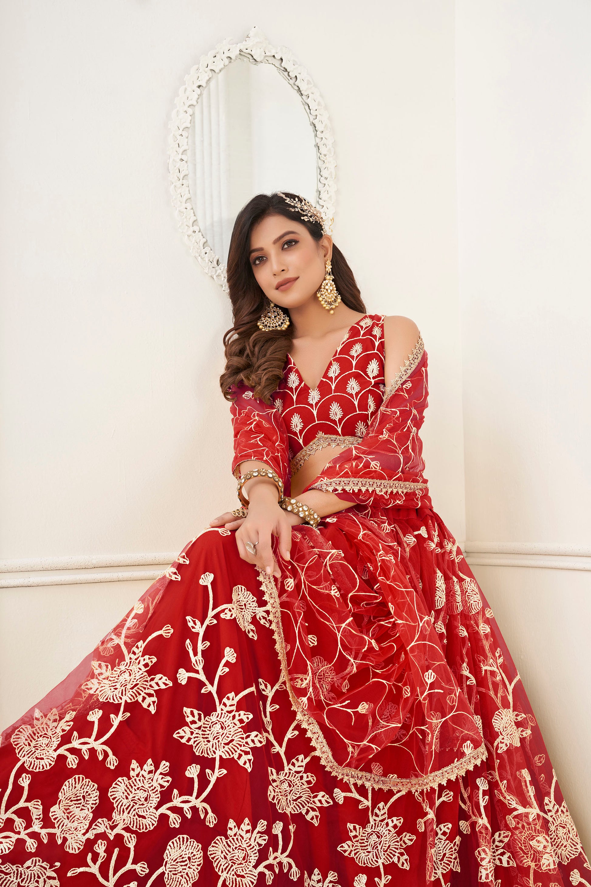Red Sequins Embroidered Net Wedding Lehenga for Bride