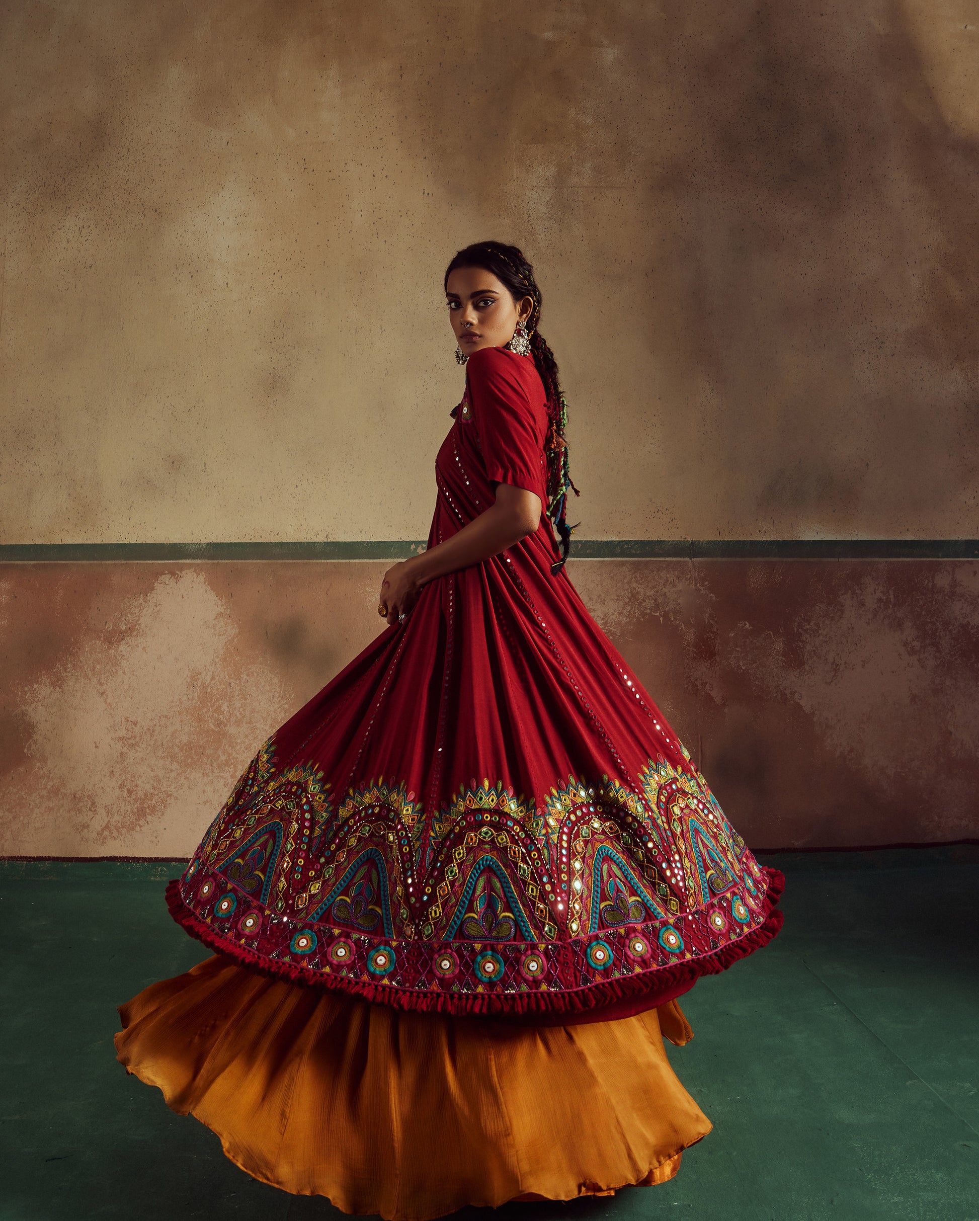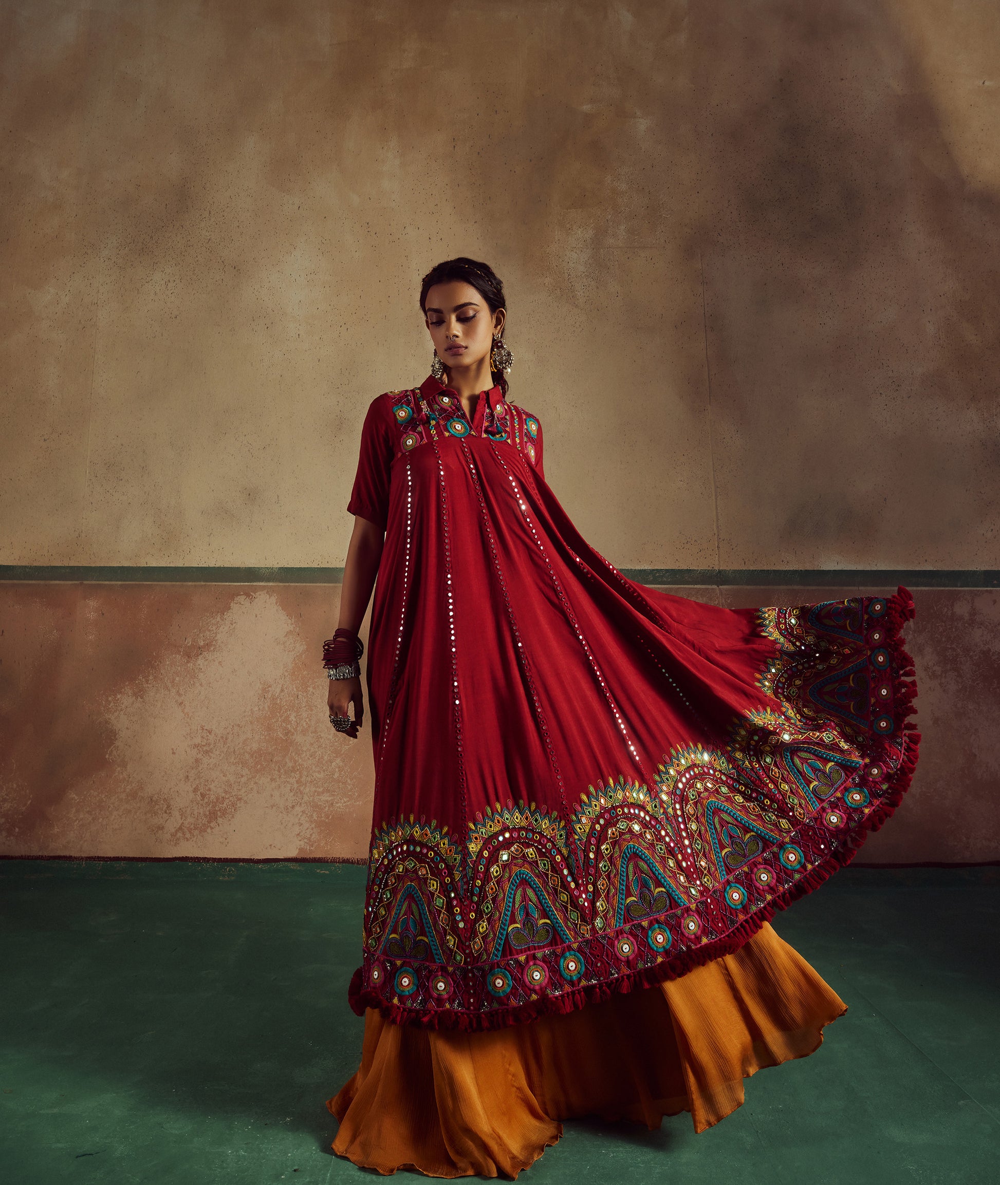 featuring red short choli 14 kali anarkali which is heavenly & heavily thread beads embroidered on each kali & on the short yoke. Each kali has been very intricately crafted with mirrors & loads of tassels on the hem. The dupatta is a contrast orange chiffon mirror threads beads embroidered completed with tassels. The set has been paired up with a contrast orange skirt.