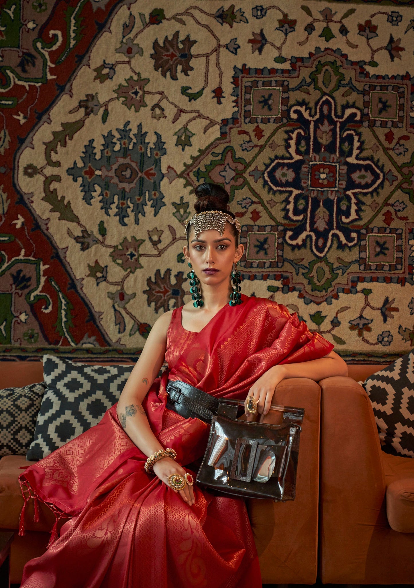 Looking for something a little out of the ordinary? We've got just the thing! This Red Woven Silk Banarasi Saree is perfect for those who want to make a statement. A wedding guest would look gorgeous in this outfit. It is suitable for any occasion, such as wedding receptions, engagement parties, and sangeets. So don't wait any longer, add this Red Woven Silk Banarasi Saree to your wardrobe today!