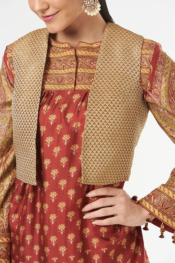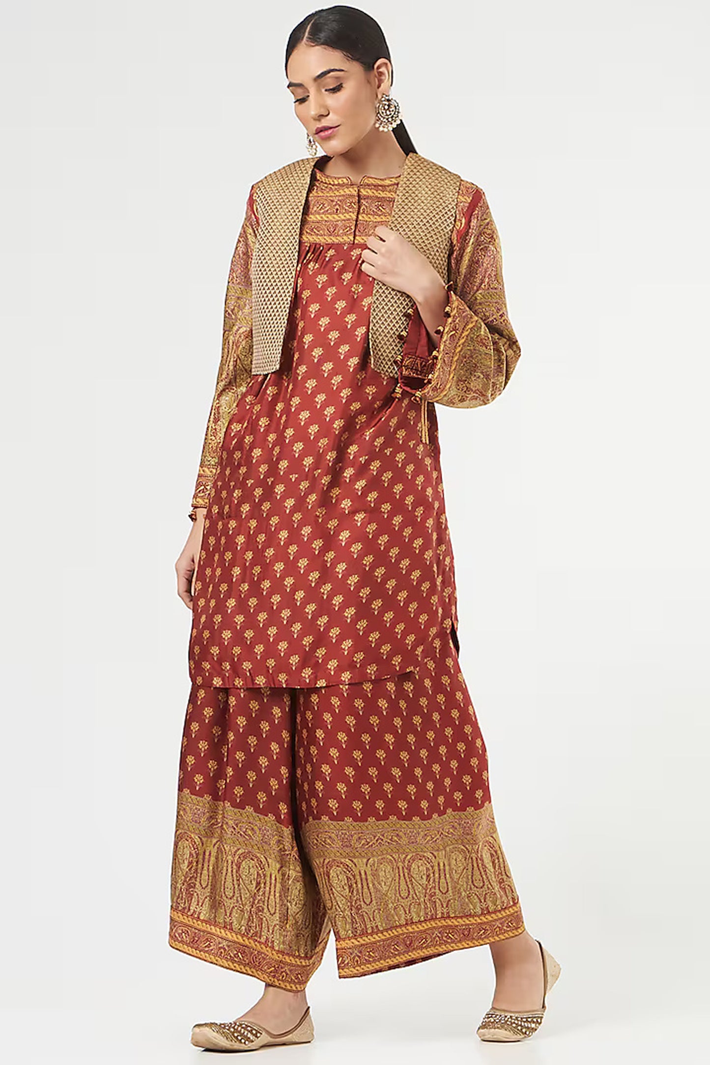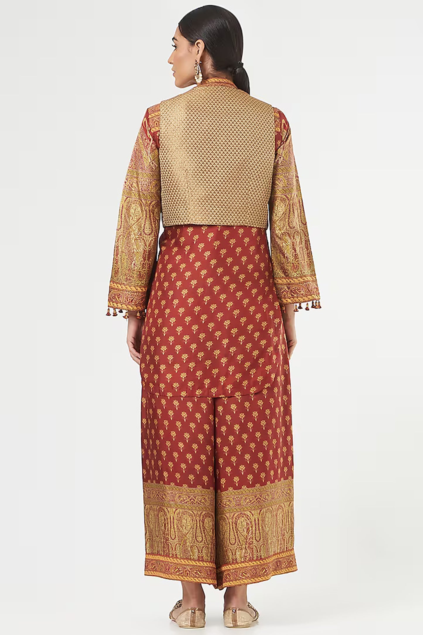 Featuring a reddish maroon tunic in pure silk base with kashmir print. It is paired with matching thread embroidered palazzo pants and a short jacket.