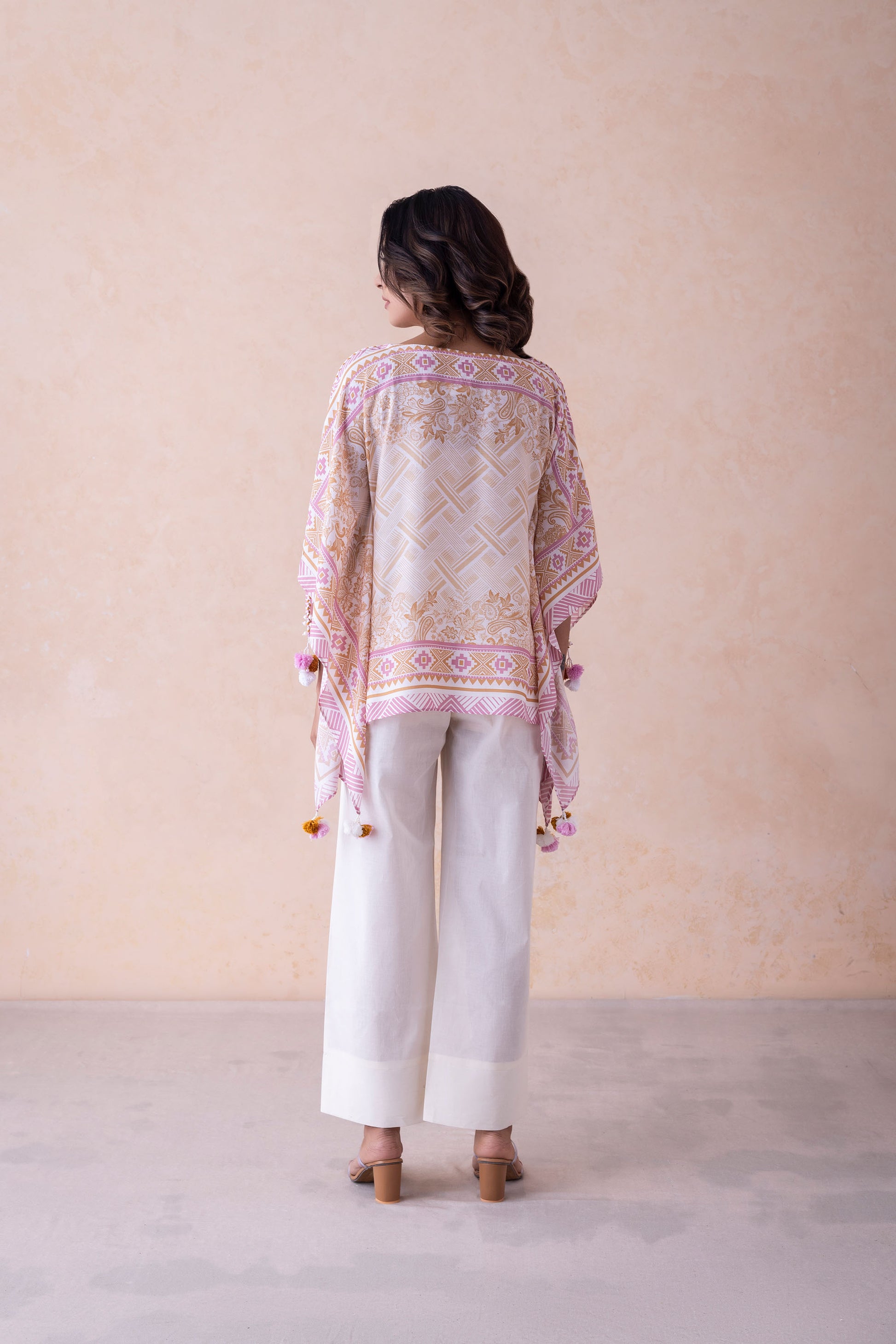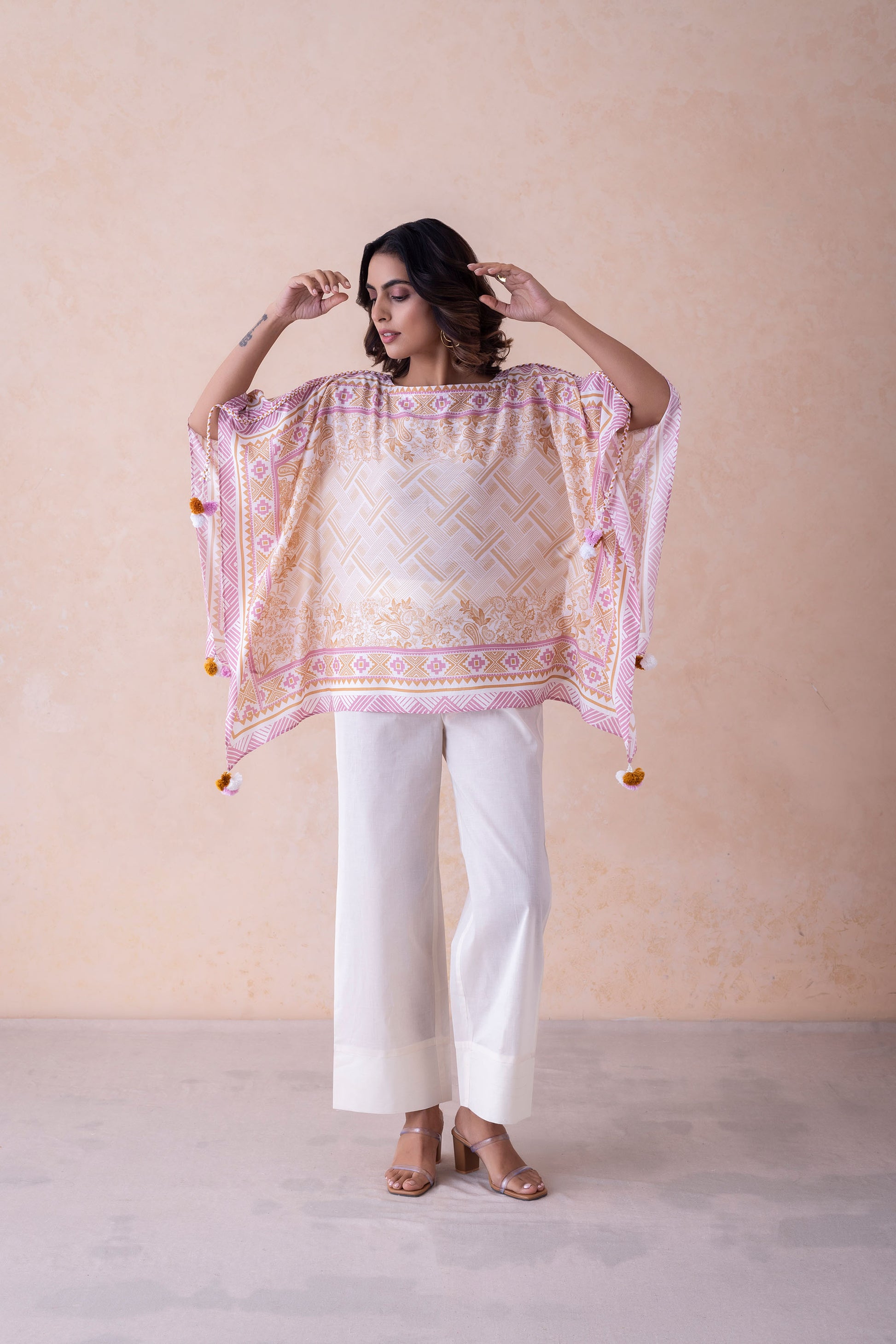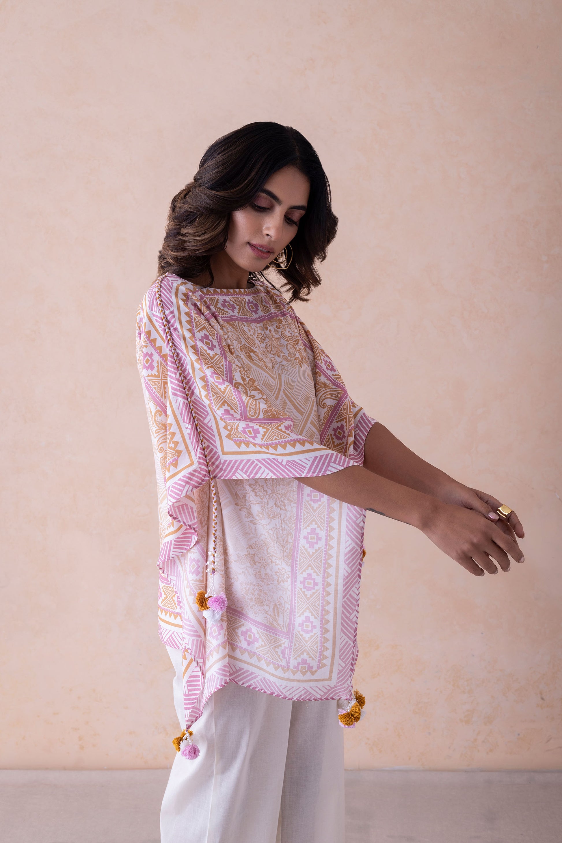 Pastel Pink Poncho Top with Gold Geometric Pattern and Tassel DetailingThis pastel poncho-style top features a gold geometric print with wide, draped sleeves for a relaxed fit. Tassels along the edges and a patterned hem add charm and a bohemian touch to the airy silhouette.Product Type: TopPattern: Geometric Print with Tassels and BorderLength: Hip-LengthClosure: Slip-OnLining: Unlined