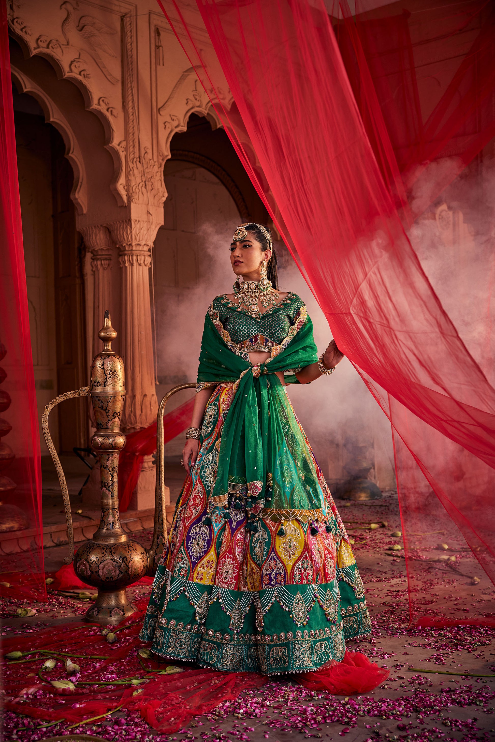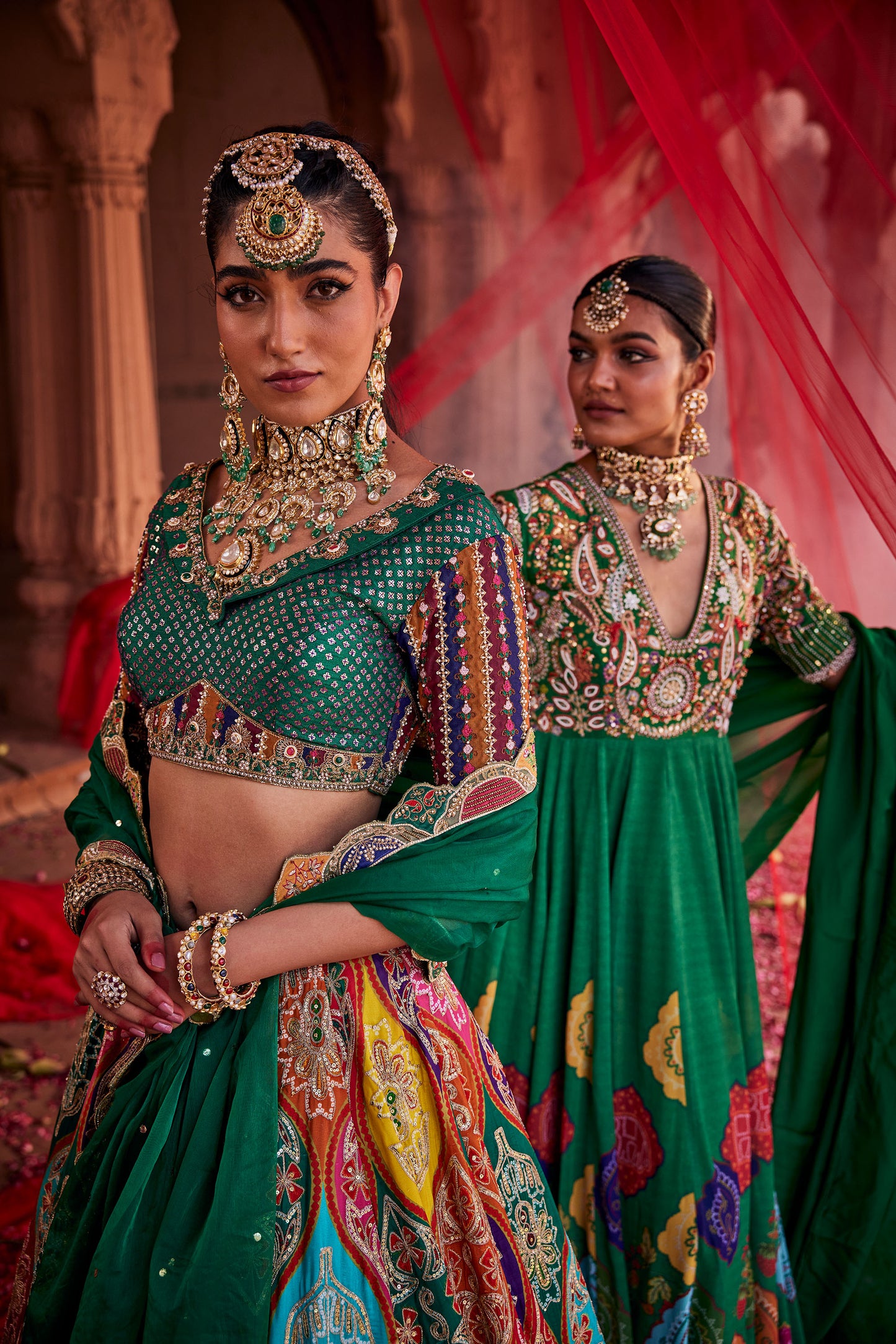 The Pine Green Gharchola Lehenga Set is a charmingly traditional ensemble that pays homage to the rich cultural heritage of India. Featuring a gharchola-style skirt and an intricately embroidered blouse, this set is a beautiful combination of traditional artistry and contemporary design. The rich green color and the detailed embroidery details are sure to make any woman feel like a queen.