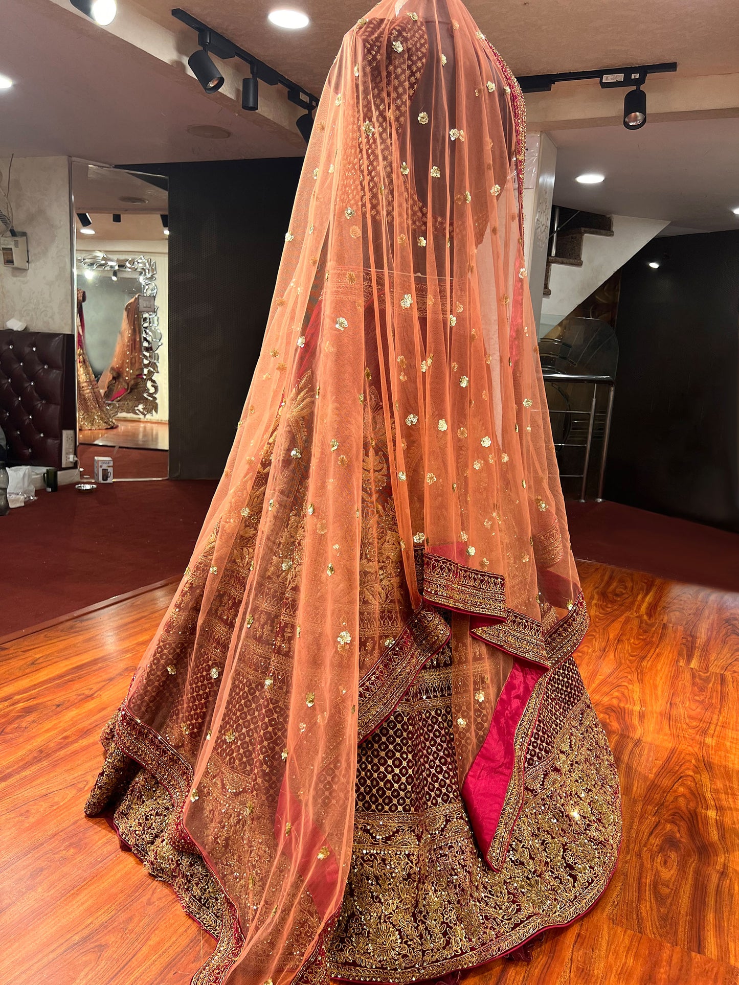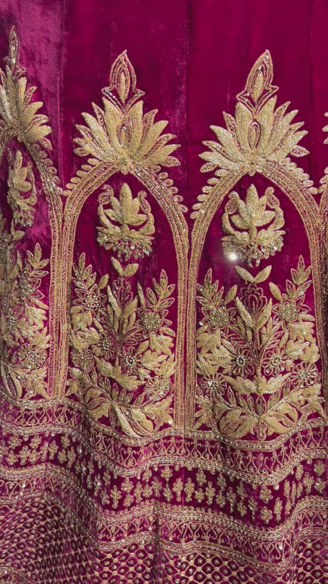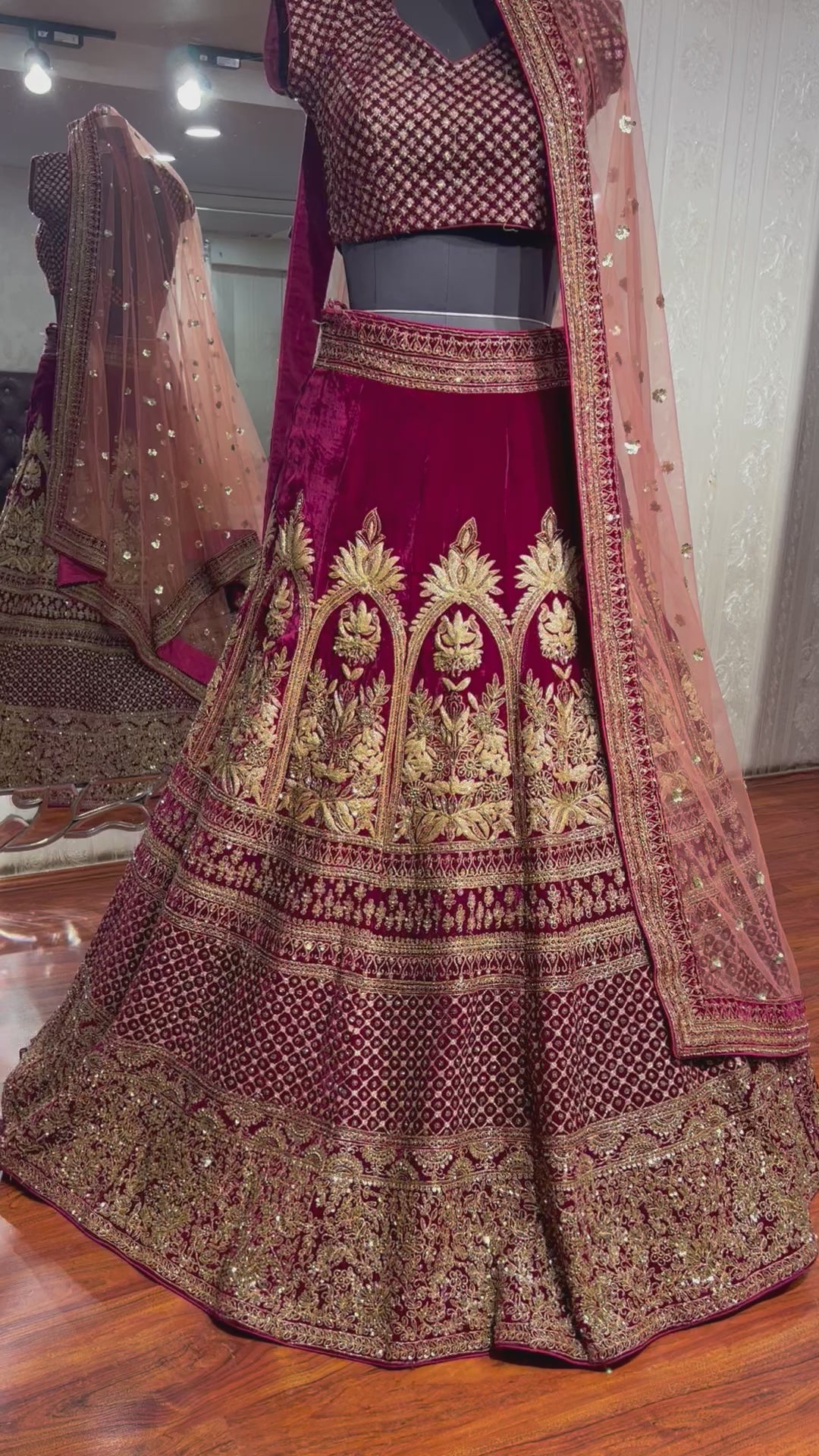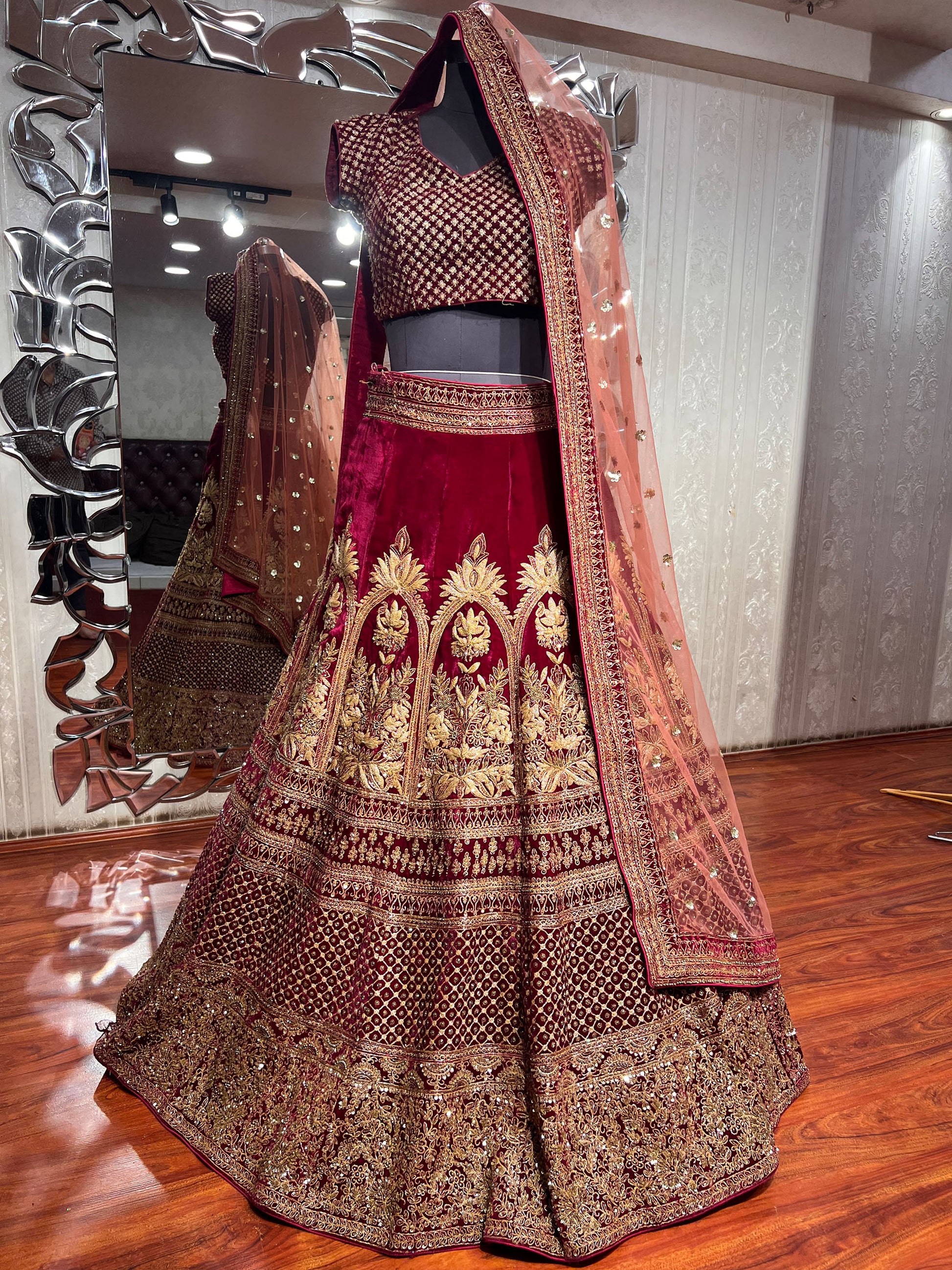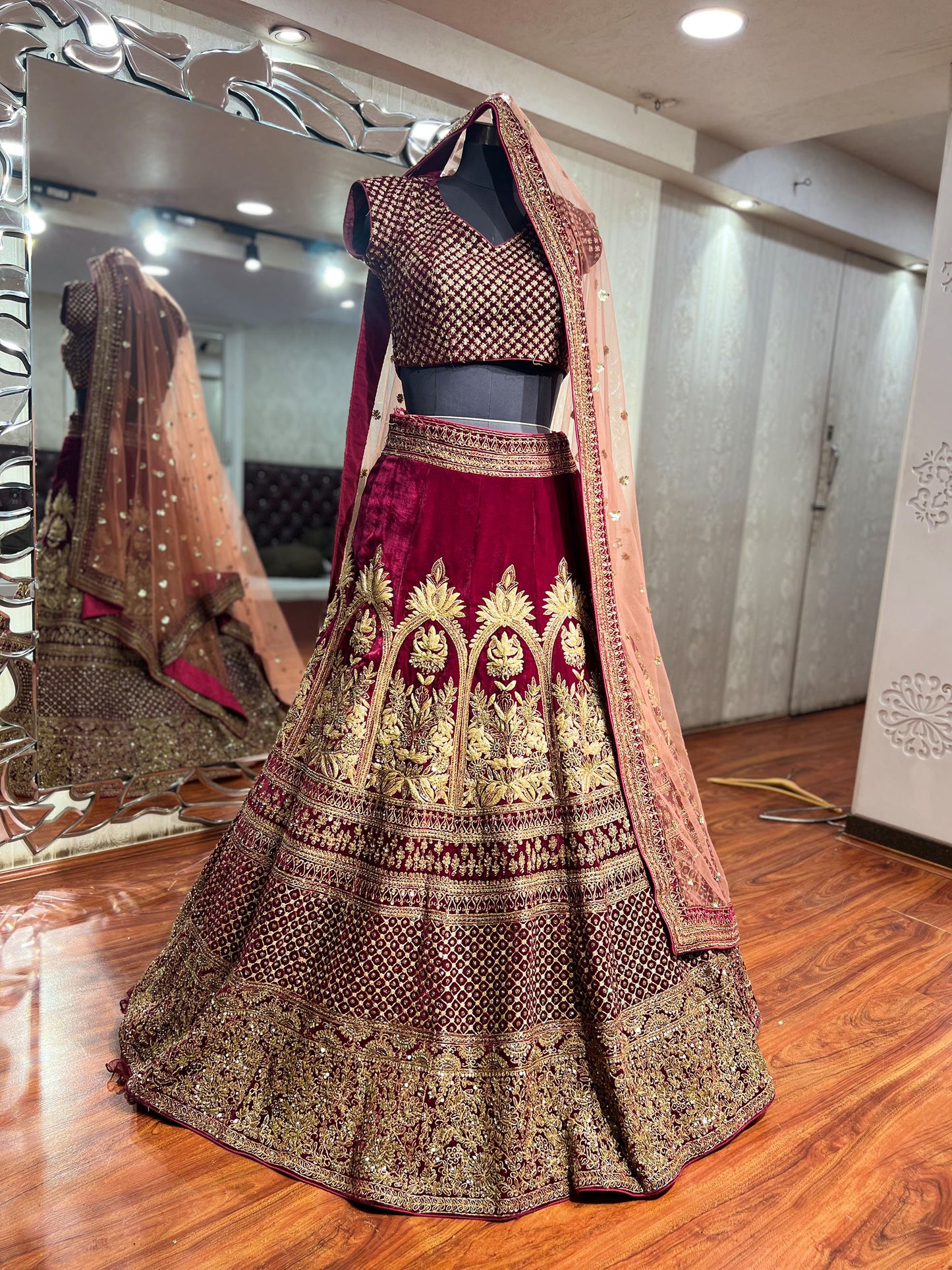 Rose Red Hand Embroidered Micro Velvet antique style Bridal Lehenga