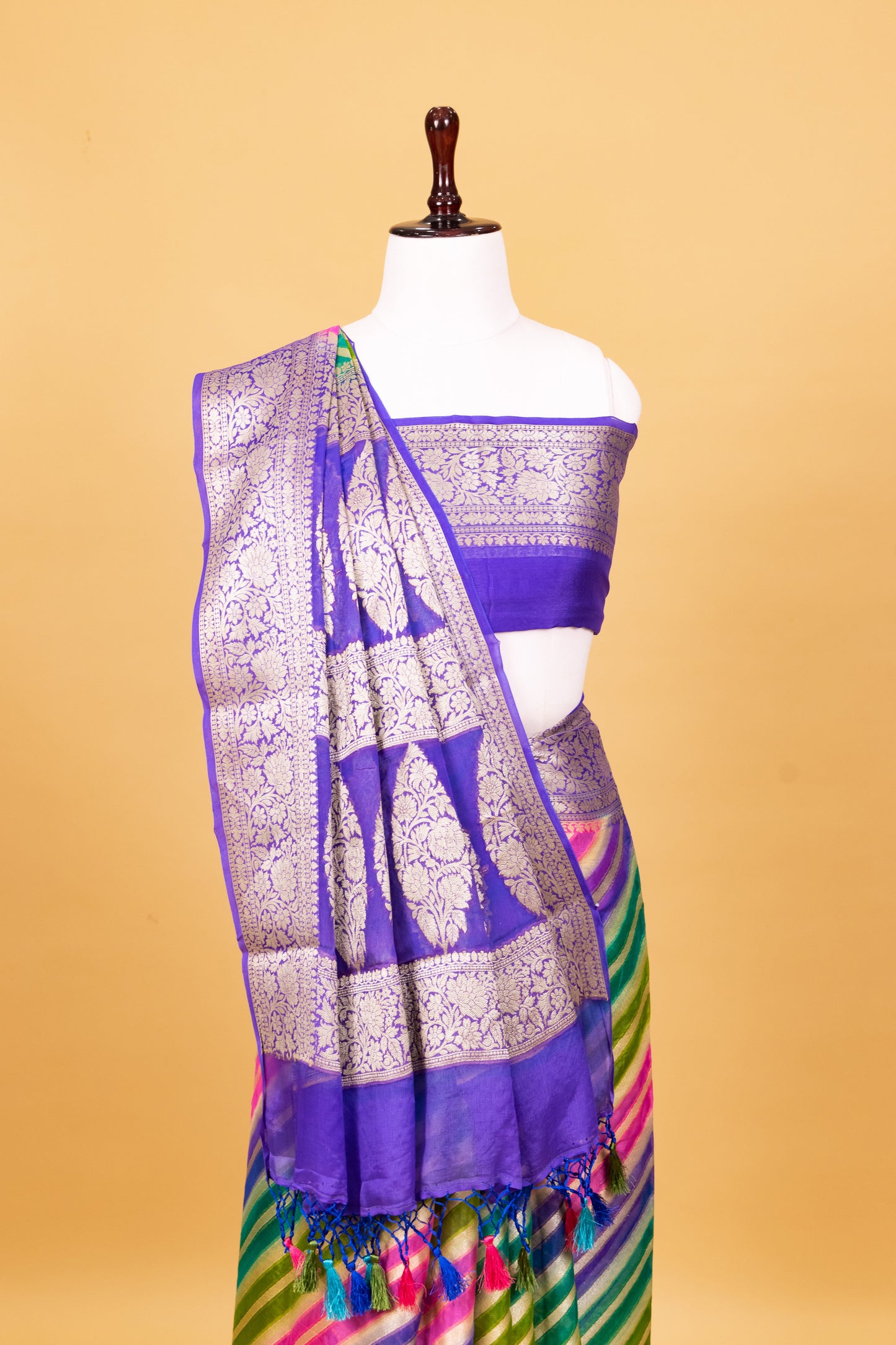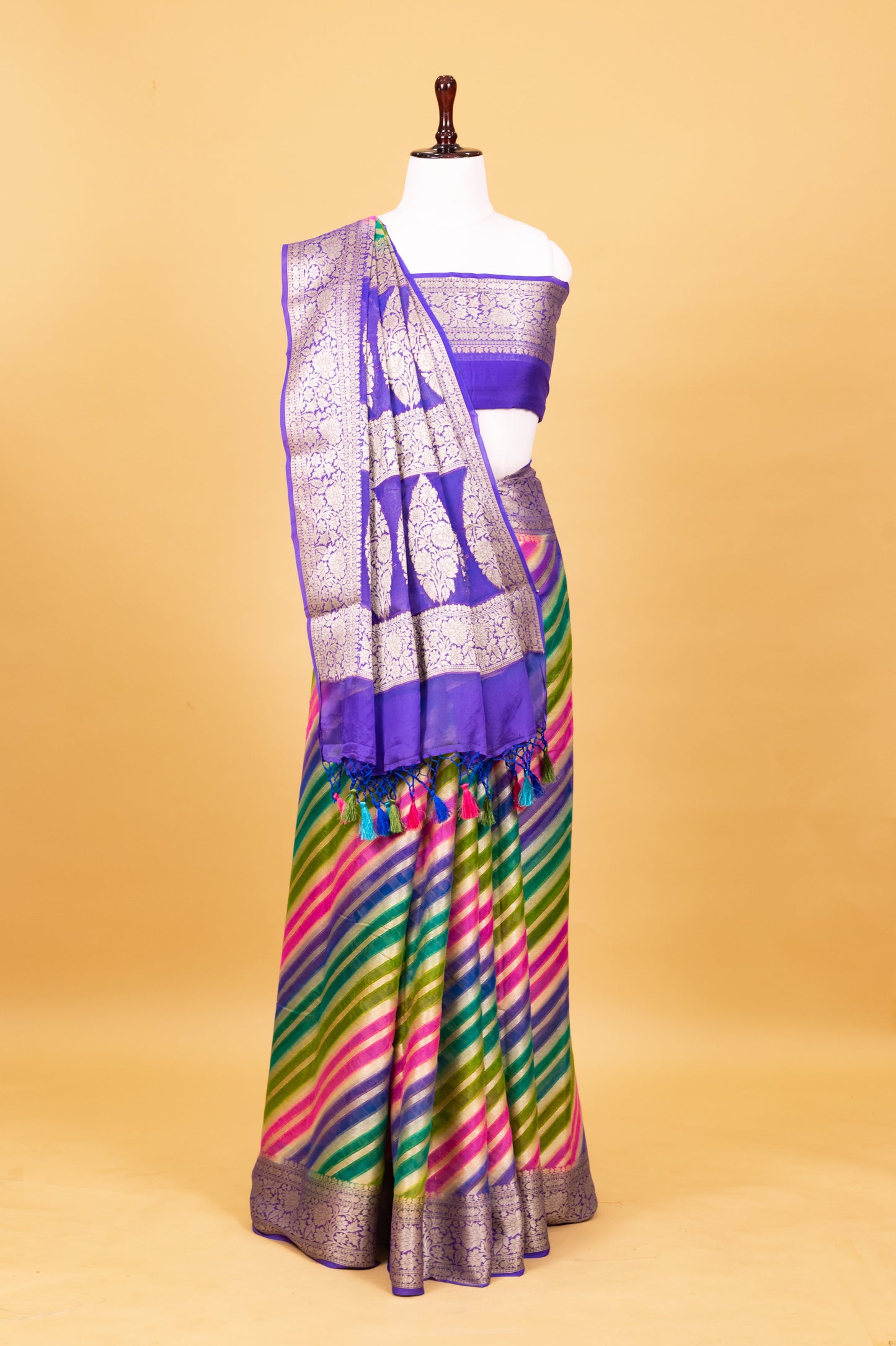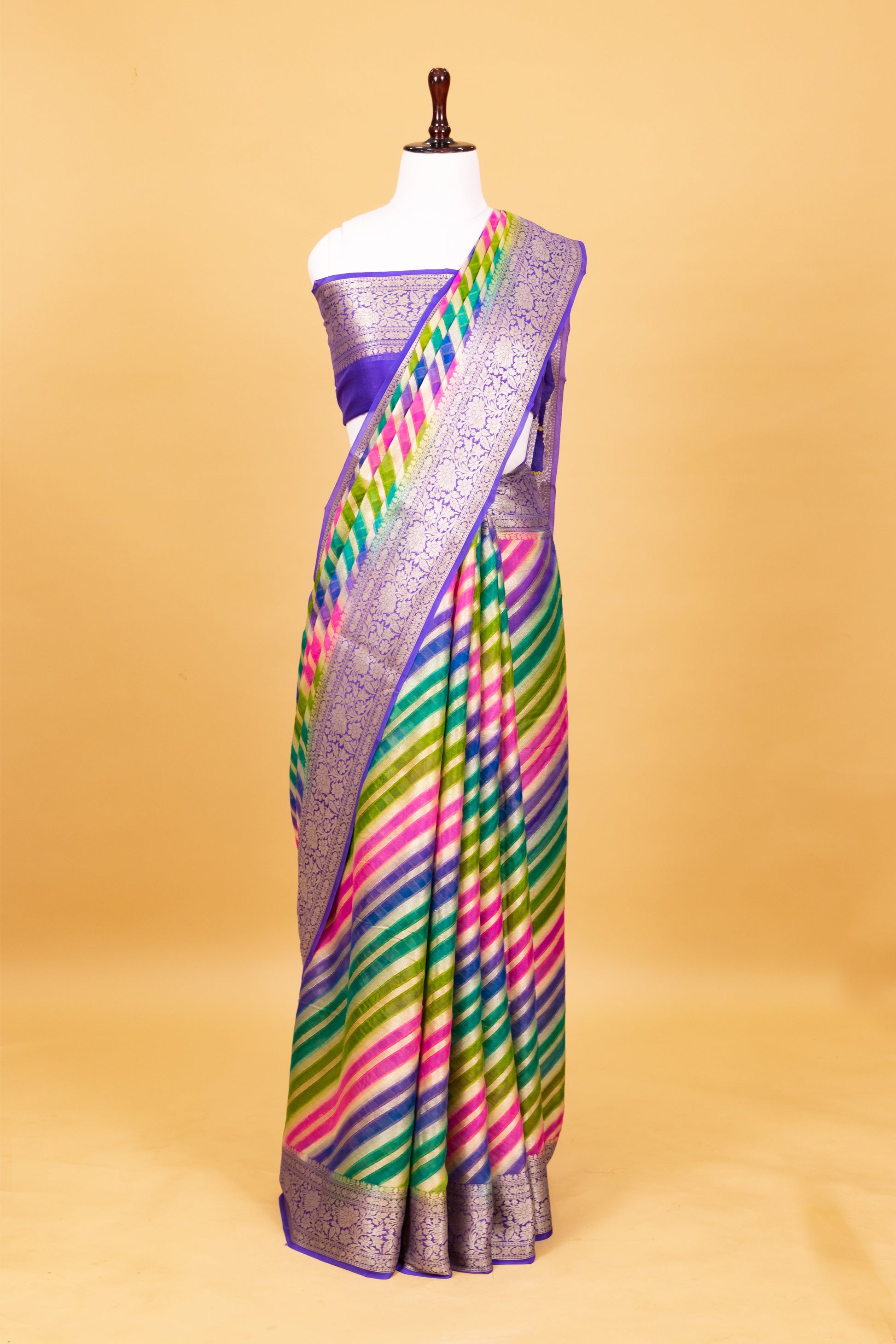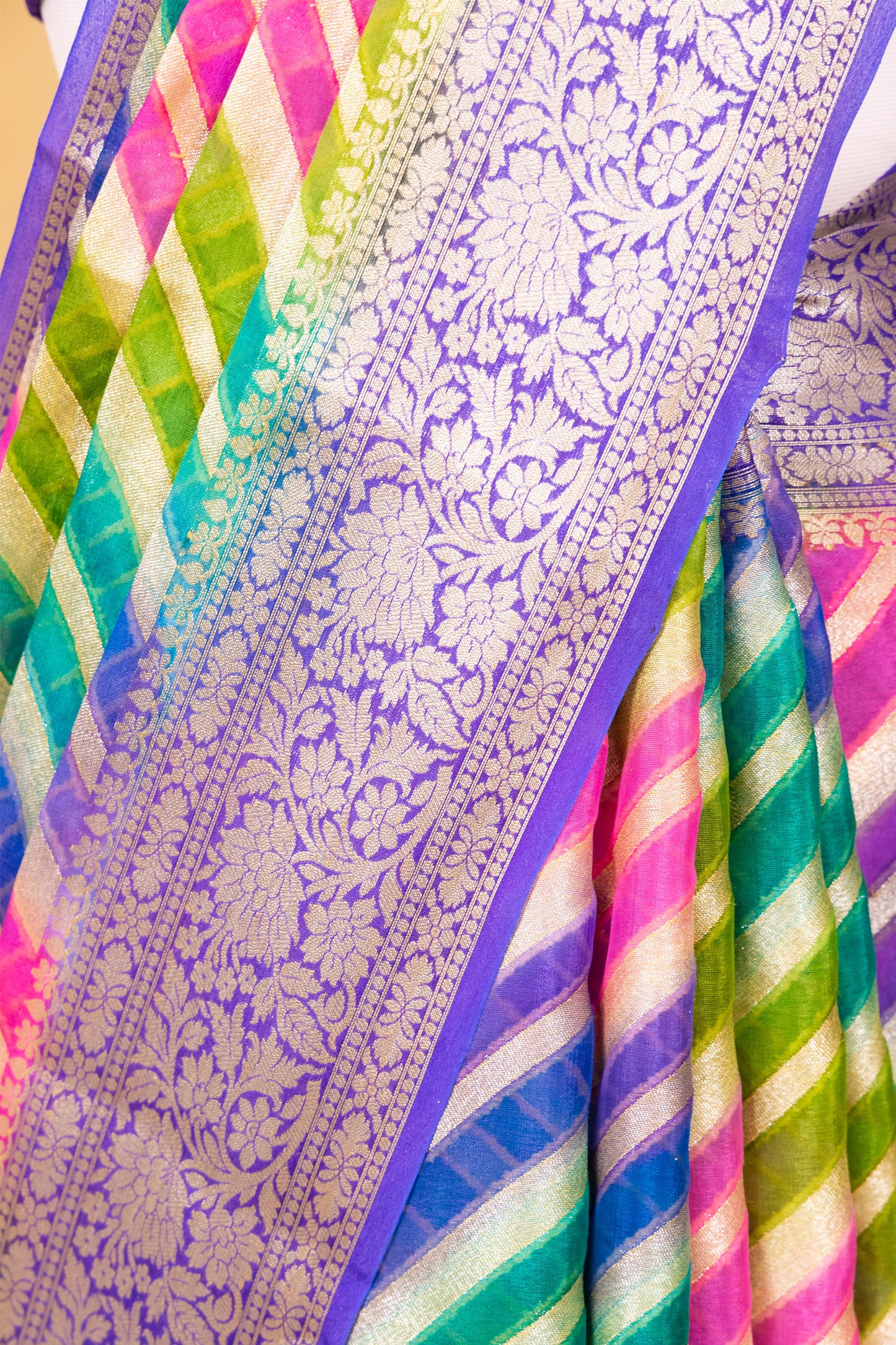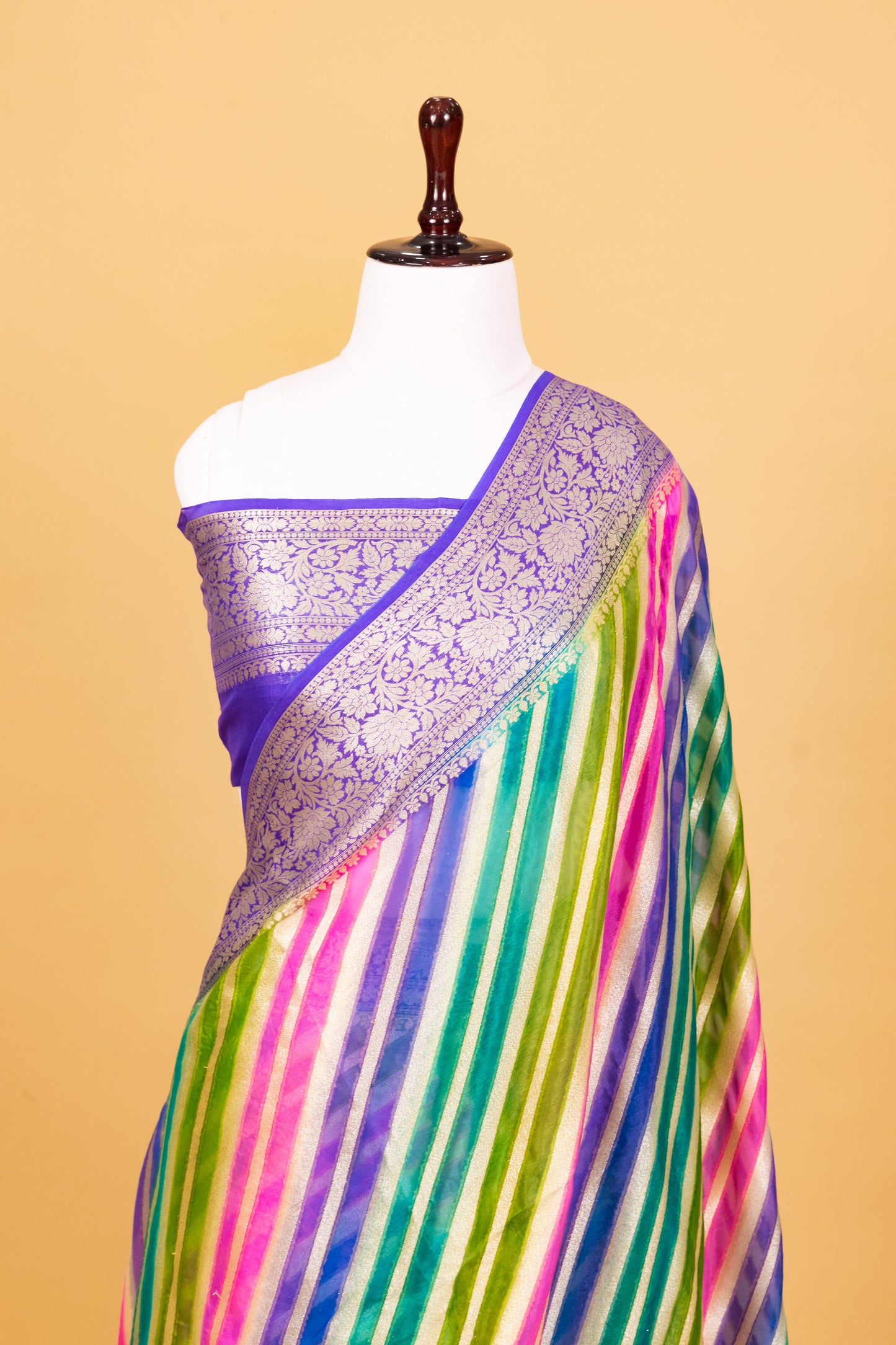 - Description: Banarasi Chiffon Sari with Diagonal pattern and Multi color hand brush paint with Gold zari Border and Aachal