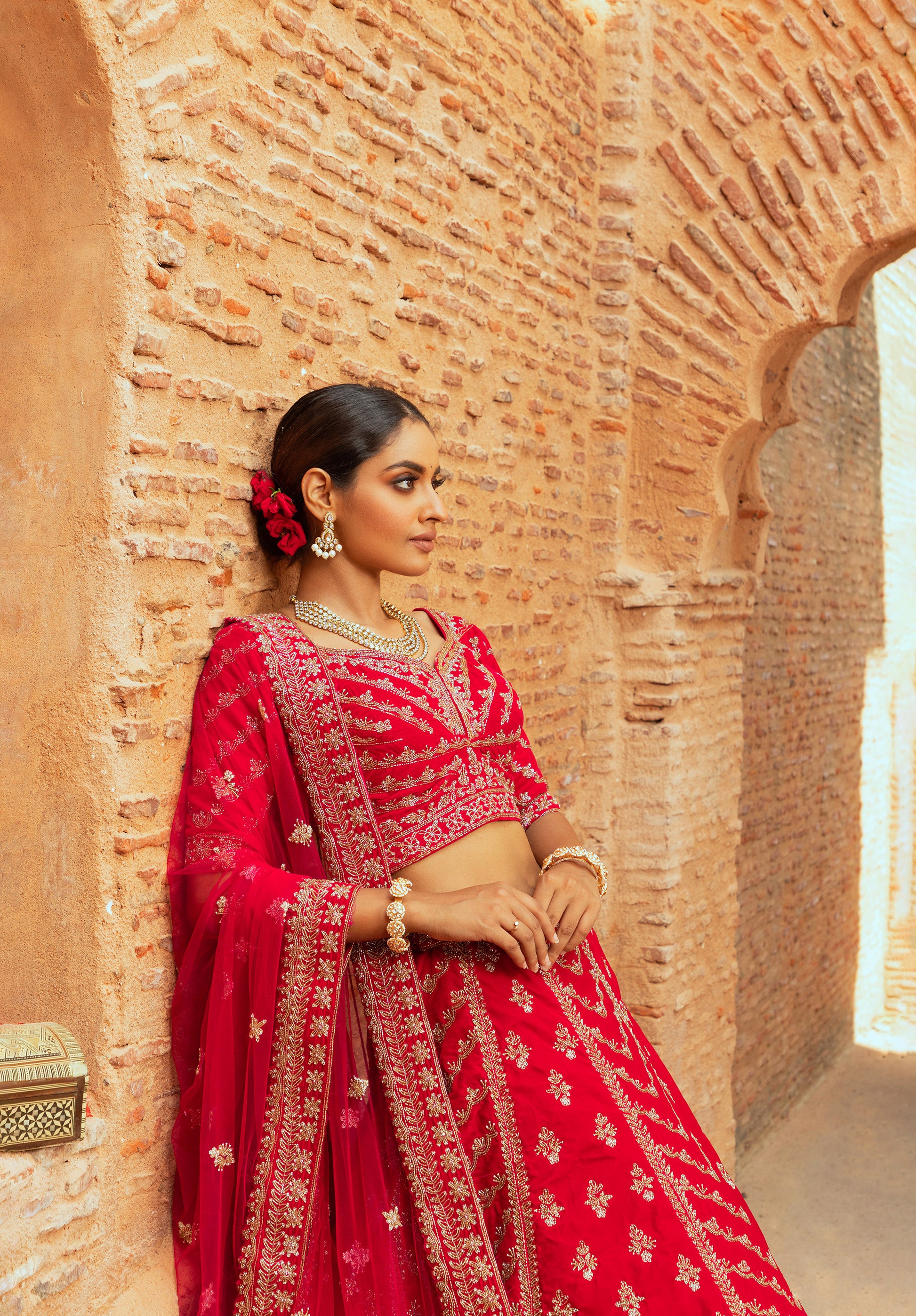 A Silk Tale with Floral Flourish! This regal red bridal lehenga, crafted from silk, showcases intricate floral motifs, shimmering sequins, and meticulous cutdana work. The ensemble is elegantly complemented by a delicate net dupatta, enhancing the bride's royal elegance.