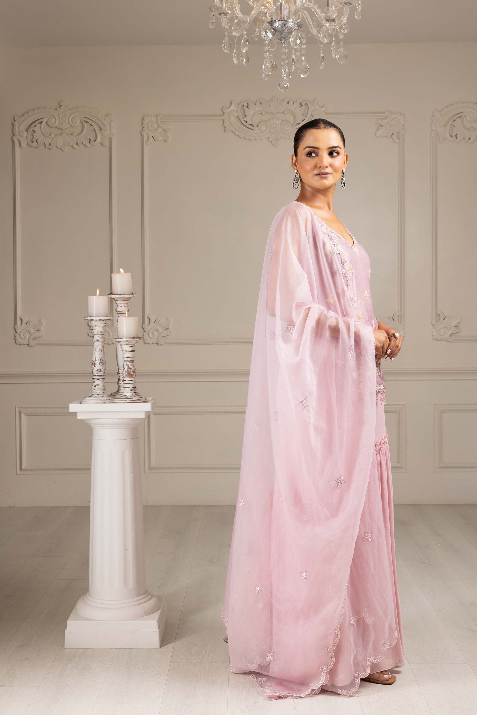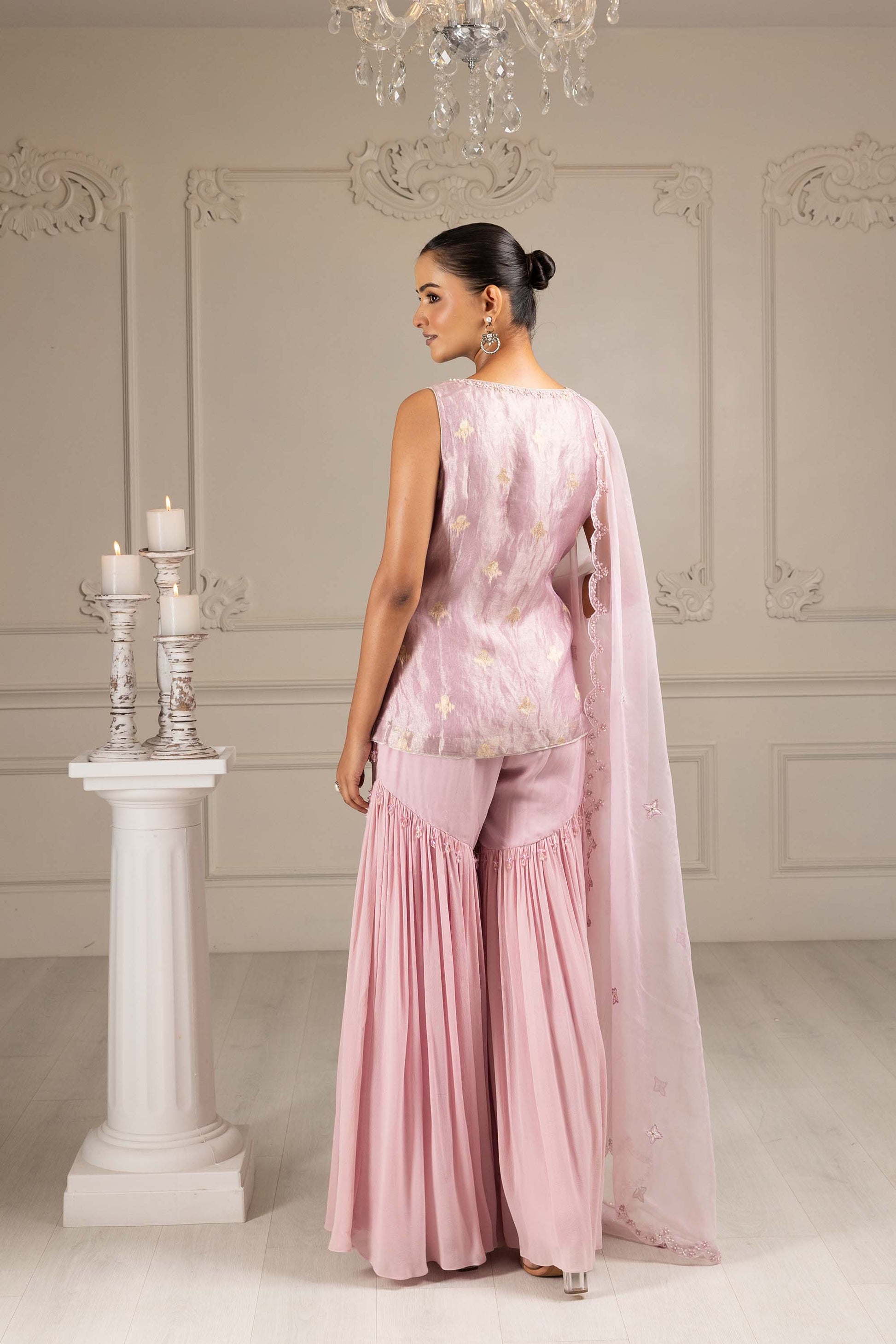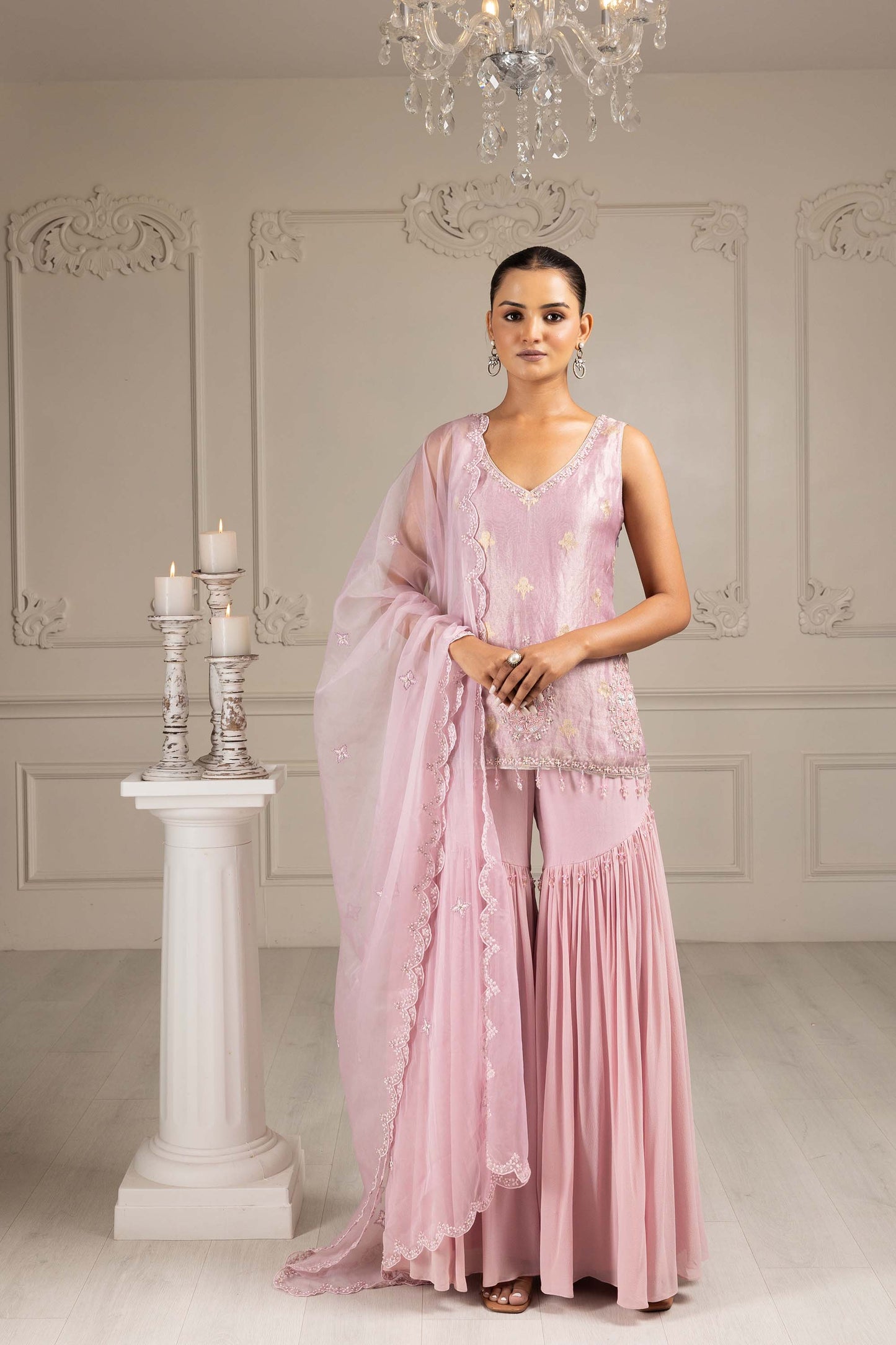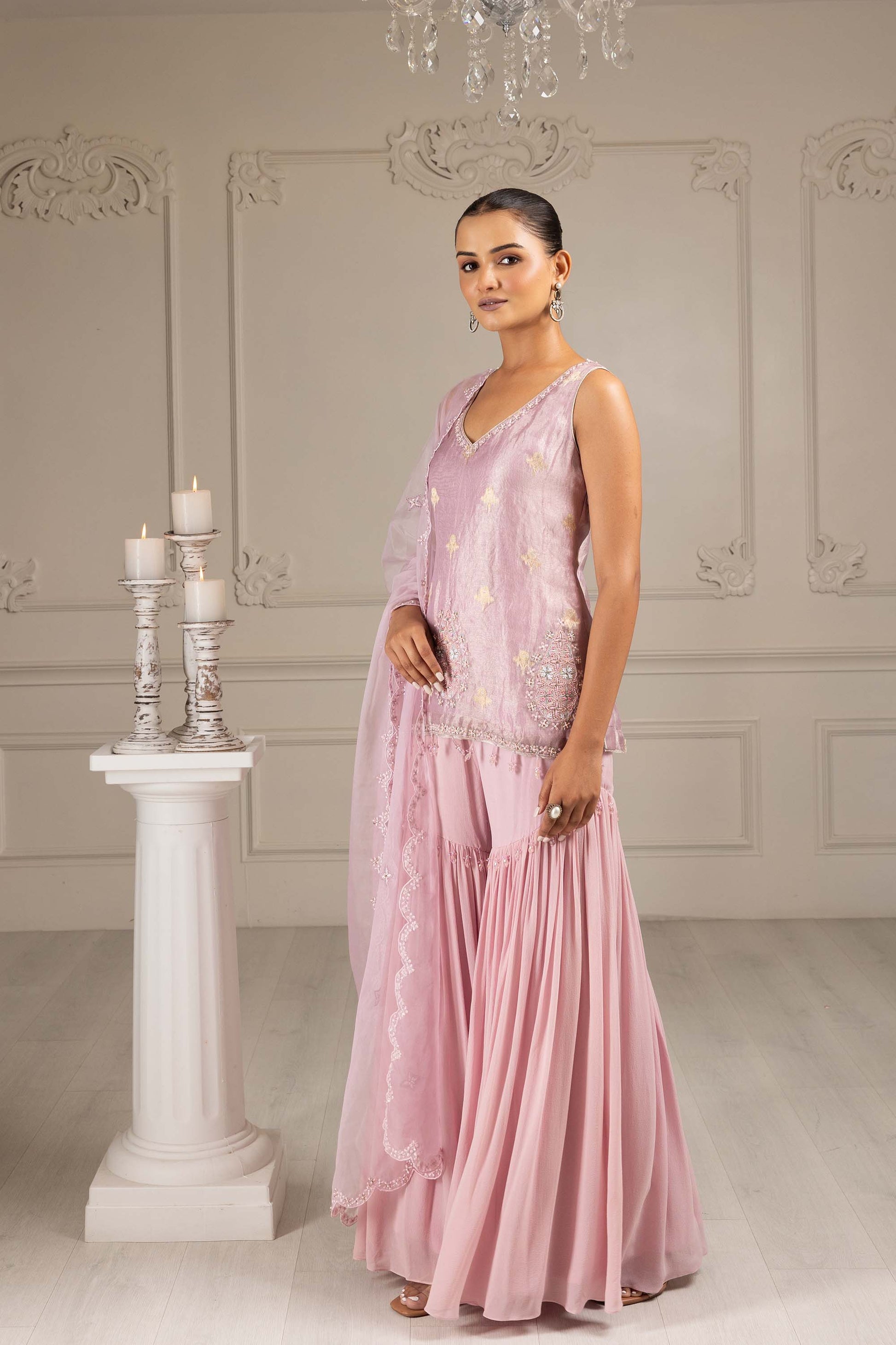 Featuring Lilac banaras organza embroidered kurta with georgette sharara and embroidered organza dupatta