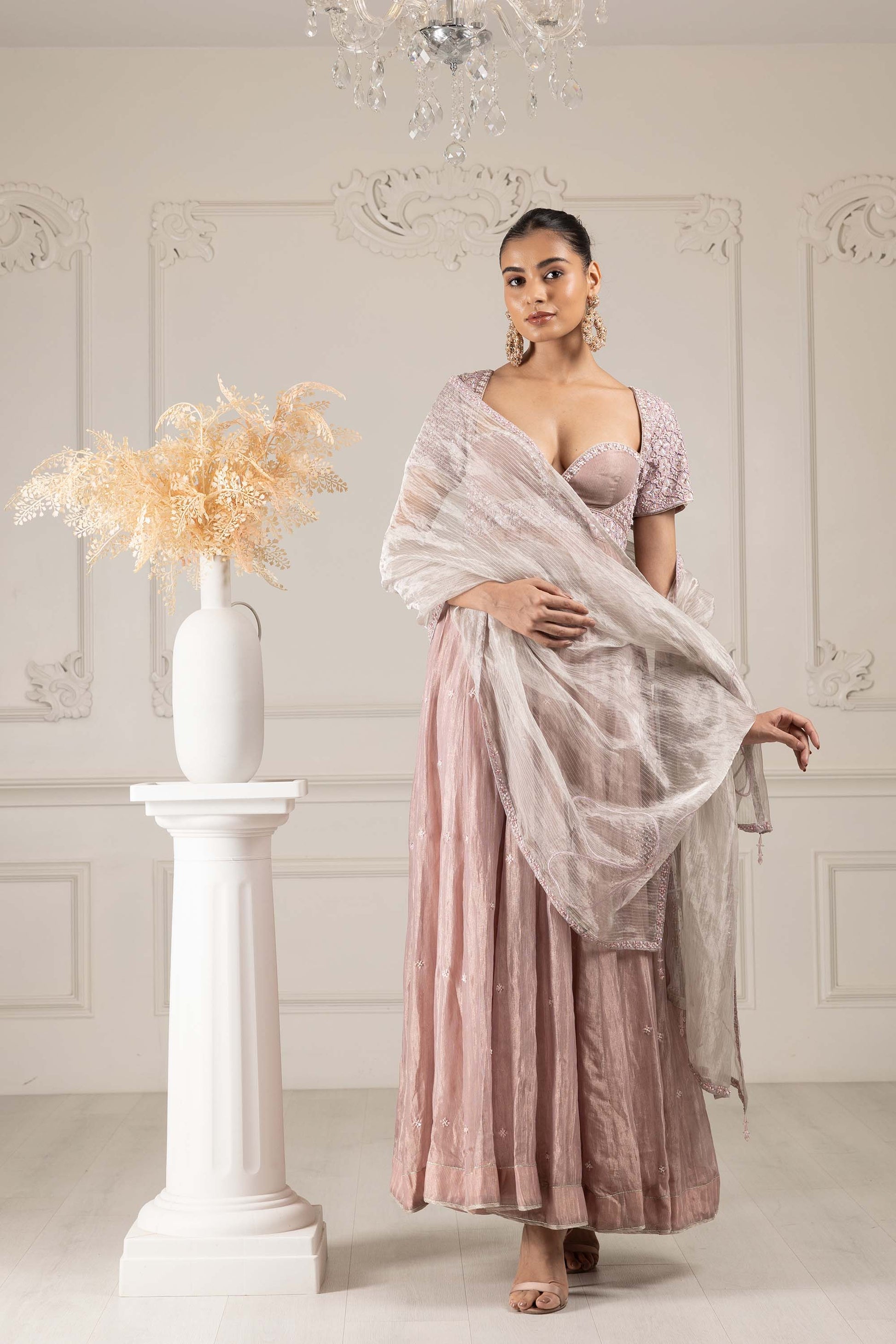 Featuring Tea green banarasi organza embroidered Anarkali with straight crepe pant and embroidered organza dupatta