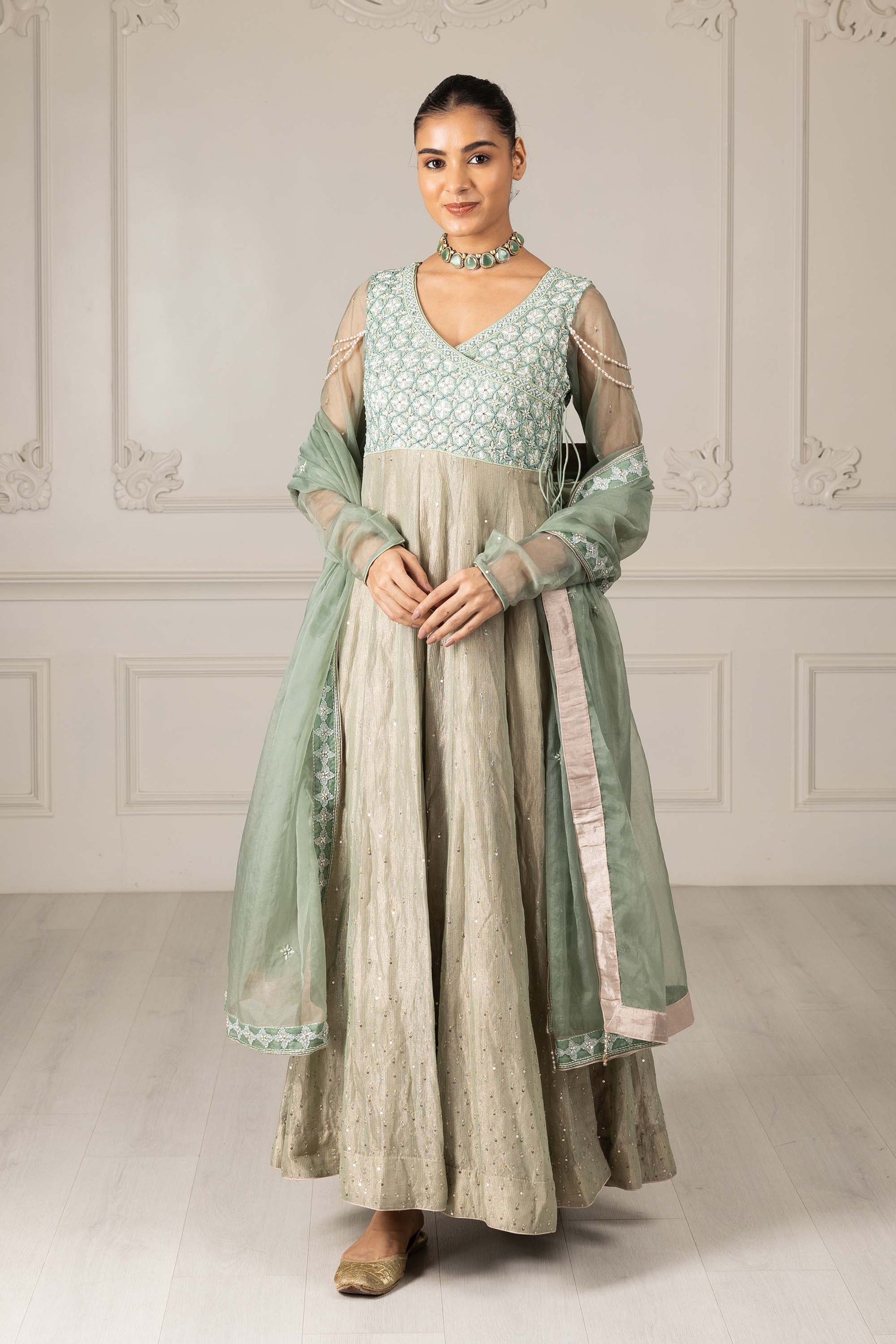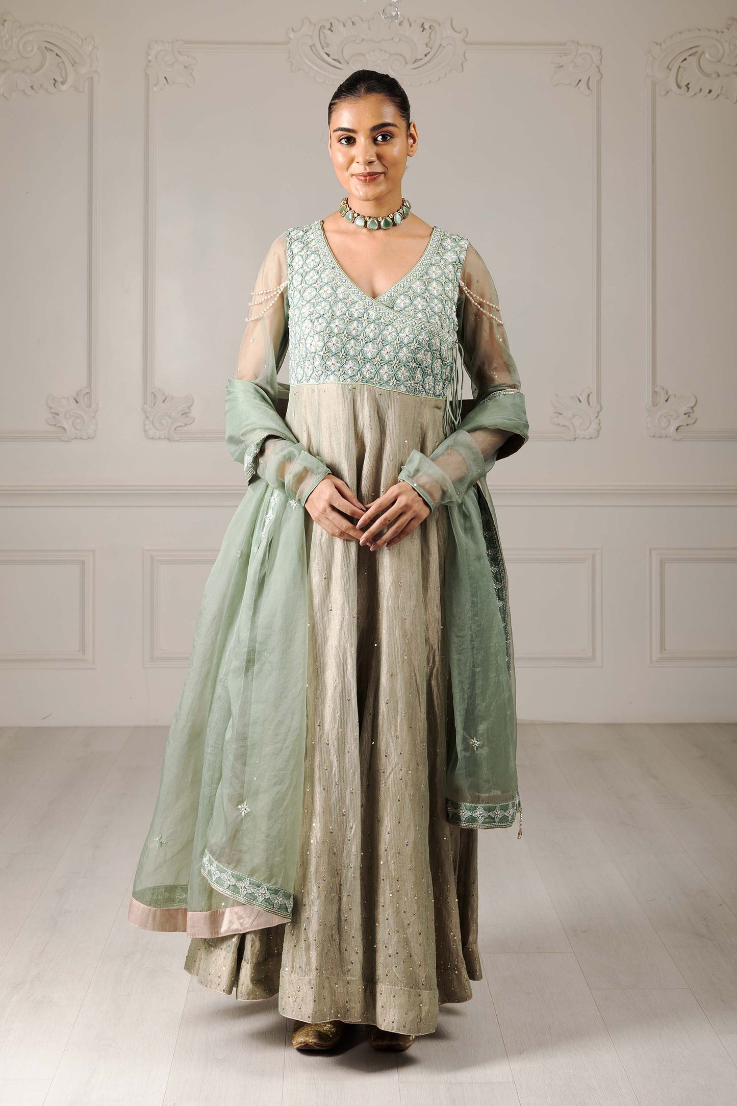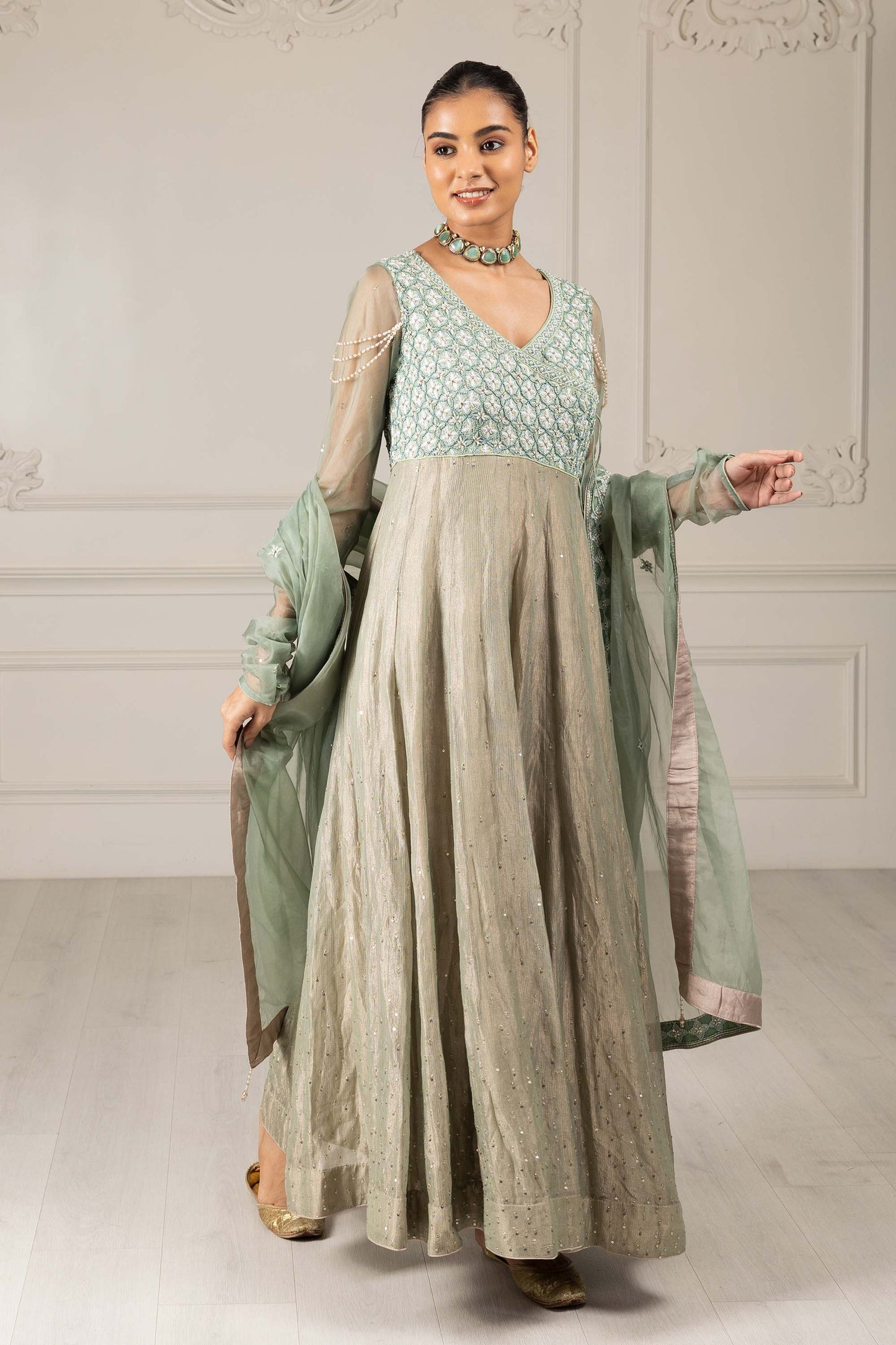 Featuring Tea green banarasi organza embroidered Anarkali with straight crepe pant and embroidered organza dupatta