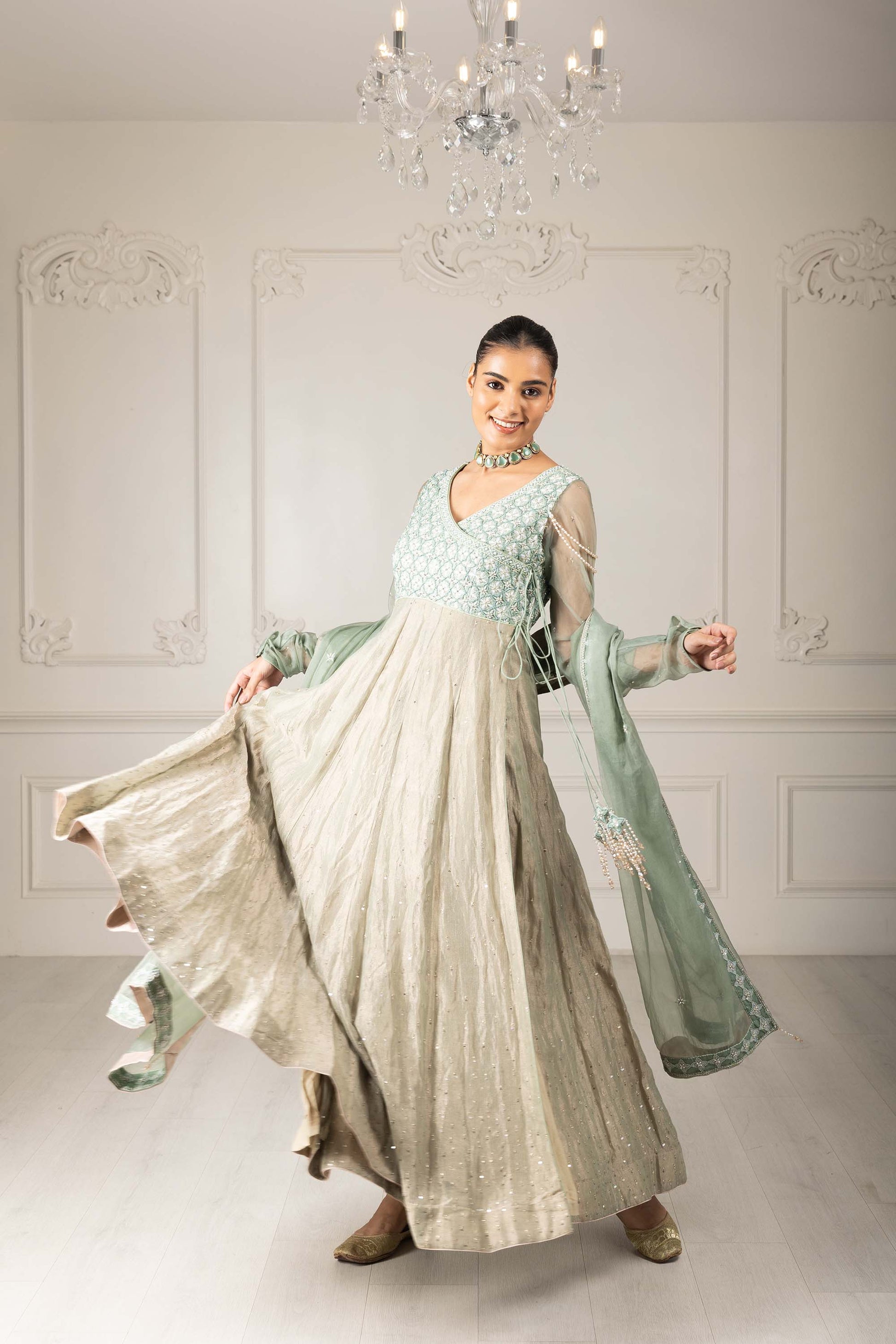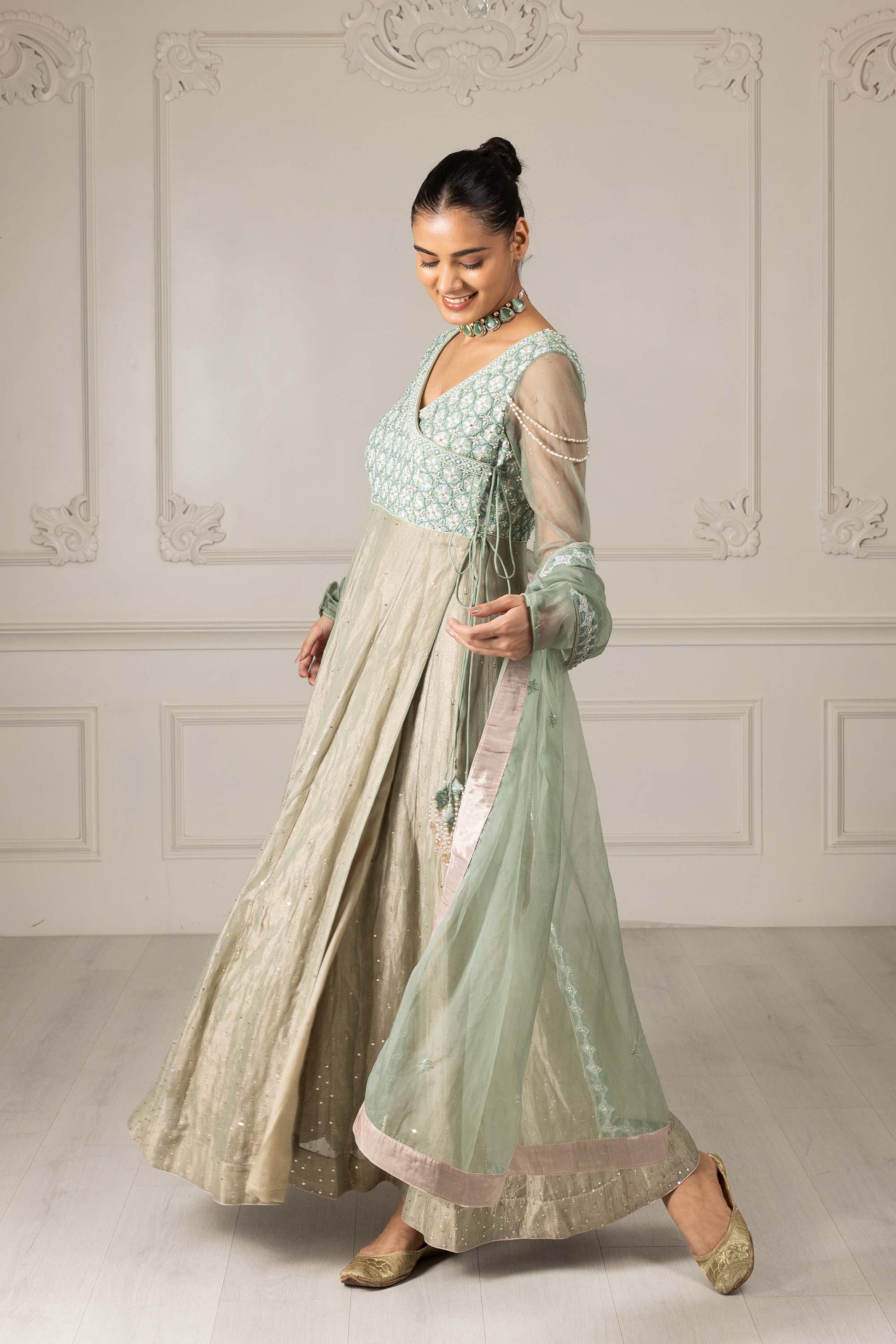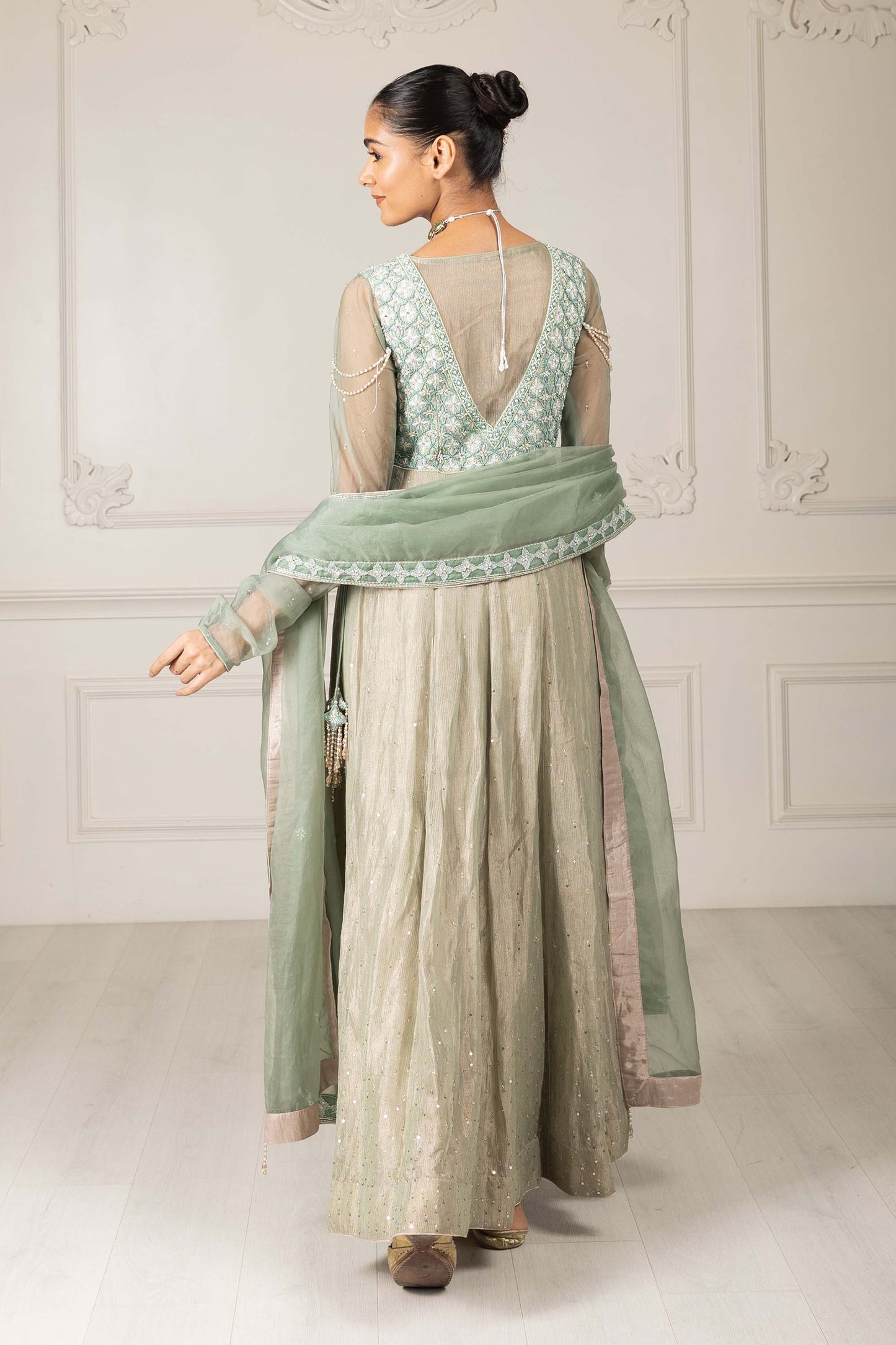 Featuring Tea green banarasi organza embroidered Anarkali with straight crepe pant and embroidered organza dupatta