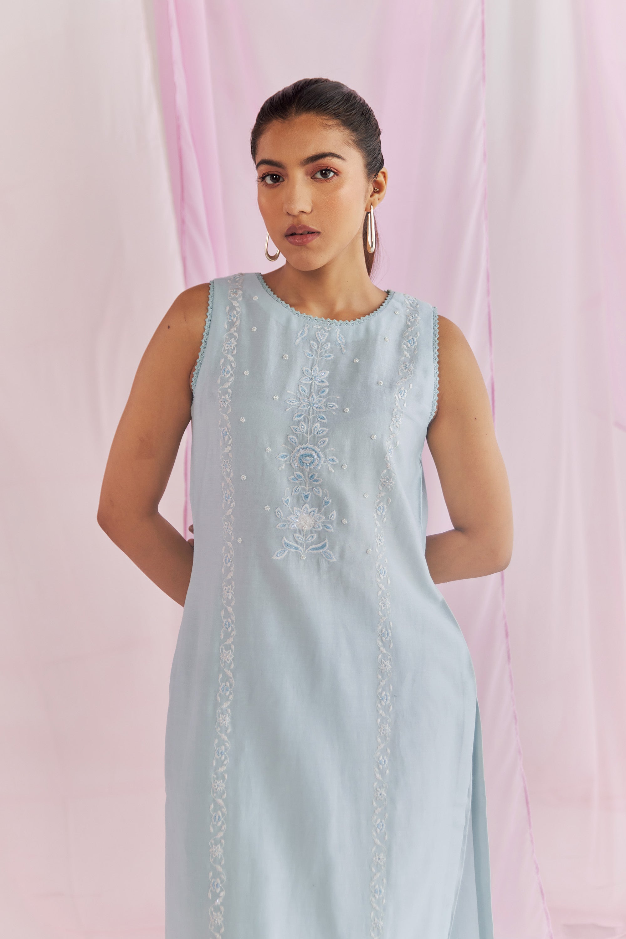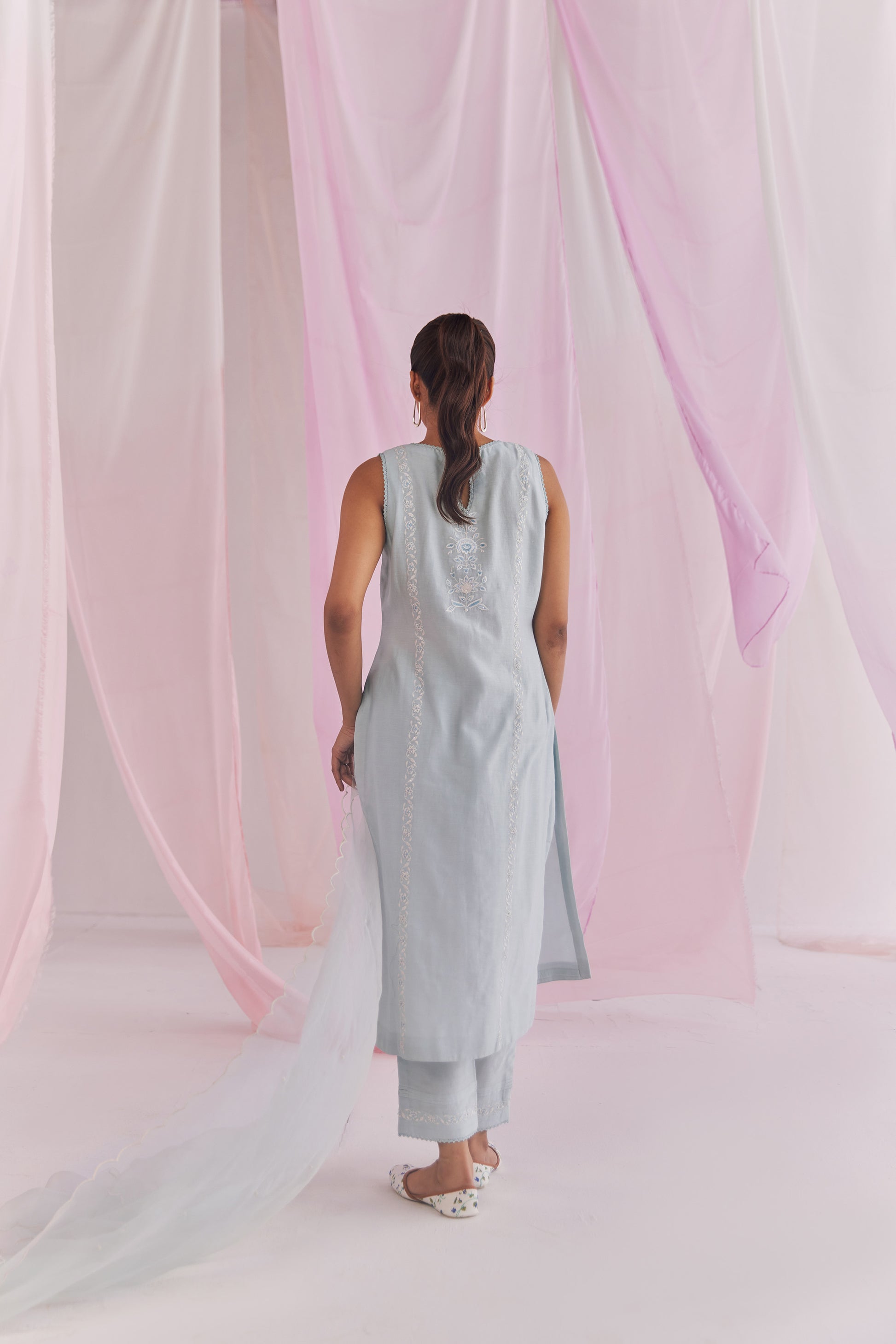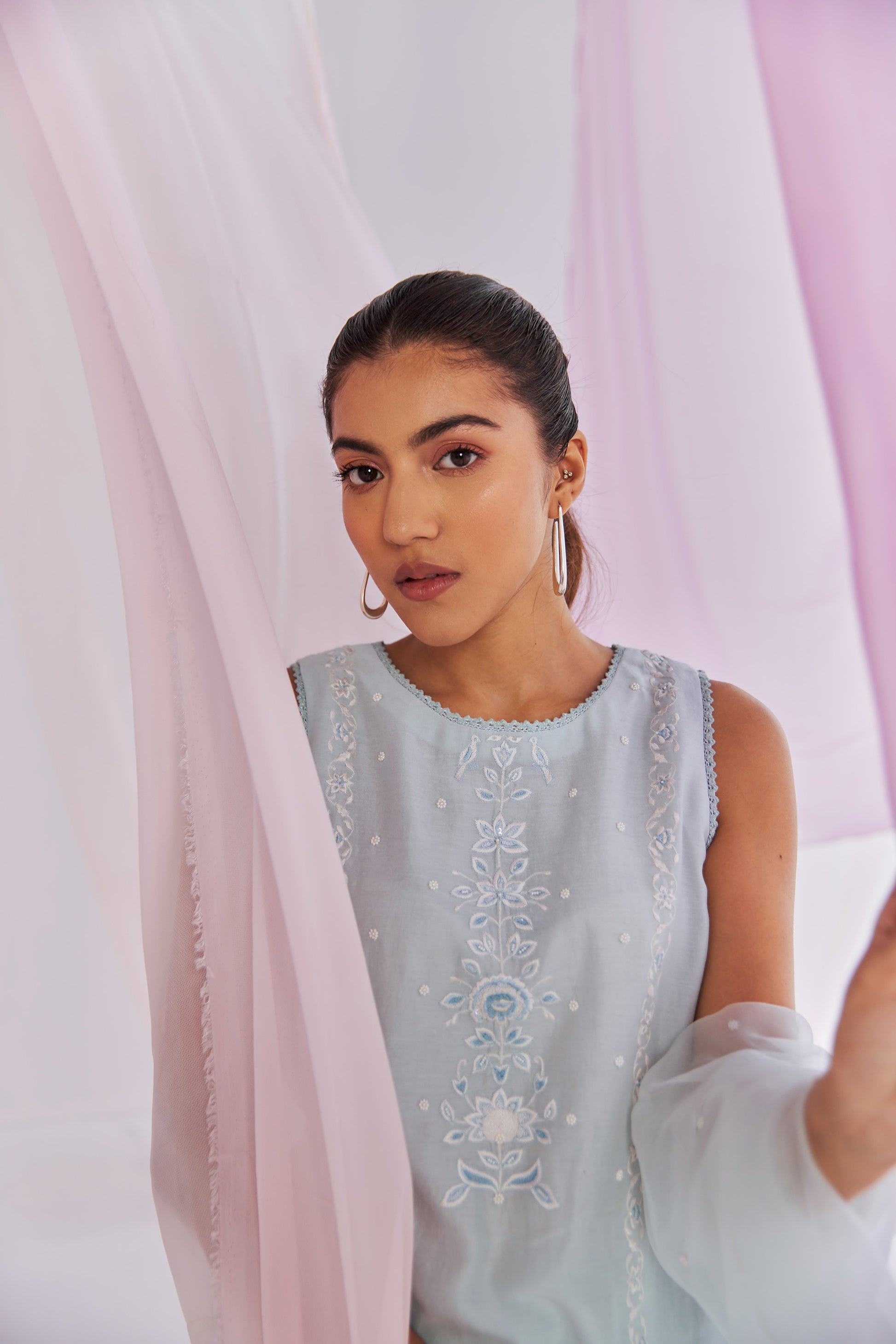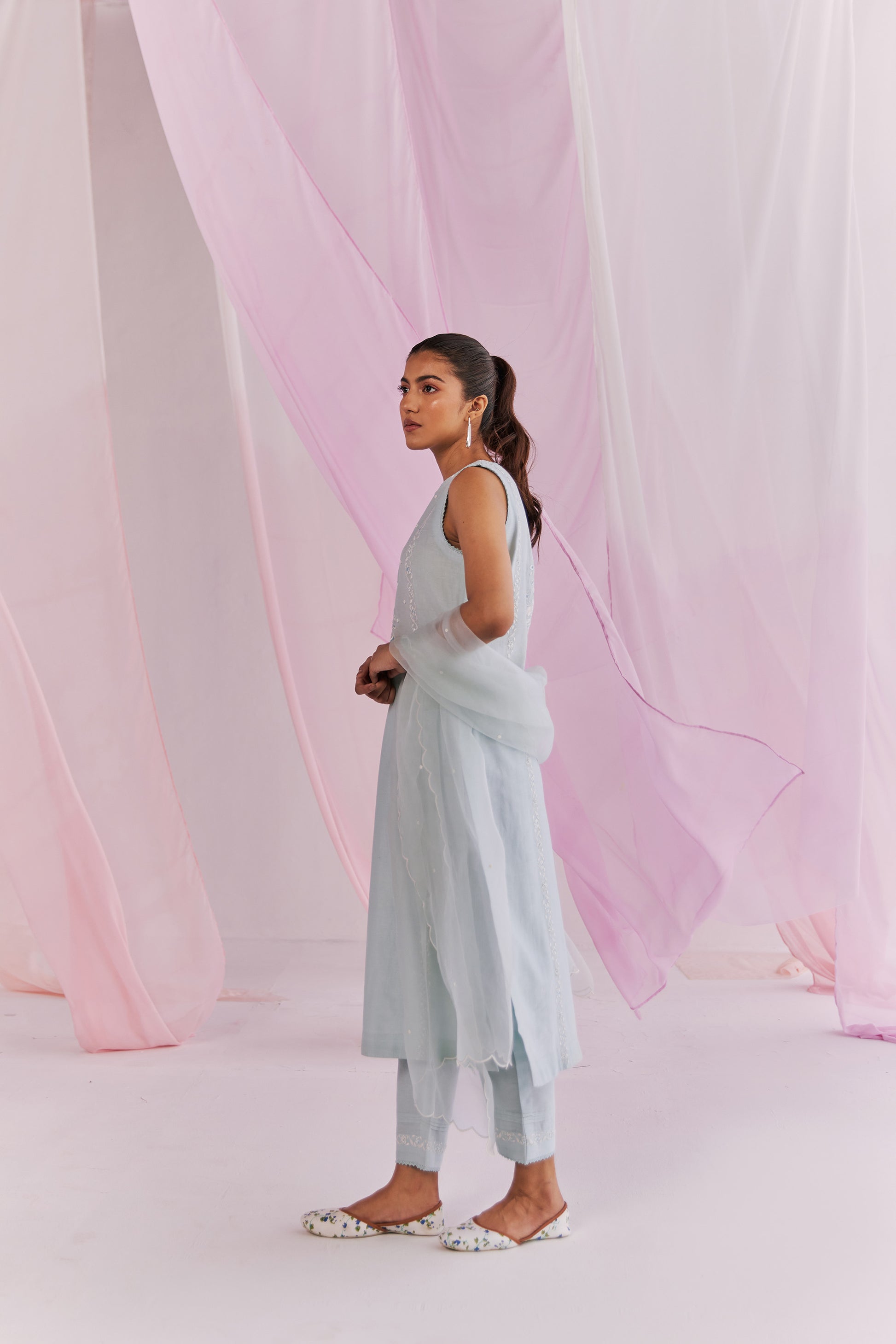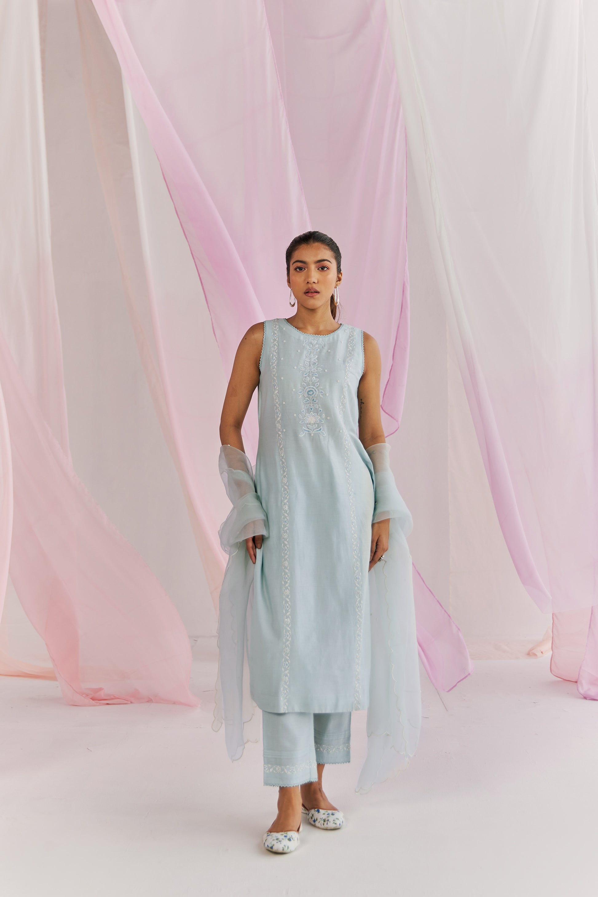 SAFI KURTA SET - Featuring a Blue halter neck kurta in Silk Chanderi base with Resham embroidery and pearl embellishments. Paired with matching pants and Silk Organza Scallop Dupatta.