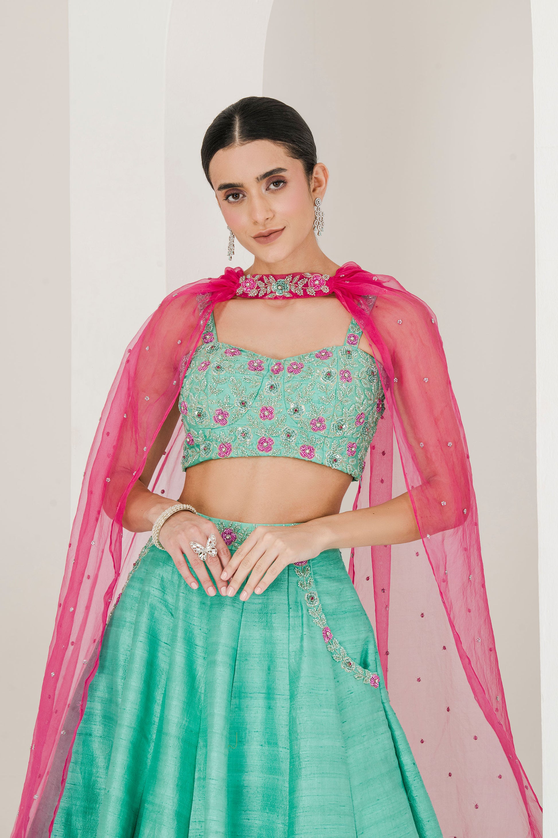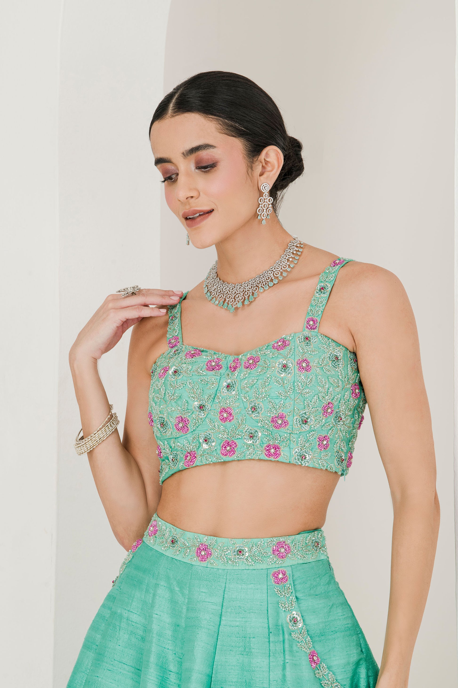 Indulge in the irresistible allure of our sea green lehenga choli set meticulously crafted for mehendi and sangeet festivities. This opulent ensemble boasts a raw silk base adorned with exquisite pink glass beads and sequins embroidery. Complete with a stunning pocket embroidered lehenga a beautifully designed bustier style choli and a choker style dupatta.