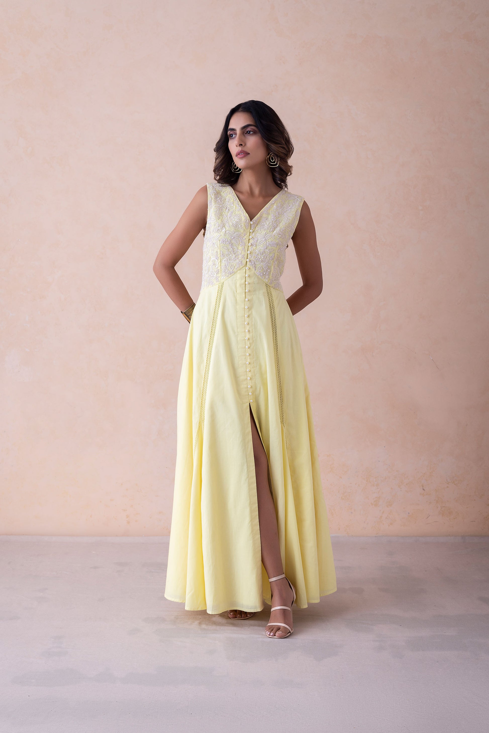 Lime Cotton Dress with Dori Work, Hand Embroidery, and Attachable SleevesThis lime-colored cotton dress features a fitted bodice with delicate dori work and hand embroidery. A graceful flare adds movement, while attachable sleeves offer styling versatility. Lined with cambric for comfort.Product Type: DressPattern: Dori Work with Hand EmbellishmentsLength: Floor-LengthClosure: Side ZipLining: Fully Lined with Cambric