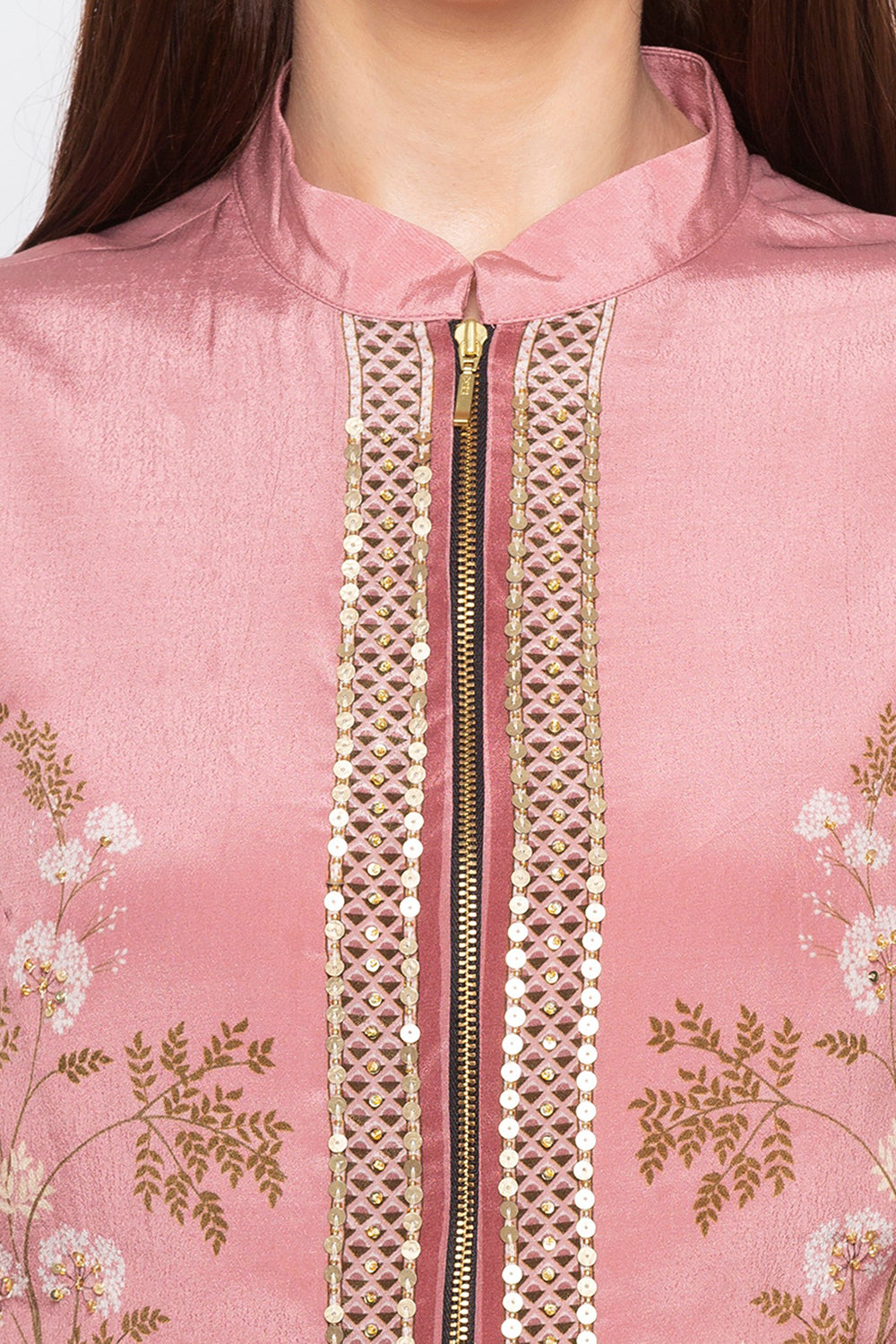 Pink Windance Printed Drape Skirt With Embroidered Jacket In Crepe