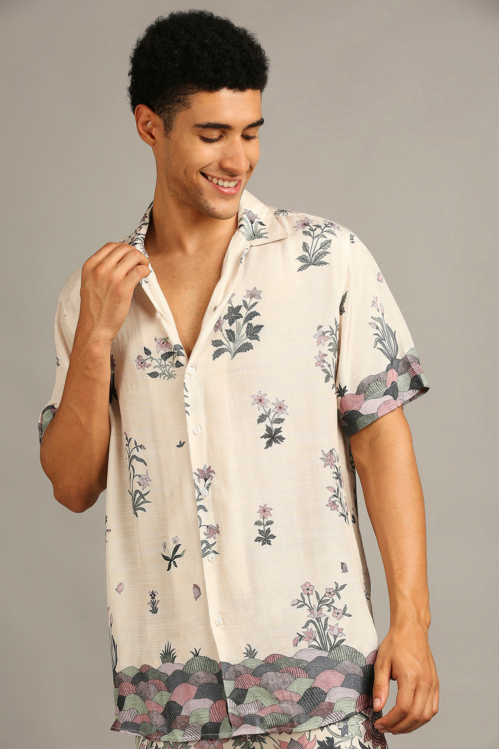 Beige Pastel Floral Printed Shirt In Muslin Slub With Shorts In Twill