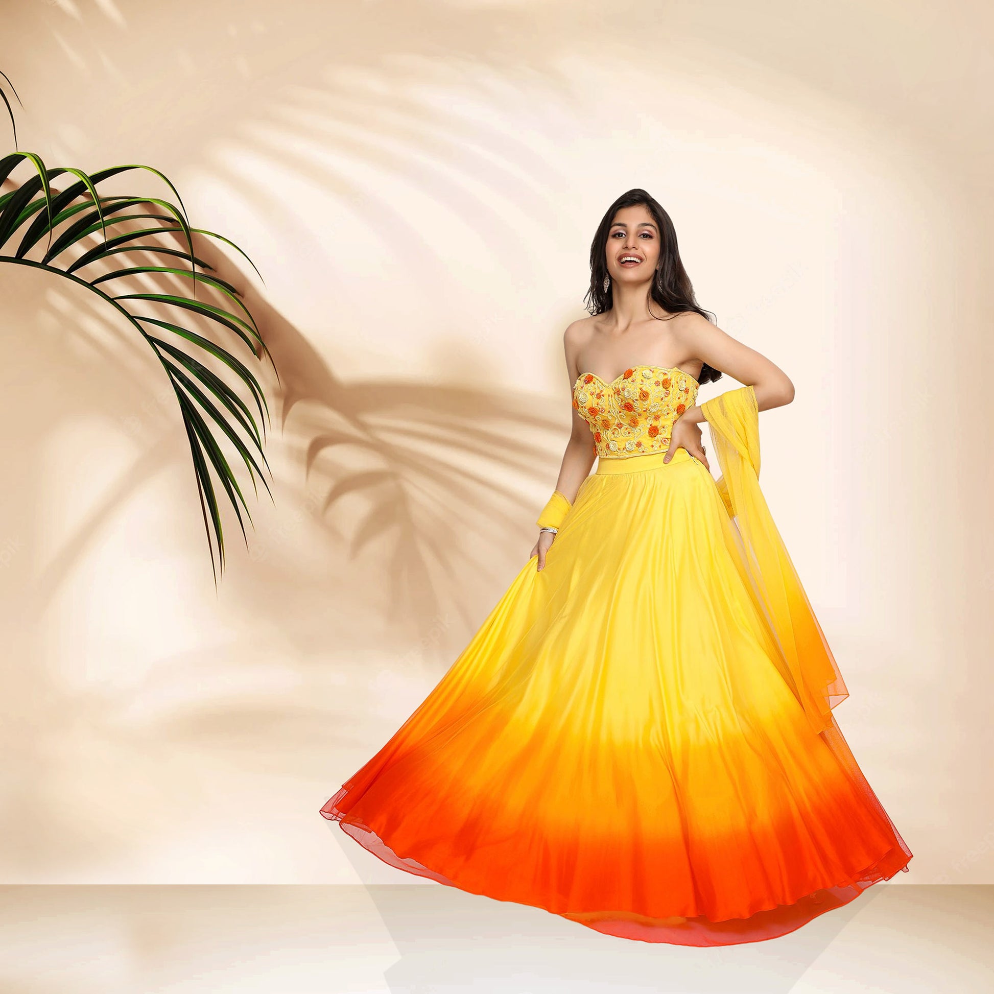 Yellow sunset inspired ombre lehenga features a corset blouse with 3d flowers, resham, cut dana embroidery. Dupatta has ombre hues matching the lehenga
