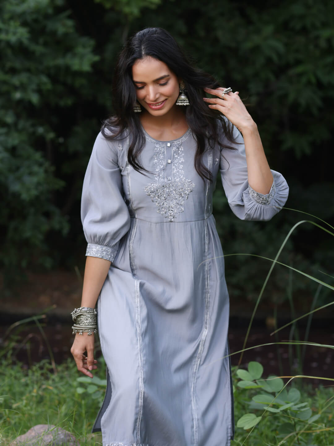 Surmai - Grey Viscose Silk Kurta Set with Shaded Embroidery